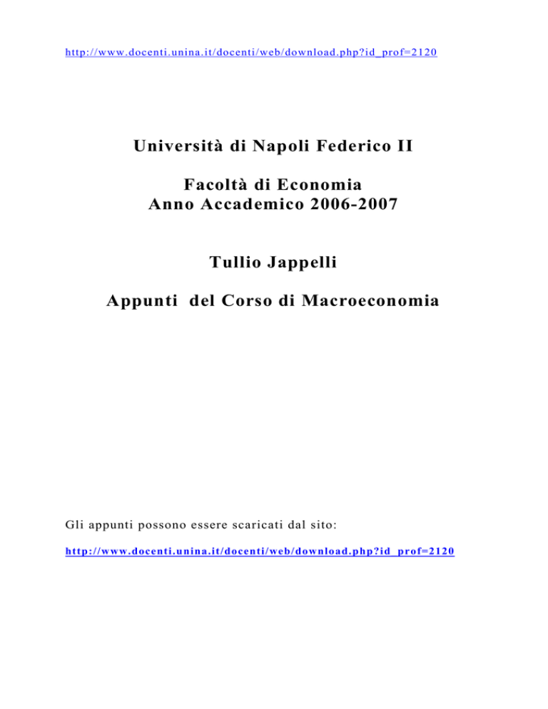 http://www.docenti.unina.it/docenti/web/download.php?id_prof=2120 Università di Napoli Federico II Facoltà di Economia Anno Accademico 2006-2007 Tullio Jappelli Appunti del Corso di Macroeconomia Gli appunti possono essere scaricati dal sito: http://www.docenti.unina.it/docenti/web/download.php?id_prof=2120 1. Introduzione alla macroeconomia Macroeconomia Studia il sistema economico considerandolo dal punto di vista delle variabili aggregate (produzione e reddito, consumo, investimenti, inflazione, disoccupazione, tassi di interesse, tassi di cambio e bilancia dei pagamenti, disavanzo e debito del settore pubblico). Distinzione con la Microeconomia Studia il comportamento delle singole unità economiche (impresa, consumatore) e quello dei singoli mercati. La macro considera tutti i mercati simultaneamente. Scuole Classica: Il mercato, se sono rispettate alcune condizioni, possiede la capacità di collocarsi nella posizione di “ottimo”: dunque è preferibile che i mercati siano lasciati a sé stessi Keynesiana: Le autorità di politica economica possono e devono intervenire poiché il mercato non è in grado di garantire il raggiungimento dell’ “ottimo” Alcune importanti variabili macroeconomiche sono: 1. Prodotto Interno Lordo (PIL) reale e nominale. 2. Tasso di inflazione. 3. Tasso di disoccupazione. 4. Tasso di interesse. 5. Tasso di cambio. 2 PIL reale e PIL nominale Prodotto Interno Lordo (PIL): è il valore dei beni e servizi finali prodotti dall’economia in un dato periodo. Il PIL, essendo riferito ad un determinato lasso temporale, è una variabile di flusso. Vi sono due modi di esprimere il PIL • PIL nominale: PIL a prezzi correnti • PIL reale: PIL a prezzi costanti Esempio: PIL nominale e reale: due beni (X e Y) con prezzi correnti (P X e P Y ) Quantità 1999 Bene X Bene Y 10 6 2006 Bene X Bene Y 12 7 2006 Bene X Bene Y 12 7 Prezzo (euro) 4 10 PIL nominale 1996 Valore 5 12 PIL nominale 2006 4 10 PIL reale 2006 60 84 144 40 60 100 48 70 118 Per misurare il PIL in termini reali abbiamo bisogno di fissare dei prezzi di riferimento (anno base): scegliamo i prezzi del 1999 ed otteniamo il PIL 2006 a prezzi 1999. 3 Di quanto è aumentato il PIL nel periodo considerato, cioè dal 1999 al 2006? Il tasso di crescita di una variabile è la variazione percentuale di una variabile da un periodo all’altro. Se la variabile Y t è il PIL reale, il tasso di crescita tra il periodo t e il periodo t+1 è Tasso di crescita = Yt +1 − Yt Yt Utilizzando il PIL nominale otteniamo un tasso di crescita nel periodo 1999-2006 del 44%, pari ad un tasso di crescita medio annuo del 6,3%. Utilizzando il PIL reale otteniamo rispettivamente 18% e 2,6%. La differenza tra queste due misure della crescita si spiega con la variazione nei prezzi intervenuta tra il 1999 ed il 2006. 4 In Italia, l’ISTAT fornisce i dati sul Prodotto Interno Lordo. Nel 2006 in Italia il PIL nominale è pari a 1.470 miliardi di euro, quello reale (espresso a prezzi 2000) di 1.251 miliardi di euro. Il PIL reale dell’area euro nel 2006 è stato pari a 2,776,424.4 milioni di euro, così ripartiti tra i paesi dell’Europa a 25. Peso % sul PIL reale dell’area Euro Francia Germania Italia Spagna Altri paesi Totale 15,7 20,4 12,9 8,5 42,5 100,0 5 Inflazione Il PIL nominale aumenta sia perché aumenta la produzione dei beni, sia perché aumentano i prezzi. Il tasso di inflazione (o inflazione) è il tasso di crescita dei prezzi. Utilizzando i dati già analizzati nel paragrafo precedente possiamo ottenere una prima misura indiretta del tasso di inflazione nel periodo 1999-2006 considerando la differenza Tasso di crescita del PIL nominale – tasso di crescita del PIL reale = 0,44-0,18=0,26 Dunque un’inflazione del 26% nel periodo 1999-2006 equivalente ad un’inflazione annua di circa il 3,7%. 6 Esempio: Indice dei prezzi al consumo L’indice dei prezzi al consumo (IPC) è il costo che un consumatore deve sostenere per acquistare un paniere contenente determinate quantità di beni e servizi. Una famiglia acquista il seguente paniere di beni. I prezzi vengono rilevati a marzo e aprile 2006. 1kg pane 1kg Pasta ½ kg Carne 1 ltOlio 5 ltCarburante 2 libri Prezzi unitari in euro a Marzo 2006 € 0,80/Kg € 1,00/Kg € 10,33/Kg € 5,16/lt € 0,87/lt € 25,00/cad. Prezzi unitari in euro a Aprile 2006 € 0,78/Kg € 1,00/Kg € 10,40/Kg € 5,16/lt € 0,90/lt € 25,00/cad Per acquistare il paniere di beni, a marzo la famiglia spende 66,475 euro. Ad aprile, per acquistare lo stesso paniere di beni, la famiglia spende 66,64 euro. Questi due valori esprimeranno il valore degli indici dei prezzi al consumo. Ad aprile 2006 il tasso di inflazione dei prezzi al consumo, misurato rispetto al mese precedente, è (66,64-66,475)/66,475 = 0,0025. L’ISTAT fornisce i dati sui prezzi e sull’inflazione. 7 0% 8 anno 2007 2006 2005 2004 2003 2002 2001 2000 1999 1998 1997 1996 1995 1994 1993 1992 1991 1990 1989 1988 1987 1986 1985 1984 1983 1982 1981 1980 inflazione L'andamento dell'inflazione dal 1980 al 2007 20% 15% 10% 5% Tasso di disoccupazione Occupati: persone di almeno 15 anni che dichiarano di avere un’occupazione Persone in cerca di occupazione: persone di almeno 15 anni che dichiarano di essere in cerca di occupazione Forza Lavoro: Occupati + Persone in cerca di occupazione Tasso di disoccupazione: quota della forza lavoro in cerca di occupazione. In Italia il tasso di disoccupazione nel 2006 è stato del 6,7%; nei paesi dell’ area Euro del 7,6%. Data una certa Forza lavoro, il tasso di disoccupazione si riduce se 1. Il numero di occupati aumenta 2. Il numero di persone in cerca di occupazione si riduce 9 Forza lavoro Occupati In cerca di occupazione Da Totale Tasso di disoccupazione Totale p iù di 12 me s i Marzo 22'747 1'873 2006 Giugno 23'187 1'613 2006 Fonte: Istat. Dati in migliaia. 883 24'620 7,6% 838 24'800 6,5% Tasso di disoccupazione a giugno 2006= 1'613 = 6,5% 24800 Da marzo a giugno del 2006 il tasso dis
