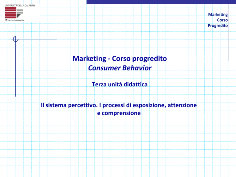 Marketing Corso Progredito Marketing - Corso progredito Consumer Behavior Terza unità didattica Il sistema percettivo. I processi di esposizione, attenzione e comprensione I PROCESSI PERCETTIVI Marketing Corso Progredito Sistemi sensoriali Vista Udito Vedere un cartellone pubblicitario Ascoltare il jingle di uno spot Tatto Olfatto Verificare la morbidezza di un maglione Provare la fragranza di un profumo Gusto Assaporare un nuovo gusto di gelato Stimoli Percezione Esposizione Attenzione Comprensione Selezione degli stimoli (attenzione selettiva) Obiettivo dell’impresa: superare la soglia dell’attenzione Interpretazione degli stimoli (distorsione selettiva e ritenzione selettiva) Obiettivo dell’impresa: favorire la corretta comprensione degli stimoli Marketing - Corso progredito - Consumer Behavior SENSAZIONE E PERCEZIONE Marketing Corso Progredito Stimoli di marketing Spot pubblicitari Inserzioni su giornali e riviste Confezioni dei prodotti Prodotti sugli scaffali Prezzi di vendita Indicazioni fornite dal personale di vendita Comunicazione interpersonale tra individui […] Sensazione Risposta immediata dei sistemi sensoriali allo stimolo Percezione Processo mediante il quale le sensazioni sono selezionate, organizzate e interpretate Marketing - Corso progredito - Consumer Behavior LE SOGLIE PERCETTIVE Marketing Corso Progredito Soglia assoluta di percezione (livello di stimolazione necessario affinché lo stimolo possa essere percepito) e sue implicazioni Es.: suoni troppo deboli o immagini troppo piccole non vengono percepite Soglia differenziale di percezione o J.N.D. - Just Noticeable Difference (incremento del livello di stimolazione necessario affinché la variazione dello stimolo sia percepita dal soggetto) Es.: spot in bianco e nero alternati a spot a colori Costante di Weber: ∆S/S=K Percezione subliminale (quando lo stimolo è al di sotto della soglia di riconoscimento) Marketing - Corso progredito - Consumer Behavior L’ESPOSIZIONE E L’ATTENZIONE Marketing Corso Progredito Per esposizione si intende la capacità fisica e mentale di ricevere uno stimolo all’interno di un determinato contesto L’attenzione può essere definita come l’attivazione da parte dello stimolo dei processi mentali che trasferiscono la sensazione percepita al cervello per la successiva elaborazione Tipi di esposizione e di attenzione Esposizione intenzionale: comportamento pianificato del consumatore volto alla ricerca delle informazioni necessarie a risolvere un determinato problema (attenzione pianificata). In questi casi, l’esposizione dà luogo ad una percezione Esposizione accidentale: contatto non intenzionale con l’informazione (attenzione involontaria e spontanea). In questi casi, l’esposizione di per sé non garantisce che lo stimolo venga effettivamente percepito Marketing - Corso progredito - Consumer Behavior LUOGHI DI ESPOSIZIONE NON CONVENZIONALI Pubblicità dinamica Adv elevator Marketing Corso Progredito Pubblicità in metropolitana In negozio: digital signage Strisce pedonali “pubblicitarie” Marketing - Corso progredito - Consumer Behavior LA SELEZIONE DEGLI STIMOLI Marketing Corso Progredito A causa della sovrabbondanza di stimoli e dei limiti nella capacità elaborativa, i consumatori selezionano le informazioni che ricevono: solo una parte degli stimoli ai quali sono esposti superano la soglia dell’attenzione e vengono sottoposti al processo di elaborazione. Ciò dipende: dall’interesse dello stimolo rispetto al soddisfacimento di un bisogno quando l’esposizione è intenzionale (rilevanza della fase di raccolta delle informazioni) dalla distinzione dello stimolo rispetto allo sfondo quando l’esposizione è accidentale Perché alcuni stimoli riescono a distinguersi? Marketing - Corso progredito - Consumer Behavior LA SELEZIONE DEGLI STIMOLI Marketing - Corso progredito - Consumer Behavior Marketing Corso Progredito LA SELEZIONE DEGLI STIMOLI Marketing Corso Progredito Perché alcuni stimoli riescono a distinguersi? Dipende da: Caratteristiche individuali Sensibilità agli stimoli maturata per esperienza e tratti della personalità Livello di vigilanza (vigilanza percettiva) Adattamento (assuefazione) Processi automatici Principio di difesa ed equilibrio percettivo (percezione difensiva) Caratteristiche degli stimoli posizione/collocazione dello stimolo nello spazio percettivo dell’individuo contrasto dello stimolo rispetto a quelli tra i quali si trova collocato (intensità, movimento, contrasto cromatico, white space) Caratteristiche del contesto Densità di stimoli (clutter) Interesse per il programma o contenuto editoriale Marketing - Corso progredito - Consumer Behavior LA COMPRENSIONE Marketing Corso Progredito Il processo di comprensione consiste nell’aggiunta di contenuti e di significati alle informazioni grezze e nell’integrazione della nuova conoscenza con quella esistente Fattori che influenzano la comprensione Caratteristiche individuali Caratteristiche del contesto Caratteristiche dello stimolo Meccanismi di base della comprensione Organizzazione Categorizzazione Inferenza Marketing - Corso progredito - Consumer Behavior ORGANIZZAZIONE DEGLI STIMOLI Marketing Corso Progredito Organizzazione: gli individui traggono il significato dall’insieme degli stimoli piuttosto che dai singoli elementi (psicologia della Gestalt) Regole di comprensione gestaltica: principio di chiusura principio di prossimità (o vicinanza) principio di similarità (o somiglianza) principio di continuità principio di contesto (figure and ground) Marketing - Corso progredito - Consumer Behavior ORGANIZZAZIONE DEGLI STIMOLI • Chiusura • Similarità • Prossimità • Figura e sfondo • Continuità Marketing - Corso progredito - Consumer Behavior Marketing Corso Progredito PRINCIPIO DI CHIUSURA (1) Marketing Corso Progredito L’individuo tende a completare una rappresentazione a cui mancano alcuni elementi Marketing - Corso progredito - Consumer Behavior PR