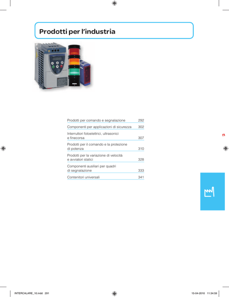 Prodotti per l’industria INTERCALARE_10.indd 291 Prodotti per comando e segnalazione 292 Componenti per applicazioni di sicurezza 302 Interruttori fotoelettrici, ultrasonici e finecorsa 307 Prodotti per il comando e la protezione di potenza 310 Prodotti per la variazione di velocità e avviatori statici 328 Componenti ausiliari per quadri di segnalazione 333 Contenitori universali 341 nov 15-04-2010 11:34:59 PRODOTTI PER L’INDUSTRIA Catalist AI_2008.book Page 292 Thursday, April 15, 2010 9:07 AM Pulsanti Ø 22 Harmony XB4-B in metallo Caratteristiche • Teste con ghiera in metallo; • IP66; • lampade “Protected LED®” con durata 100.000 ore; • fissaggio a vite; • contatti in lega di argento (Ag/Ni); • corrente nominale termica 10A. IEC/EN 60947-5-1/5-4 Testa pulsante ad impulso filo ghiera Colore Colore scritta Nero Verde Rosso Giallo Verde Verde Rosso ZB4BA2 ZB4BA3 ZB4BA4 ZB4BA5 “I” bianco ZB4BA331 “START” bianco ZB4BA333 “O” bianco ZB4BA432 Codice Testa pulsante ad impulso sporgente Colore Colore scritta Codice Rosso Nero Rosso “STOP” bianco “STOP” bianco “O” bianco ZB4BL434 ZB4BL234 ZB4BL432 Testa pulsante ad impulso a fungo Ø 40 mm Colore Codice Nero Rosso ZB4BC2 ZB4BC4 Testa pulsante a fungo Arresto d’emergenza fungo Ø 40 mm Funzione Colore Codice Girare per sbloccare (conforme EN/ISO 13850) Sblocco a chiave n. 455 (conforme EN/ISO 13850) rosso ZB4BS844 rosso ZB4BS944 292 Funzione Pulsanti, selettori e segnalazioni per montaggio su quadro. Catalist AI_2008.book Page 293 Thursday, April 15, 2010 9:07 AM Testa selettore Funzione Con leva corta nera Con leva A chiave lunga nera 2 posizioni fisse 2 pos.ritorno a molla a sinistra 3 posizioni fisse 3 pos. ritorno a molla al centro ZB4BD2 ZB4BD4 ZB4BD3 ZB4BD5 ZB4BJ2 ZB4BJ4 ZB4BJ3 ZB4BJ5 ZB4BG2 ZB4BG6 ZB4BG0 ZB4BG7 Corpi contatto con base collegamento vite-serrafilo Funzione Codice 1 NO 1 NC 2 NO 2 NC 1 NO + 1 NC ZB4BZ101 ZB4BZ102 ZB4BZ103 ZB4BZ104 ZB4BZ105 Elementi di contatto standard Funzione Codice 1 contatto NO 1 contatto NC ZBE101 ZBE102 Lampada spia completa con “Protected LED®” durata 100.000 ore Colore Bianco Verde Rosso Arancione Blu 24Vac-dc Alimentazione 120 Vac 230..240 Vac XB4BVB1 XB4BVB3 XB4BVB4 XB4BVB5 XB4BVB6 XB4BVG1 XB4BVG3 XB4BVG4 XB4BVG5 XB4BVG6 XB4BVM1 XB4BVM3 XB4BVM4 XB4BVM5 XB4BVM6 293 PRODOTTI PER L’INDUSTRIA Catalist AI_2008.book Page 294 Thursday, April 15, 2010 9:07 AM Pulsanti Ø 22 Harmony XB5-A in resina Caratteristiche • Teste con ghiera in resina per ambienti corrosivi; • IP66; • lampade “Protected LED®” con durata 100.000 ore; • fissaggio tramite ghiera in resina; • contatti in lega di argento (Ag/Ni); • corrente termica 10A. IEC/EN 60947-5-1/5-4 Testa pulsante ad impulso filo ghiera Colore Colore scritta Nero Verde Rosso Giallo Verde Verde Rosso ZB5AA2 ZB5AA3 ZB5AA4 ZB5AA5 “I” bianco ZB5AA331 “START” bianco ZB5AA333 “O” bianco ZB5AA432 Codice Testa pulsante ad impulso sporgente Colore Colore scritta Codice Rosso Nero Rosso “STOP” bianco “STOP” bianco “O” bianco ZB5AL434 ZB5AL234 ZB5AL432 Testa pulsante ad impulso a fungo Ø 40 mm Colore Codice Nero Rosso ZB5AC2 ZB5AC4 Testa pulsante a fungo Arresto d’emergenza fungo Ø 40 mm Funzione Colore Codice Girare per sbloccare (conforme EN/ISO 13850) Sblocco a chiave n. 455 (conforme EN/ISO 13850) rosso ZB5AS844 rosso ZB5AS944 294 Funzione Pulsanti, selettori e segnalazioni per montaggio su quadro. Catalist AI_2008.book Page 295 Thursday, April 15, 2010 9:07 AM Testa selettori Funzione Con leva corta nera Con leva A chiave lunga nera 2 posizioni fisse 2 pos. ritorno a molla a sinistra 3 posizioni fisse 3 pos. ritorno a molla al centro ZB5AD2 ZB5AD4 ZB5AD3 ZB5AD5 ZB5AJ2 ZB5AJ4 ZB5AJ3 ZB5AJ5 ZB5AG2 ZB5AG6 ZB5AG0 ZB5AG7 Corpi contatto con base collegamento vite-serrafilo Funzione Codice 1 NO 1 NC 2 NO 2 NC 1 NO + 1 NC ZB5AZ101 ZB5AZ102 ZB5AZ103 ZB5AZ104 ZB5AZ105 Elementi di contatto standard Per pulsanteria XB5-A previo fissaggio sulla base ZB5-AZ009. Possono essere utilizzati come elementi addizionali sulla pulsanter ia XB4-B Funzione Codice ZBE101 ZBE102 1 contatto NO 1 contatto NC Lampada spia completa con “Protected LED®” durata 100.000 ore Colore Bianco Verde Rosso Arancione Blu 24Vac-dc Alimentazione 120 Vac 230..240 Vac XB5AVB1 XB5AVB3 XB5AVB4 XB5AVB5 XB5AVB6 XB5AVG1 XB5AVG3 XB5AVG4 XB5AVG5 XB5AVG6 XB5AVM1 XB5AVM3 XB5AVM4 XB5AVM5 XB5AVM6 295 PRODOTTI PER L’INDUSTRIA Catalist AI_2008.book Page 296 Thursday, April 15, 2010 9:07 AM Commutatori a camme Funzioni • Commutatori amperometrici e voltmetrici per rilevare la misura di correnti e tensioni attraverso gli appositi strumenti; • per funzioni differenti consultare la nostra organizzazione commerciale. Caratteristiche • Calibro 12A; • montaggio a pannello 2/4 viti; • prodotti completi: corpo contatti + testa a leva + etichetta con marcatura. Commutatori di amperometro Schema di collegamento Schema di commutazione Marcatura Tipo di fissaggio anteriore Corrente termica Codice (Ith) A Per 3 punti di misura L1 L2 L3 K L K I K 0 K 1 2 3 4 5 6 7 8 9 10 11 12 90 180 270 I K L K I Con posizione zero 0 1 2 3 4 5 6 7 8 9 10 11 12 L L1 L3 “Multifissaggio” 12 K1F003MLH L2 A 0 90 180 Senza posizione zero L1 1 2 3 4 5 6 7 8 9 10 11 12 L2 “Multifissaggio” 12 K1F013MLH L3 Per 4 punti di misura L1 L2 L3 L4 0 K L K I K K I K K 1 2 3 4 5 6 7 8 9 10 11 12 13 14 15 16 296 A 60 120 180 240 1 2 3 4 5 6 7 8 9 10 11 12 13 14 15 16 L L I K L K I 0 1 2 4 “Multifissaggio” 12 K1H004MLH 3 90 180 270 1 2 3 4 5 6 7 8 9 10 11 12 13 14 15 16 Con posizione zero 0 Senza posizione zero L1 L2 L4 L3 “Multifissaggio” 12 K1H014MLH Catalist AI_2008.book Page 297 Thursday, April 15, 2010 9:07 AM Commutatori di voltmetro Schema di collegamento Schema di commutazione Marcatura Tipo di fissaggio anteriore Corrente termica Codice (Ith) A Per misurare le 3 tensioni tra fase e neutro L1 2 3 N 0 45 90 135 Con posizione zero 0 L1-N 1 2 