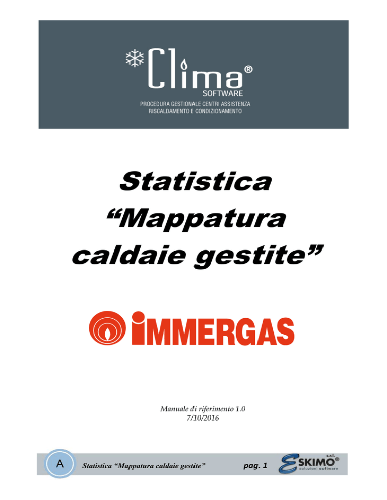 Statistica “Mappatura caldaie gestite” a ua e di riferi e t 1 0 7 10 2016 Statistica “Mappatura caldaie gestite” pag. 1 Statistica “Mappatura caldaie gestite” Copyright © Eskimo s.r.l. Tutti i diritti riservati. Il software o parte di esso descritto in questo manuale è regolato dalla concessione di ® licenza del prodotto Clima . Il software, questo manuale e tutta la documentazione a corredo del software sono protetti dalla registrazione del marchio e non possono essere riprodotti né per intero né in parte, in accordo alla concessione di licenza. Clima® è un marchio registrato di Eskimo s.r.l.® Via del Lazzeretto, 168/15 59100 Prato (PO) Tel. 0574 643576 - Fax 0574 643575 e-mail: support@eskimo.it web: http://www.eskimo.it Statistica “Mappatura caldaie gestite” pag. 2 Indice argomenti PRE ESSA 4 1. Installazione e configurazione.................................... 5 11 Prerequisiti 5 12 I sta a i e 13 Recuper assiv date pri e acce si de Exce 7 i 8 2. Uso del modulo ............................................................ 9 21 Criteri pr du i e statistica 9 22 Pr du i e %Statistica& da archivi (I terve ti) 11 23 Pr du i e d cu e t X + e X+S 13 24 Chiusura pr du i e statistica 14 3. Change Log ................................................................ 16 Statistica “Mappatura caldaie gestite” pag. 3 PREMESSA Il modulo oggetto di questo manuale introduce in Clima la possibilità di generare una statistica così come richiesto da Immergas a settembre 2016, con il seguente formato (EXCEL): Statistica “Mappatura caldaie gestite” pag. 4 1. Installazione e configurazione 1.1 Prerequisiti Per mettere in pratica le istruzioni descritte in questa dispensa è necessario installare una versione di Clima successiva al 5/10/2016, disponibile nell’area FTP condivisa di www.eskimo.it (per le istruzioni sull’aggiornamento di Clima, consultare la dispensa Backup e Aggiornamenti.pdf). NB: in caso si utilizzi attualmente una versione precedente alla 3.6.0, ossia 3.5.5 o 3.5.4, prima di procedere all’aggiornamento si consiglia di consultare un tecnico di Eskimo srl (scrivere a support@eskimo.it). Per la corretta produzione della Statistica in oggetto, è indispensabile che tutti gli [Apparecchi] riportino almeno la “Data 1a Accensione”. Statistica “Mappatura caldaie gestite” pag. 5 Per quegli apparecchi per cui questa informazione non è compilata, riferirsi al paragrafo 1.3 Recupero massivo date prime accensioni. Il modulo prevede la produzione della statistica in due formati, uno di puro testo e uno in un formato XML compatibile con EXCEL (versione 2003 e successive); quest’ultimo è completamente conforme a quello richiesto da Immergas. Qualora si voglia aprire il documento XML così prodotto, è necessario disporre di una licenza di MS EXCEL (2003 o successiva). Se non si dispone di una licenza di EXCEL compatibile, comunque, si può ugualmente produrre il documento da Clima e trasferirlo a Immergas. Per poter produrre la statistica in formato EXCEL, è necessario installare un apposito modello (fare riferimento al successivo paragrafo 1.2 Installazione modello EXCEL. Statistica “Mappatura caldaie gestite” pag. 6 1.2 Installazione modello Excel Per produrre la statistica nel formato EXCEL richiesto da Immergas è necessario installare un apposito documento (Mappatura caldaie gestite.clm) che verrà usato come modello per la generazione del documento finale. • In caso di installazione multiutente, il documento deve essere installato solo sul server, non è necessario installarlo sui singoli clients. • In caso di monoutenza, il documento deve essere installato sul PC con Clima. Il documento Mappatura caldaie gestite.clm è stato distribuito con la mailing list del 7 ottobre 2016, e può comunque essere recuperato dall’area FTP condivisa nel percorso Documenti produttori/Immergas/Statistica Mappatura caldaie gestite NOTA: Il suddetto file viene utilizzato come modello per la costruzione del foglio EXCEL finale, ed è in un formato incompleto e non visualizzabile. Il file diventerà consultabile solo dopo l’elaborazione da parte di Clima. Questo documento deve essere copiato in una cartella denominata ClimaTools\Modelli Excel localizzata al livello superiore della cartella contenente il file applicazione di 4thDimension, come spiegato successivamente. Se il file viene copiato in una cartella differente, non sarà raggiungibile dal modulo, e Clima potrà generare la statistica unicamente in formato testo. Procedere come segue: 1. Dopo aver effettuato l’aggiornamento di Clima, mandare in esecuzione il 4DServer (in caso di multiutenza) o la singola postazione di Clima (in caso di monoutenza): in questo modo, all’avvio, Clima creerà la corretta struttura delle cartelle Multiutenza, su PC Server 2. Identificare prima di tutto la cartella contenente il 4DServer.ex, supponiamo sia C:\Programmi (x86)\4d\Programs\4D Server 6.8.6 3. Dalla cartella suddetta, risalire di un livello; nell’esempio precedente: C:\Programmi (x86)\4d \Programs Monoutenza, su PC monoutente 2. Identificare prima di tutto la cartella contenente il 4DRunClassic.exe, supponiamo sia C:\Programmi (x86)\4d\Programs\4D Runtime Classic 6.8.6 3. Dalla cartella suddetta, risalire di un livello; nell’esempio precedente: C:\Programmi (x86)\4d \Programs Multiutenza e Monoutenza 4. Partendo dalla cartella individuata al punto precedente, posizionarsi prima nella cartella ClimaTools e quindi nella cartella Modelli Excel 5. Copiare nella cartella individuata il file Mappatura caldaie gestite.clm scaricato Qualora si modificasse, in un momento successivo, il percorso del file applicazione di 4thDimension, occorrerà adeguare conseguentemente anche il percorso di ClimaTools. Statistica “Mappatura caldaie gestite” pag. 7 1.3 Recupero massivo date prime accensioni Per le caldaie per cui in Clima non è stato registrata la data di prima accensione è possibile, con il supporto di un 