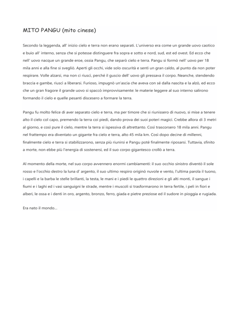 MITO PANGU (mito cinese) Secondo la leggenda, all’ inizio cielo e terra non erano separati. L’universo era come un grande uovo caotico e buio all’ interno, senza che si potesse distinguere fra sopra e sotto e nord, sud, est ed ovest. Ed ecco che nell’ uovo nacque un grande eroe, ossia Pangu, che separò cielo e terra. Pangu si formò nell’ uovo per 18 mila anni e alla fine si svegliò. Aperti gli occhi, vide solo oscurità e sentì un gran caldo, al punto da non poter respirare. Volle alzarsi, ma non ci riuscì, perché il guscio dell’ uovo gli pressava il corpo. Neanche, stendendo braccia e gambe, riuscì a liberarsi. Furioso, impugnò un’ascia che aveva con sé dalla nascita e la alzò, ed ecco che un gran fragore il grande uovo si spaccò improvvisamente: le materie leggere al suo interno salirono formando il cielo e quelle pesanti discesero a formare la terra. Pangu fu molto felice di aver separato cielo e terra, ma per timore che si riunissero di nuovo, si mise a tenere alto il cielo col capo, premendo la terra coi piedi, dando prova dei suoi poteri magici. Crebbe allora di 3 metri al giorno, e così pure il cielo, mentre la terra si ispessiva di altrettanto. Così trascorsero 18 mila anni. Pangu nel frattempo era diventato un gigante fra cielo e terra, alto 45 mila km. Così dopo decine di millenni, finalmente cielo e terra si stabilizzarono, senza più riunirsi e Pangu potè finalmente riposarsi. Tuttavia, sfinito a morte, non ebbe più l’energia di sostenersi, ed il suo corpo gigantesco crollò a terra. Al momento della morte, nel suo corpo avvennero enormi cambiamenti: il suo occhio sinistro diventò il sole rosso e l’occhio destro la luna d’ argento, il suo ultimo respiro originò nuvole e vento, l’ultima parola il tuono, i capelli e la barba le stelle brillanti, la testa, le mani e i piedi le quattro direzioni e gli alti monti, il sangue i fiumi e i laghi ed i vasi sanguigni le strade, mentre i muscoli si trasformarono in terra fertile, i peli in fiori e alberi, le ossa e i denti in oro, argento, bronzo, ferro, giada e pietre preziose ed il sudore in pioggia e rugiada. Era nato il mondo…
