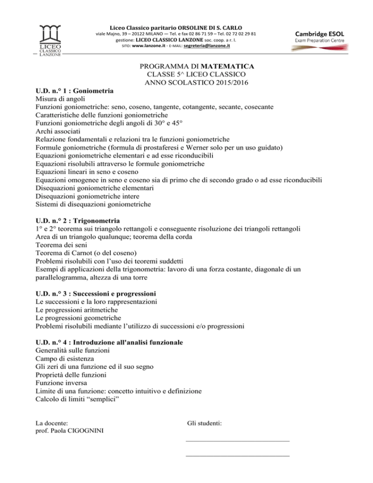 Liceo Classico paritario ORSOLINE DI S. CARLO viale Majno, 39 – 20122 MILANO ― Tel. e fax 02 86 71 59 – Tel. 02 72 02 29 81 gestione: LICEO CLASSICO LANZONE soc. coop. a r. l. SITO: www.lanzone.it - E-MAIL: segreteria@lanzone.it PROGRAMMA DI MATEMATICA CLASSE 5^ LICEO CLASSICO ANNO SCOLASTICO 2015/2016 U.D. n.° 1 : Goniometria Misura di angoli Funzioni goniometriche: seno, coseno, tangente, cotangente, secante, cosecante Caratteristiche delle funzioni goniometriche Funzioni goniometriche degli angoli di 30° e 45° Archi associati Relazione fondamentali e relazioni tra le funzioni goniometriche Formule goniometriche (formula di prostaferesi e Werner solo per un uso guidato) Equazioni goniometriche elementari e ad esse riconducibili Equazioni risolubili attraverso le formule goniometriche Equazioni lineari in seno e coseno Equazioni omogenee in seno e coseno sia di primo che di secondo grado o ad esse riconducibili Disequazioni goniometriche elementari Disequazioni goniometriche intere Sistemi di disequazioni goniometriche U.D. n.° 2 : Trigonometria 1° e 2° teorema sui triangolo rettangoli e conseguente risoluzione dei triangoli rettangoli Area di un triangolo qualunque; teorema della corda Teorema dei seni Teorema di Carnot (o del coseno) Problemi risolubili con l’uso dei teoremi suddetti Esempi di applicazioni della trigonometria: lavoro di una forza costante, diagonale di un parallelogramma, altezza di una torre U.D. n.° 3 : Successioni e progressioni Le successioni e la loro rappresentazioni Le progressioni aritmetiche Le progressioni geometriche Problemi risolubili mediante l’utilizzo di successioni e/o progressioni U.D. n.° 4 : Introduzione all'analisi funzionale Generalità sulle funzioni Campo di esistenza Gli zeri di una funzione ed il suo segno Proprietà delle funzioni Funzione inversa Limite di una funzione: concetto intuitivo e definizione Calcolo di limiti “semplici” La docente: prof. Paola CIGOGNINI Gli studenti: ______________________________ ______________________________