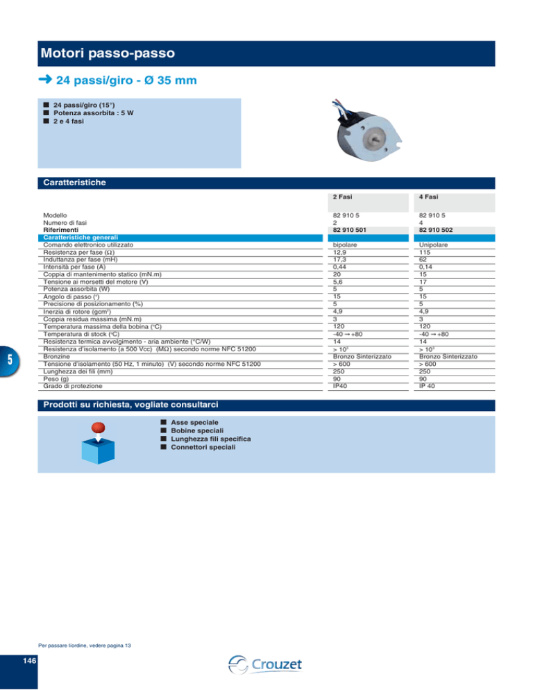 Motori passo-passo ➜ 24 passi/giro - Ø 35 mm ■ 24 passi/giro (15°) ■ Potenza assorbita : 5 W ■ 2 e 4 fasi Caratteristiche Modello Numero di fasi Riferimenti Caratteristiche generali Comando elettronico utilizzato Resistenza per fase (Ω) Induttanza per fase (mH) Intensità per fase (A) Coppia di mantenimento statico (mN.m) Tensione ai morsetti del motore (V) Potenza assorbita (W) Angolo di passo (o) Precisione di posizionamento (%) Inerzia di rotore (gcm2) Coppia residua massima (mN.m) Temperatura massima della bobina (oC) Temperatura di stock (oC) Resistenza termica avvolgimento - aria ambiente (°C/W) Resistenza d’isolamento (a 500 Vcc) (MΩ) secondo norme NFC 51200 Bronzine Tensione d’isolamento (50 Hz, 1 minuto) (V) secondo norme NFC 51200 Lunghezza dei fili (mm) Peso (g) Grado di protezione 5 Prodotti su richiesta, vogliate consultarci ■ ■ ■ ■ Per passare líordine, vedere pagina 13 146 Asse speciale Bobine speciali Lunghezza fili specifica Connettori speciali 2 Fasi 4 Fasi 82 910 5 2 82 910 501 82 910 5 4 82 910 502 bipolare 12,9 17,3 0,44 20 5,6 5 15 5 4,9 3 120 -40 ➞ +80 14 > 103 Bronzo Sinterizzato > 600 250 90 IP40 Unipolare 115 62 0,14 15 17 5 15 5 4,9 3 120 -40 ➞ +80 14 > 103 Bronzo Sinterizzato > 600 250 90 IP 40 Curve Curve dinamiche valori nominali 2 fasi - 12,9 Ω Curve dinamiche valori nominali 4 fasi - 115 Ω mNm mNm 15 15 10 10 3 2 5 0 0 50 100 125 250 200 500 5 300 750 400 1000 500 1250 0 600 Hz B rpm C Marcia-Arresto D Curve limite 0 50 100 125 250 200 500 300 750 400 1000 500 1250 600 Hz 1 B rpm C Marcia-Arresto D Curve limite Condizioni della misura Scheda d’alimentazione L 297/298 SGS a tensione costante, 5,6 V ai morsetti del motore, 2 fasi alimentate Inerzia catena di misura 4,53 g.cm2 Condizioni della misura Scheda d’alimentazione L 297/298 SGS a tensione costante, 5,6 V ai morsetti del motore, 2 fasi alimentate Inerzia catena di misura 4,53 g.cm2 Dimensioni 3,2 1 B 2 fori di fissaggio 5 Collegamenti 2 fasi 4 fasi 1 1 2 3 4 5 1 + + - 2 + + + 3 + + - 4 + + + B Passo Sequenza d’eccitazione per rotazione in senso Orario (lato asse) 1 1 2 3 4 5 1 - 2 - 3 - 4 - - B Passo Sequenza d’eccitazione per rotazione senso in senso Orario (lato asse) : 2 fasi alimentate. Comune collegato al positivo. 147 Motori passo-passo ➜ 48 passi/giro - Ø 35 mm - 2 fasi ■ 48 passi/giro (7°5) ■ Potenza assorbita : 5 W ■ 2 e 4 fasi Caratteristiche Modello Comando elettronico utilizzato Bronzine Riferimenti Caratteristiche generali Resistenza per fase (Ω) Induttanza per fase (mH) Intensità per fase (A) Coppia di mantenimento statico (mN.m) Tensione ai morsetti del motore (V) Potenza assorbita (W) Angolo di passo (o) Precisione di posizionamento (%) Inerzia di rotore (gcm2) Coppia residua massima (mN.m) Temperatura massima della bobina (oC) Temperatura di stock (oC) Resistenza termica avvolgimento - aria ambiente (°C/W) Resistenza d’isolamento (a 500 Vcc) (MΩ) secondo norme NFC 51200 Tensione d’isolamento (50 Hz, 1 minuto) (V) secondo norme NFC 51200 Lunghezza dei fili (mm) Peso (g) Grado di protezione 5 2 Fasi 2 Fasi 2 Fasi 82 910 0 Bipolare bronzine sinterizzate 82 910 001 82 910 0 Bipolare bronzine sinterizzate 82 910 0 Bipolare bronzine sinterizzate 9 12 0,52 25 4,7 5 7,5 5 4,9 3 120 -40 ➞ +80 14 > 103 12,9 15 0,44 25 5,6 5 7,5 5 4,9 3 120 -40 +80 14 > 103 66 68 0,19 25 12,7 5 7,5 5 4,9 3 120 -40 +80 14 > 103 > 600 > 600 > 600 250 90 IP 40 250 90 IP40 250 90 IP40 Prodotti su richiesta, vogliate consultarci ■ ■ ■ ■ Per passare líordine, vedere pagina 13 148 Asse speciale Bobine speciali Lunghezza fili specifica Connettori speciali ● ● Curve Inerzia della catena di misura : 1,5 g.cm2 a = comando a tensione costante con Rs (resistenza serie) = 0 b = comando a tenzione costante con Rs (resistenza serie) = R motore c = comando a tensione costante con Rs (resistenza serie) = 2 R motore d = comando a tensione costante con Rs (resistenza serie) = 3 R motore Le misure sono effettuate per passi interi, 2 fasi alimentate. 2 fasi Curve limite Marcia-Arresto e trascinamento a I costante (PBL 3717) per motore 2 Fasi 12,9 Ω Curva frequenza limite MarciaArresto in funzione dell’inerzia esterna trascinata a coppia antagonista nulla. Misurata a tensione costante. mN.m mN.m 18 16 14 12 10 8 6 4 2 d 15 c 3 a 12,5 2 10 b 3 7,5 2 5 1 2 2,5 200 250 400 500 600 800 1000 1200 Hz 750 1000 1200 1500 1 B rpm C Marcia-Arresto D Curve limite 0 400 500 800 1200 1600 2000 Hz 1000 1500 2000 2500 1 B rpm C Marcia-Arresto D Curve limite B 2 fasi C 4 fasi ØC ØA Dimensioni 5 3,2 D 1 B 2 fori di fissaggio Ø 3,2 Collegamenti 2 fasi 1 1 2 3 4 5 1 + + - 2 + + + 3 + + - 4 + + + B Passo Sequenza d’eccitazione per rotazione senso orario (vista lato asse) 149 Motori passo-passo ➜ 48 passi/giro - Ø 35 mm - 4 fasi ■ 48 passi/giro (7°5) ■ Potenza assorbita : 5 W ■ 2 e 4 fasi Caratteristiche Modello Comando elettronico utilizzato Bronzine bronzine sinterizzate Plastica Caratteristiche generali Comando elettronico utilizzato Resistenza per fase (Ω) Induttanza per fase (mH) Intensità per fase (A) Coppia di mantenimento statico (mN.m) Tensione ai morsetti del motore (V) Potenza assorbita (W) Angolo di passo (o) Precisione di posizionamento (%) Inerzia di rotore (gcm2) Coppia residua massima (mN.m) Temperatura massima della bobina (oC) Temperatura di stock (oC) Resistenza termica avvolgimento - aria ambiente (°C/W) Resistenza d’isolamento (a 500 Vcc) (MΩ) secondo norme NFC 51200 Tensione d’isolamento (50 Hz, 1 minuto) (V) secondo norme NFC 51200 Lunghezza dei fili (mm) Peso (g) Grado di protezione 5 4 Fasi 4 Fasi 4 Fasi 82 910 0 Unipolare 82 910 0 Unipolare 82 910 0 Unipolare ● ● Per passare líordine, vedere pagina 13 150 ● ● Unipolare 15,5 8 0,4 20 6,2 5 7,5 5 4,9 3 120 -40 ➞ +80 14 > 103 Unipolare 66 28 0,19 20 12,7 5 7,5 5 4,9 3 120 -40 +80 14 > 103 Unipolare 115 55 0,14 20 17 5 7,5 5 4,9 3 120 -40 +80 14 > 103 > 600 > 600 > 600> 250 9
