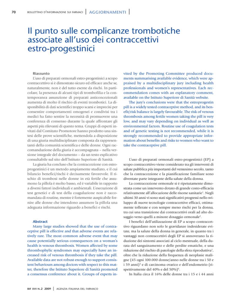 70 BOLLETTINO D’INFORMAZIONE SUI FARMACI | AGGIORNAMENTI | Il punto sulle complicanze trombotiche associate all’uso dei contraccettivi estro-progestinici Riassunto L’uso di preparati ormonali estro-progestinici a scopo contraccettivo si è dimostrato sicuro ed efficace anche se, naturalmente, non è del tutto esente da rischi. In particolare, la presenza di alcuni tipi di trombofilia e la contemporanea assunzione di preparati anticoncezionali aumenta di molto il rischio di eventi trombotici. La disponibilità di dati scientifici troppo scarsi e imprecisi per consentire comportamenti omogenei e condivisi tra i medici ha fatto sentire la necessità di promuovere una conferenza di consenso durante la quale affrontare gli aspetti più rilevanti di questo tema. Gruppi di esperti invitati dal Comitato Promotore hanno prodotto una sintesi delle prove scientifiche, mettendola a disposizione di una giuria multidisciplinare composta da rappresentanti della comunità scientifica e delle donne. Ogni raccomandazione della giuria è accompagnata – nella versione integrale del documento – da un testo esplicativo consultabile sul sito dell’Istituto Superiore di Sanità. La giuria ha concluso che la contraccezione con estroprogestinici è un metodo ampiamente studiato, e il cui bilancio benefici/rischi è decisamente favorevole. Il rischio di trombosi nelle donne in età fertile che assumono la pillola è molto basso, ed è variabile in rapporto a diversi fattori individuali e ambientali. L’esecuzione di test genetici e di test della coagulazione non è raccomandata di routine, mentre è fortemente auspicabile fornire alle donne che intendono assumere la pillola una adeguata informazione riguardo a benefici e rischi. Abstract Many large studies showed that the use of contraceptive pill is effective and that adverse events are relatively rare. The most common adverse event that may cause potentially serious consequences on a woman’s health is venous thrombosis. Women affected by some thrombophylic syndromes may especially have an increased risk of venous thrombosis if they take the pill. Available data are not robust enough to support consistent behaviours among doctors with respect to this matter, therefore the Istituto Superiore di Sanità promoted a consensus conference about it. Groups of experts in- BIF XVI N. 2 2009 | AGENZIA ITALIANA DEL FARMACO vited by the Promoting Committee produced documents summarising available evidence, which were appraised by a multidisciplinary jury including health professionals and women’s representatives. Each recommendation comes with an explanatory comment, available on the Istituto Superiore di Sanità website. The jury’s conclusions were that the estroprogestin pill is a widely tested contraceptive method, and its benefit/risk balance is largely favourable. The risk of venous thrombosis among fertile women taking the pill is very low, and may vary depending on individual as well as environmental factors. Routine use of coagulation tests and of genetic testing is not recommended, while it is strongly recommended to provide appropriate information about benefits and risks to women who want to take the contraceptive pill. L’uso di preparati ormonali estro-progestinici (EP) a scopo contraccettivo viene considerato tra gli interventi di salute pubblica più importanti del ventesimo secolo, tanto che la contraccezione e la pianificazione familiare sono diventate parte integrante della salute della donna. La contraccezione ormonale si è ripetutamente dimostrata come un intervento dotato di grande costo-efficacia relativamente all’allocazione delle risorse sanitarie1. Negli ultimi 30 anni vi sono stati significativi progressi nello sviluppo di nuove tecnologie contraccettive efficaci, ottimamente tollerate e con sempre meno rischi per la donna, tra cui una transizione dai contraccettivi orali ad alto dosaggio verso quelli a minore dosaggio ormonale2. I benefici dell’utilizzazione di EP a scopo contraccettivo riguardano non solo le gravidanze indesiderate evitate, ma la salute della donna in generale, in quanto tra i vantaggi non contraccettivi degli EP si annoverano la riduzione dei sintomi associati al ciclo mestruale, della durata del sanguinamento e delle perdite ematiche, e una riduzione del rischio di patologie della sfera riproduttiva1, oltre che la riduzione della frequenza di neoplasie maligne (45 ogni 100.000 donne/anno nelle donne tra i 50 e i 59 anni)3 e di carcinoma ovarico e dell’endometrio (rispettivamente del 40% e del 50%)4. In Italia circa il 16% delle donne tra i 15 e i 44 anni AGGIORNAMENTI | IL PUNTO SULLE COMPLICANZE TROMBOTICHE ASSOCIATE ALL’USO DEI CONTRACCETTIVI ESTRO-PROGESTINICI (2,2 milioni) assume EP a scopo anticoncezionale e, tra il 1982 e il 2007, parallelamente all’incremento nell’utilizzo di EP (dal 5,2% al 16,1% delle donne in età fertile) si è avuto un decremento delle interruzioni volontarie di gravidanza del 45,9%5. I contraccettivi orali EP sono stati oggetto di valutazioni a lungo termine e sono probabilmente tra i farmaci maggiormente studiati. Le loro tollerabilità e sicurezza sono ampiamente provate, specie in relazione ai rischi connessi con una gravidanza indesiderata. Si può affermare che la contraccezione ormonale combinata può essere ininterrottamente utilizzata senza grossi rischi in donne sane non fumatrici per tutta l’età riproduttiva, fino alla menopausa1. I principali rischi associati all’uso cronico di contraccettivi orali consistono in un aumento della frequenza di tumore al seno (3 casi in più ogni mille donne che fanno uso di contraccettivi orali per 8 anni), al collo dell’utero (2 casi per mille in più) e al fegato (0,7 casi per mille in più)6. I dati disponibili mostrano, tuttavia, che il rischio di malattie neoplastiche associato all’uso di contraccettivi orali è molto basso, e comunque non condiziona la sopravvivenza delle donne che ne fanno uso rispetto a quell