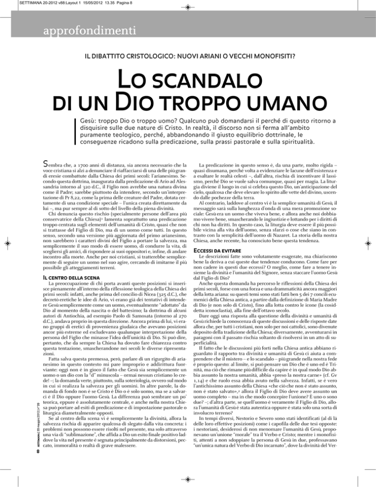 SETTIMANA 20-2012 v88:Layout 1 15/05/2012 13.35 Pagina 8 approfondimenti IL DIBATTITO CRISTOLOGICO: NUOVI ARIANI O VECCHI MONOFISITI? Lo scandalo di un Dio troppo umano Gesù: troppo Dio o troppo uomo? Qualcuno può domandarsi il perché di questo ritorno a disquisire sulle due nature di Cristo. In realtà, il discorso non si ferma all’ambito puramente teologico, perché, abbandonando il giusto equilibrio dottrinale, le conseguenze ricadono sulla predicazione, sulla prassi pastorale e sulla spiritualità. S embra che, a 1700 anni di distanza, sia ancora necessario che la voce cristiana si alzi a denunciare il riaffacciarsi di una delle più grandi eresie combattute dalla Chiesa dei primi secoli: l’arianesimo. Secondo questa dottrina, inaugurata dalla predicazione di Ario ad Alessandria intorno al 320 d.C., il Figlio non avrebbe una natura divina come il Padre; sarebbe piuttosto da intendere, secondo un’interpretazione di Pr 8,22, come la prima delle creature del Padre, dotata certamente di una condizione speciale – l’unica creata direttamente da lui –, ma pur sempre al di sotto del livello della piena divinità. Chi denuncia questo rischio (specialmente persone dell’area più conservatrice della Chiesa)1 lamenta soprattutto una predicazione troppo centrata sugli elementi dell’umanità di Cristo, quasi che non si trattasse del Figlio di Dio, ma di un uomo come tutti. In questo senso, secondo una versione più aggiornata del primo arianesimo, non sarebbero i caratteri divini del Figlio a portare la salvezza, ma semplicemente il suo modo di essere uomo, di condurre la vita, di scegliersi gli amici, di rispondere ai suoi oppositori e, infine, di andare incontro alla morte. Anche per noi cristiani, si tratterebbe semplicemente di seguire un uomo nel suo agire, cercando di imitarne il più possibile gli atteggiamenti terreni. settimana 13 20 maggio 2012 | n° 19 20 Il centro della scena 8 La preoccupazione di chi porta avanti queste posizioni si inserisce pienamente all’interno della riflessione teologica della Chiesa dei primi secoli: infatti, anche prima del concilio di Nicea (325 d.C.), che decretò eretiche le idee di Ario, vi erano già dei tentativi di intendere Gesù semplicemente come un uomo, eventualmente “adottato” da Dio al momento della nascita o del battesimo; la dottrina di alcuni autori di Antiochia, ad esempio Paolo di Samosata (intorno al 270 d.C.), andava proprio in questa direzione. Ancora prima di lui, vi erano gruppi di eretici di provenienza giudaica che avevano posizioni ancor più estreme ed escludevano qualunque interpretazione della persona del Figlio che minasse l’idea dell’unicità di Dio. Si può dire, pertanto, che da sempre la Chiesa ha dovuto fare chiarezza contro questa tentazione, smascherandone nei secoli le diverse ripresentazioni. Fatta salva questa premessa, però, parlare di un rigurgito di arianesimo in questo contesto mi pare improprio e addirittura fuorviante: oggi non è in gioco il fatto che Gesù sia semplicemente un uomo o un dio con la “d” minuscola – ormai nessun cristiano lo crede! –; la domanda verte, piuttosto, sulla soteriologia, ovvero sul modo in cui si realizza la salvezza per gli uomini. In altre parole, la domanda di fondo non è se Cristo è Dio o è solo uomo, ma se a salvarci è il Dio oppure l’uomo Gesù. La differenza può sembrare un po’ teorica, eppure è assolutamente centrale, e anche nella nostra Chiesa può portare ad esiti di predicazione e di impostazione pastorale o liturgica diametralmente opposti. Se al centro della scena vi è semplicemente la divinità, allora la salvezza rischia di apparire qualcosa di slegato dalla vita concreta: i problemi non possono essere risolti nel presente, ma solo attraverso una via di “sublimazione”, che affida a Dio un esito finale positivo laddove la vita nel presente è segnata principalmente da distorsioni, peccato, immoralità o realtà di grave malessere. La predicazione in questo senso è, da una parte, molto rigida – quasi disumana, perché volta a evidenziare le lacune dell’esistenza e a esaltare le realtà celesti –, dall’altra, rischia di incentivare il lassismo, perché Dio se vuole salva comunque, quasi per magia. La liturgia diviene il luogo in cui si celebra questo Dio, un’anticipazione del cielo, qualcosa che deve elevare lo spirito alle vette del divino, uscendo dalle pochezze della terra. Al contrario, laddove al centro vi è la semplice umanità di Gesù, il messaggio sarà sulla lunghezza d’onda di una mera promozione sociale: Gesù era un uomo che viveva bene, e allora anche noi dobbiamo vivere bene, smascherando le ingiustizie e lottando per i diritti di chi non ha diritti. In questo caso, la liturgia deve essere il più possibile vicina alla vita dell’uomo, senza sfarzi o cose che siano in contrasto con la semplicità dell’uomo di Nazaret. La storia della nostra Chiesa, anche recente, ha conosciuto bene questa tendenza. Eccessi da evitare Le descrizioni fatte sono volutamente esagerate, ma chiariscono bene la deriva a cui queste due tendenze conducono. Come fare per non cadere in questi due eccessi? O meglio, come fare a tenere insieme la divinità e l’umanità del Signore, senza staccare l’uomo Gesù dal Figlio di Dio? Anche questa domanda ha percorso le riflessioni della Chiesa dei primi secoli, forse con una forza e una drammaticità ancora maggiori della lotta ariana: su questi temi sono stati fatti ben 5 dei 7 concili ecumenici della Chiesa antica, a partire dalla definizione di Maria Madre di Dio (e non solo di Cristo), fino alla lotta contro le icone (la cosiddetta iconoclastia), alla fine dell’ottavo secolo. Dare oggi una risposta alla questione della divinità e umanità di Gesù richiede la conoscenza di queste discussioni e delle risposte date allora che, per tutti i cristiani, non solo per noi cattolici, sono divenute deposito della tradizione della Chiesa; diversamente, avventurarsi in paragon