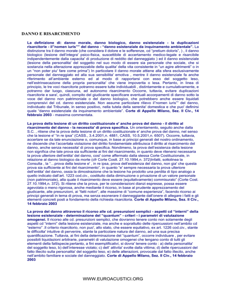 DANNO E RISARCIMENTO La definizione di: danno morale, danno biologico, danno esistenziale - la duplicazioni risarcitorie - il”nomen iuris”” del danno - “danno esistenziale da inquinamento ambientale”. La distinzione tra il danno morale (che considera il dolore e le sofferenze, cd “pretium doloris”, ) , il danno biologico (lesione dell’integra' psico-fisica, suscettibile di accertamento medico-legale e risarcibile indipendentemente dalla capacita' di produzione di reddito del danneggiato ) ed il danno esistenziale (lesione della personalita' del soggetto nel suo modo di essere sia personale che sociale, che si sostanzia nella alterazione apprezzabile della qualita' della vita consistente in “un agire altrimenti” o in un “non poter piu' fare come prima”) In particolare il danno morale attiene alla sfera esclusivamente personale del danneggiato ed alla sua sensibilita' emotiva , mentre il danno esistenziale fa anche riferimento all’ambiente esterno ed al modo di rapportarsi con esso del soggetto leso, nell’estrinsecazione della propria personalita' che viene impoverita o lesa. Pertanto, in linea di principio, le tre voci risarcitorie potranno essere tutte individuabili , distintamente e cumulativamente, e potranno dar luogo, ciascuna, ad autonomo risarcimento Occorre, tuttavia, evitare duplicazioni risarcitorie e sara', quindi, compito del giudicante specificare eventuali accorpamenti di danno sotto la voce del danno non patrimoniale o del danno biologico, che potrebbero anche essere liquidati comprensivi del cd. danno esistenziale. Non assume particolare rilievo il”nomen iuris”” del danno, individuato dal Tribunale, in senso positivo, nella tutela della serenita' domestica e che puo' definirsi quale “danno esistenziale da inquinamento ambientale”. Corte di Appello Milano, Sez. II Civ., 14 febbraio 2003 - massima commentata. La prova della lesione di un diritto costituzionale e' anche prova del danno - il diritto al risarcimento del danno - la necessita' di prova specifica. Un orientamento, seguito anche dalla S.C. , ritiene che la prova della lesione di un diritto costituzionale e' anche prova del danno, nel senso che la lesione e' “in re ipsa” (CASS., 3.4.2001,n. 4881, CASS, 10.5.2001,n. 6507). Occorre, tuttavia, accertare se da tale enunciazione o, comunque, in base ai principi generali del nostro ordinamento, ne discende che l’accertata violazione del diritto fondamentale attribuisca il diritto al risarcimento del danno, anche senza necessita' di prova specifica. Nondimeno, la prova dell’esistenza della lesione non significa che tale prova sia sufficiente ai fini del risarcimento, in quanto deve ritenersi necessaria la prova ulteriore dell’entita' del danno, cosi' come affermato dalla stessa Corte Costituzionale, in relazione al danno biologico da morte (cfr Corte Costt. 27.10.1994,n. 372)Infatti, sottolinea la Consulta , la “…prova della lesione e' , in re ipsa, prova dell’esistenza del danno, non gia' che questa prova sia sufficiente ai fini del risarcimento”, in quanto “e' sempre necessaria la prova ulteriore dell’entita' del danno, ossia la dimostrazione che la lesione ha prodotto una perdita di tipo analogo a quello indicato dall’art. 1223 cod.civ., costituito dalla diminuzione o privazione di un valore personale (non patrimoniale), alla quale il risarcimento deve essere (equitativamente) commisurato” (Corte Cost. 27.10.1994,n. 372). Si ritiene che la prova, per le considerazioni dianzi espresse, possa essere agevolata o meno rigorosa, anche mediante il ricorso, in base al prudente apprezzamento del giudicante, alle presunzioni, ai “fatti notori”, alle massime di “comune esperienza”, facendo ricorso ai principi generali in tema di prova, ma senza esonerare il danneggiante dall’onere di allegare i fatti e gli elementi concreti posti a fondamento della richiesta risarcitoria. Corte di Appello Milano, Sez. II Civ., 14 febbraio 2003 La prova del danno attraverso il ricorso alle cd. presunzioni semplici - aspetti cd “interni” della lesione esistenziale - determinazione del “quantum” - criteri - i parametri di valutazione omogenei. Il ricorso alle cd. presunzioni semplici, che dovranno tenere conto non solamente degli aspetti cd “interni” della lesione esistenziale, ma anche e soprattutto delle ripercussioni nell’ambito cd “esterno” .Il criterio risarcitorio, non puo', allo stato, che essere equitativo, ex art. 1226 cod.civ., stante le difficolta' intuitive di pervenire, stante la particolare natura del danno, ad una sua precisa quantificazione. Tuttavia, ai fini della determinazione del “quantum”, occorre individuare , per evitare possibili liquidazioni arbitrarie, parametri di valutazione omogenei che tengano conto di tutti gli elementi della fattispecie;pertanto, a fini esemplificativi, si dovra' tenere conto : a) della personalita' del soggetto leso, b) dell’interesse violato; c) dell’ attivita' svolte dalla vittima; d) delle ripercussioni del fatto illecito sulla personalita' del soggetto leso, e) delle alterazioni, provocate dal fatto illecito, anche nell’ambito familiare e sociale del danneggiato. Corte di Appello Milano, Sez. II Civ., 14 febbraio 2003 WWW.EUROACUSTICI.ORG Il danno biologico in senso stretto - nozione - la tutela in base al precetto costituzionale violato. Il danno e' rappresentato dalle ripercussioni sulle attivita' non reddituali dei danneggiati,ed, in particolare dalla alterazione delle normali abitudini di vita e non va qualificato, come gia' evidenziato, come danno biologico in senso stretto , in quanto non comporta un’alterazione dello stato di salute o l’insorgere di una malattia , ma consiste in un’alterazione dei normali ritmi di vita che si riflettono sulla personalita' del soggetto danneggiato, incidendo negativamente, come riconosciuto dal Tribunale nella fattispecie, sulle normali attivita' quotidiane e provocando uno stato di malessere diffuso 