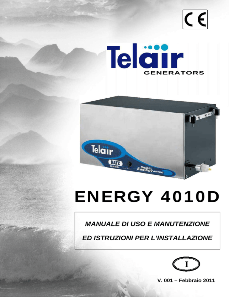 I GENERATORS EN ERGY 4 0 1 0 D MANUALE DI USO E MANUTENZIONE ED ISTRUZIONI PER L’INSTALLAZIONE I INDICE Vers. 004 V. 001 – Febbraio 2011 I 1 INTRODUZIONE …………………………………………………………………………………………4 1.1 Scopo e campo di applicazione del manuale ..4 1.2 Simboli e definizioni .4 1.3 Informazioni generali ...4 2 IDENTIFICAZIONE DEL GRUPPO ELETTROGENO ………………………………………………5 2.1 Componenti ...5 2.2 Targa di identificazione . 5 2.3 Dimensioni d'ingombro . 5 2.4 Caratteristiche tecniche . ..6 3 TRASPORTO, MOVIMENTAZIONE, IMMAGAZZINAMENTO …………………………………….7 3.1 immagazzinamento ..7 3.2 Peso 7 3.3 Movimentazione 7 4 INSTALLAZIONE ……………………………………………………………………………………….7 4.1 Informazioni preliminari ...7 4.2 Istruzioni per il fissaggio del gruppo elettrogeno .7 4.2.1 Fissaggio in sospensione ..8 4.2.2 Fissaggio a pavimento .... .. 8 4.3 Collegamento marmitte di scarico 9 4.4 Collegamento tubi Carburante .10 4.5 Collegamento Riserva Carburante ..10 5 COLLEGAMENTI ELETTRICI ………………………………………………………………………..11 5.1 Preparazione al Collegamento Elettrico .11 5.2 Collegamento Elettrico 230 Vac ..11 5.3 Collegamento Relè di Rete Esterna ...12 5.4 Collegamento Batteria 12 Volt .13 5.5 Collegamento Pannello Elettronico di Comando ..13 6 INDICAZIONI DI FUNZIONAMENTO ………………………………………………………………..14 6.1 Carburante ..14 6.2 Sicurezza delle macchine .14 6.3 Informazioni sugli usi non consentiti ...14 6.4 Consigli utili .14 7 USO DEL GRUPPO ELETTROGENO ...……………………………………………………………. 15 7.1 Avviamento del gruppo elettrogeno 15 7.2 Arresto del gruppo elettrogeno ..15 7.3 Funzioni di Controllo e Allarme ..15 7.3.1 Versione Automatica (optional) 16 7.4 Funzionamento Manuale 16 7.4.1 Funzionamento Automatico ..16 8 INDICAZIONI PER LA MANUTENZIONE …………………………………………………………...17 8.1 Scheda per la Manutenzione 17 8.2 Manutenzioni che non richiedono personale qualificato ..17 8.2.1 Controllo livello Olio Motore 17 8.3 Manutenzioni che richiedono personale qualificato ..18 8.3.1 Sostituzione Olio Motore ..18 8.3.2 Manutenzione Filtro Aria ..19 8.3.3 Manutenzione Filtro Olio ..19 8.3.4 Controllo Cinghia Alternatore ..21 8.3.5 Regolazione Cinghia Alternatore 21 9 INDICAZIONI PER LA MESSA FUORI SERVIZIO E SMANTELLAMENTO ………………… 22 10 MEZZI ANTINCENDIO DA USARE ……………………………………………………………….22 11 CONDIZIONI GENERALI DI GARANZIA ………………………………………………………….22 12 SCHEMA ELETTRICO ENERGY 4010 D ………………………………………………………….23 13 LISTA PARTI DI RICAMBIO ENERGY 4010 D …………………………………………………...24 2 Energy 4010 D Vers. 001 I Via E. Majorana , 49 48022 Lugo (RA) ITALY DICHIARAZIONE "CE" DI CONFORMITÀ ai sensi della Direttiva Macchine 89/392/CEE, allegato II A Si dichiara che il generatore, i cui dati sono sotto specificati, è stato progettato e costruito in modo rispondente ai requisiti essenziali di sicurezza e di salute dettati dalla Direttiva Europea sulla Sicurezza delle Macchine. La presente dichiarazione perde validità in caso di modifiche apportate alla macchina senza nostra approvazione scritta. Macchina: GRUPPO ELETTROGENO Modello: ENERGY 4010 D N.ro serie ......................................... Direttive di riferimento: Direttiva Macchine (89/392/CEE) nella versione 91/31/CEE. Direttiva Bassa Tensione (73/23/CEE). Compatibilità Elettromagnetica 2004/108/EC Norme armonizzate applicate in particolare: EN 292-1; EN 292-2; EN 60204-1. DATA ........07/12/2010.......... IL PRESIDENTE Vers. 001 Energy 4010 D 3 I 1 INTRODUZIONE Consultare attentamente questo manuale prima di procedere a qualsiasi intervento sul gruppo elettrogeno. 1.1 Scopo e campo di applicazione del manuale Questo manuale è stato redatto dal Costruttore allo scopo di fornire le informazioni e le istruzioni essenziali per effettuare, correttamente e in condizioni di sicurezza, tutte le operazioni di manutenzione e impiego del gruppo elettrogeno. Esso costituisce parte integrante del corredo del gruppo elettrogeno, deve essere conservato con cura per tutta la durata del suo ciclo di vita e va protetto da qualsiasi agente che potrebbe deteriorarlo. Esso deve seguire il gruppo elettrogeno qualora questo venga reinstallato su di un nuovo veicolo o che avvenga un cambio di proprietà. Le informazioni contenute in questo manuale sono dirette al personale che dovrà provvedere alla installazione del gruppo elettrogeno e a tutte le persone coinvolte nelle operazioni di manutenzione ed utilizzo. Il manuale definisce lo scopo per cui la macchina è stata costruita, contiene tutte le informazioni necessarie per garantirne un uso sicuro e corretto. La costante osservanza delle indicazioni in esso contenute garantisce la sicurezza dellutilizzatore, leconomia desercizio ed una maggiore durata della macchina stessa. Per facilitare la consultazione esso è stato suddiviso in sezioni che ne identificano i concetti principali; per una consultazione rapida degli argomenti consultare lindice descrittivo. Le parti di testo da non trascurare sono state evidenziate in grassetto e precedute da simboli qui di seguito illustrati e definiti. Si consiglia vivamente di leggere attentamente quanto contenuto in questo manuale e nei documenti di riferimento; solo così viene assicurato il regolare funzionamento nel tempo del climatizzatore, la sua affidabilità e la salvaguardia da danni a persone e cose. Nota: le informazioni contenute in questa pubblicazione sono corrette al momento della stampa, ma possono essere modificate senza preavviso. 4 1.2 Simboli e definiz