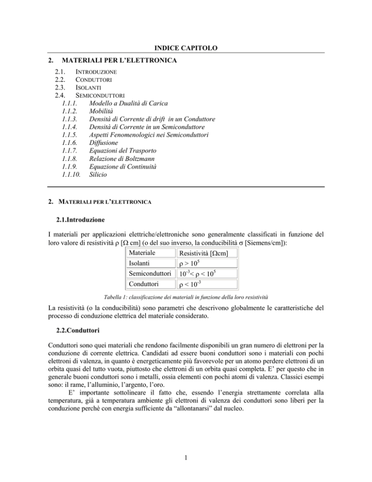 INDICE CAPITOLO 2. MATERIALI PER L’ELETTRONICA 2.1. INTRODUZIONE 2.2. CONDUTTORI 2.3. ISOLANTI 2.4. SEMICONDUTTORI 1.1.1. Modello a Dualità di Carica 1.1.2. Mobilità 1.1.3. Densità di Corrente di drift in un Conduttore 1.1.4. Densità di Corrente in un Semiconduttore 1.1.5. Aspetti Fenomenologici nei Semiconduttori 1.1.6. Diffusione 1.1.7. Equazioni del Trasporto 1.1.8. Relazione di Boltzmann 1.1.9. Equazione di Continuità 1.1.10. Silicio 2. MATERIALI PER L’ELETTRONICA 2.1.Introduzione I materiali per applicazioni elettriche/elettroniche sono generalmente classificati in funzione del loro valore di resistività ρ [Ω cm] (o del suo inverso, la conducibilità σ [Siemens/cm]): Materiale Resistività [Ωcm] Isolanti ρ > 105 Semiconduttori 10-3< ρ < 105 Conduttori ρ < 10-3 Tabella 1: classificazione dei materiali in funzione della loro resistività La resistività (o la conducibilità) sono parametri che descrivono globalmente le caratteristiche del processo di conduzione elettrica del materiale considerato. 2.2.Conduttori Conduttori sono quei materiali che rendono facilmente disponibili un gran numero di elettroni per la conduzione di corrente elettrica. Candidati ad essere buoni conduttori sono i materiali con pochi elettroni di valenza, in quanto è energeticamente più favorevole per un atomo perdere elettroni di un orbita quasi del tutto vuota, piuttosto che elettroni di un orbita quasi completa. E’ per questo che in generale buoni conduttori sono i metalli, ossia elementi con pochi atomi di valenza. Classici esempi sono: il rame, l’alluminio, l’argento, l’oro. E’ importante sottolineare il fatto che, essendo l’energia strettamente correlata alla temperatura, già a temperatura ambiente gli elettroni di valenza dei conduttori sono liberi per la conduzione perchè con energia sufficiente da “allontanarsi” dal nucleo. 1 Gli elettroni di valenza ancora legati al nucleo posseggono un valore di energia che risulta in un range denominato banda di valenza. Quando invece gli stessi elettroni acquistano una energia tale da svincolarsi dal nucleo ed essere disponibili alla conduzione allora la loro energia risulterà di valore esterno alla banda di valenza e cadrà nella banda di conduzione. I conduttori hanno tipicamente un gran numero di elettroni con energia in banda di conduzione. Nel campo della fisica atomica l’unità di misura che si adotta per l’energia è l’elettronvolt (eV) che rappresenta l’energia acquisita da 1 elettrone sottoposto a differenza di potenziale di 1 volt (1eV=1.602*10-19J). 0 elettroni (a T=0 K) 4N stati banda di conduzione Energia E Atomi isolati 2N elettroni (p) 6N stati EG 4N elettroni 4N stati banda di valenza 2N elettroni (s) 2N stati Livelli energetici delle cortecce più interne dell’atomo d0 d metallo isolante semiconduttore Figura 1: andamento delle bande di energia per i diversi tipi di materiali La banda di energia compresa fra la banda di valenza e quella di conduzione, che si definisce come banda proibita (o gap) è per i conduttori (come evidenziato in figura), trascurabile (≤ 0.01eV) o nulla. Quando un potenziale elettrico è applicato alle facce di un conduttore, gli elettroni liberi (in banda di conduzione) si muovono nella direzione imposta dal campo creando un flusso di cariche in movimento e quindi una corrente elettrica. La resistenza elettrica R di un conduttore, è funzione delle caratteristiche fisiche del materiale adottato (ρ) e di quelle geometriche, ossia lunghezza (l) e sezione (s): l [Ω] s La tabella che segue riporta valori tipici di resistività di comuni conduttori. R=ρ Materiale Argento Costantana Oro Composizione Cu+45%Ni+1%Mn 2 ρ (@20°C) [Ωcm] 1.59*10-6 50*10-6 2.24*10-6 ∆ρ/°C [%/°C] 0.41 0.002 0.40 Manganina Mercurio Nichel-Cromo Rame Rame elettrolitico 42*10-6 9.84*10-5 107*10-6 1.67*10-6 1.72*10-6 Cu+12%Ni+2%Ni 80%Ni+20%Cr 99.99% 99.9% ricotto 0.001 0.0011 0.40 0.93 Tabella 2: alcuni conduttori con i rispettivi valori di resistività L’unità di misura della resistenza elettrica è l’ohm (Ω). 2.3.Isolanti Negli isolanti gli elettroni di valenza sono strettamente legati ai loro atomi e l’energia per liberarli è di gran lunga maggiore di quella necessaria nel caso dei conduttori. Rimanendo quindi gli elettroni legati al nucleo, il loro numero disponibile per la conduzione si rivela assai piccolo e, di fatto, non conducono. Nel caso degli isolanti la banda proibita ha un intervallo energetico di alcuni eV, e un materiale sarà tanto un buon isolante quanto maggiore sarà quest’intervallo energetico. Nel caso del diamante, ad es., che è un ottimo isolante, la banda proibita è di 7eV. La tabella che segue mostra alcuni materiali isolanti e la loro resistività media Materiale ρ [Ωcm] Ceramica 109÷1012 Gomma 1011÷1014 Legno secco 106÷1012 Vetro 108÷1012 Tabella 3: alcuni isolanti con i loro valori di resistività 2.4.Semiconduttori La maggior parte dei dispositivi elettronici sfrutta le proprietà delle giunzioni tra materiali semiconduttori caratterizzati da proprietà diverse, oppure tra metallo e semiconduttore. Lo studio di tali dispositivi richiede perciò la conoscenza delle proprietà chimiche, fisiche, termiche ed elettriche dei semiconduttori. I semiconduttori presentando una gap energetica non eccessivamente ampia, ma non trascurabile (tipicamente non supera ≅1.5eV). Esempi tipici di semiconduttori, fra i più adottati in elettronica, sono il silicio (Si) con una gap (Eg) pari a Eg≅1.12eV, il germanio (Ge) con Eg≅0.72eV, l’Indio (In) con Eg≅0.23eV, l’arseniuro di gallio (GaAs) con Eg≅1.41eV. 3 Evuoto q·χ q·φS Econduzione Energy gap EF Evalenza Figura 2:esempio di diagramma a bande: Silicio intrinseco ( il Livello di Fermi è circa al centro tra EC ed EV) Il Livello di Vuoto rappresenta il livello energetico di riferimento superato il quale l’eccesso di energia è di natura cinetica. La banda di energia proibita è posizionata sotto il live