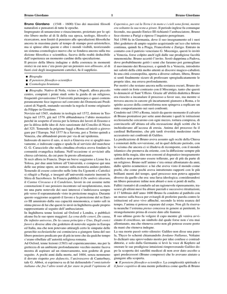 Bruno Giordano (1548 - 1600) Uno dei massimi filosofi naturalisti e pensatori di tutte le epoche. Impregnato di umanesimo e rinascimento, proiettato per lo spirito libero molto al di là della sua epoca, teologo, filosofo e ricercatore, non limitò il pensiero alle speculazioni filosofiche ancora in massima parte al tempo di stampo post-aristotelico, ma si spinse oltre queste e oltre i mondi visibili, teorizzando un sistema cosmologico nuovo che se fondava ancora sulla tradizione filosofica e scientifica, faceva della realtà deducibile dall’esperienza un momento cardine della speculazione. Il prezzo della libera indagine e della coerenza in momenti storici in cui non c’era posto per un pensiero non allineato, al di fuori cioè degli insegnamenti cattolici, fu il supplizio. Bruno Giordano Biografia Il pensiero filosofico-scientifico Cosmologia bruniana Biografia. Nativo di Nola, vicino a Napoli, allora piccolo centro, compiuti i primi studi sotto la guida di un religioso, frequentò giovanissimo l’Università partenopea e quasi contemporaneamente fece ingresso nel convento dei Domenicani Predicatori di Napoli, mutando secondo la regola il nome originario da Filippo in Giordano. Novizio nel 1565, studente in teologia nel 1572, dottore in Teologia nel 1575, già nel 1576 abbandonava l’abito monastico perché in sospetto d’eresia per la lettura dei lavori di Erasmo e per la difesa delle idee di Ario sanzionate dal Concilio di Nicea del 325. Temendo la prigione fuggì a Roma ed iniziò a girovogare per l’Europa. Nel 1577 fu a Savona, poi a Torino quindi a Venezia, che abbandonò presto per via di un’epidemia. Indossato di nuovo il saio, si recò a Ginevra ove si spogliò nuovamente, e indossate cappa e spada fu al servizio del marchese G. G. Caracciolo che nella cittadina elvetica aveva fondato la comunità evangelica italiana. Nell’occasione si avvicinò alla chiesa calvinista, da cui pure fu presto allontanato. Si recò allora in Francia. Dopo un breve soggiorno a Lione fu a Tolosa, per due anni lettore all’Università, e compose qui una delle sue prime opere, un trattato sulla memoria andato perduto. Temendo di essere coinvolto nelle lotte fra Ugonotti e Cattolici si rifugiò a Parigi, e insegnò all’università materie inerenti la Sfera di Sacrobosco. In Francia pubblicò il De umbris idearum, il Cantus Circaeus e il Candelaio, lavori in cui assume nette connotazioni il suo pensiero incentrato sul neoplatonismo, mentre una parte notevole dei suoi interessi s’indirizzava sempre più verso il soprannaturale visto in proiezione magica. Durante questo soggiorno acquistò il favore e la protezione del re Enrico III ammirato dalla sua capacità mnemonica, e tanto salì in stima presso di lui che questi lo inviò in Inghilterra quale proprio rappresentante al seguito dell’ambasciatore. In Inghilterra tenne lezioni ad Oxford e Londra, e pubblicò alcune fra le sue opere maggiori: La cena delle ceneri, De causa, De infinito universo, De la causa principio e Uno, Degli eroici furori e diverse altre che godettero di notevole seguito in Europa ed Italia, ma che non potevano attirargli certo le simpatie delle gerarchie ecclesiastiche cui cominciava a giungere fama del suo libero pensiero predicato per di più in terre che da qualche tempo s’erano ribellate all’autorità religiosa romana. Ad Oxford, tenne lezioni (1583) sul copernicanesimo, ma per la grettezza di un ambiente profondamento vecchio mentre faceva mostra di aspirare ad un rinnovamento, non godette di gran seguito. A pochi anni dalla morte, nel 1604, senza nemmeno il dovuto rispetto pro defunctis, l’arcivescovo di Canterbury, tale G. Abbot, si esprimeva su di lui definendolo l’omiciattolo italiano che fra l’altro tentò di far stare in piedi l’opinione di 1 Bruno Giordano Copernico, per cui la Terra è in moto e i cieli sono fermi, mentre era soltanto la sua testa a girare. Il periodo inglese fu comunque fecondo, ma quando Enrico III richiamò l’ambasciatore, Bruno fece ritorno a Parigi e riprese l’inquieto peregrinare. Nel 1590 fu in Germania, dove il suo insegnamento ed i suoi libri godettero di ampio seguito acquistando un’eco che tuttora continua, quindi fu a Praga, Francoforte e Zurigo. Entrato in contatto con il patrizio veneziano G. Mocenigo, questi lo invitò a Venezia, forse colpito anch’egli dalle sue prodigiose facoltà mnemoniche. Bruno accettò l’invito. Sostò dapprima a Padova, dove probabilmente gettò i semi che faranno poi germogliare il movimento dei Rosacroce, e quindi fu a Venezia, introdotto nei salotti della città molto attenti ai discorsi magico-cabalisti. In una città cosmopolita, aperta a diverse culture, libera, Bruno si sentì finalmente sicuro di professare spregiudicatamente le proprie idee, ma errava profondamente. Per motivi che restano ancora nella sostanza oscuri, Bruno dovette entrò in forte contrasto con il Mocenigo, tanto che questi lo denunciò al Sant’Uffizio. Grazie all’abilità dialettica Bruno era riuscito a incanalare il processo a favor suo, ma mentre si trovava ancora in carcere gli incartamenti giunsero a Roma, e lo spirito acceso della controriforma non spingeva a replicare un mite comportamento nei suoi confronti. Condotto nel 1593 a Roma, iniziò da questo momento il calvario di Bruno protrattosi per sette anni durante i quali le istituzioni ecclesiastiche cercarono con ogni mezzo, tortura compresa, di convincerlo all’abiura ed alla recusazione degli scritti che lo inchiodavano all’accusa di eresia. Anima del processo fu il cardinal Bellarmino, che più tardi rivestirà medesimo ruolo accusatorio nei confronti di Galileo. La predicazione di Bruno aveva assunto agli occhi della Chiesa i connotati della sovversione, ed in quel delicato periodo, con lo scisma che ancora ci si illudeva di ricomporre, con il mondo islamico che premeva da oriente, con la diffusione sempre più spinta della magia, idee non consoni al dogmatico insegnamento ca