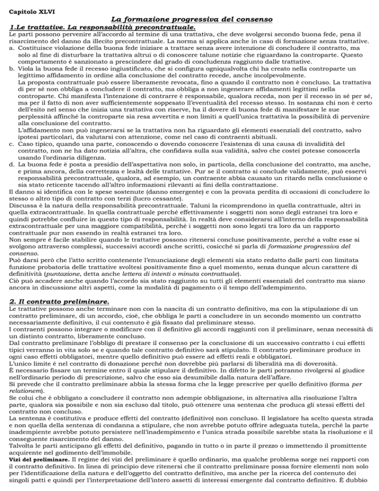 Capitolo XLVI La formazione progressiva del consenso 1.Le trattative. La responsabilità precontrattuale. Le parti possono pervenire all’accordo al termine di una trattativa, che deve svolgersi secondo buona fede, pena il risarcimento del danno da illecito precontrattuale. La norma si applica anche in caso di formazione senza trattative. a. Costituisce violazione della buona fede iniziare a trattare senza avere intenzione di concludere il contratto, ma solo al fine di disturbare la trattativa altrui o di conoscere talune notizie che riguardano la controparte. Questo comportamento è sanzionato a prescindere dal grado di concludenza raggiunto dalle trattative. b. Viola la buona fede il recesso ingiustificato, che si configura ogniqualvolta chi ha creato nella controparte un legittimo affidamento in ordine alla conclusione del contratto recede, anche incolpevolmente. La proposta contrattuale può essere liberamente revocata, fino a quando il contratto non è concluso. La trattativa di per sé non obbliga a concludere il contratto, ma obbliga a non ingenerare affidamenti legittimi nella controparte. Chi manifesta l’intenzione di contrarre è responsabile, qualora receda, non per il recesso in sé per sé, ma per il fatto di non aver sufficientemente soppesato ll’eventualità del recesso stesso. In sostanza chi non è certo dell’esito nel senso che inizia una trattativa con riserve, ha il dovere di buona fede di manifestare le sue perplessità affinché la controparte sia resa avvertita e non limiti a quell’unica trattativa la possibilità di pervenire alla conclusione del contratto. L’affidamento non può ingenerarsi se la trattativa non ha riguardato gli elementi essenziali del contratto, salvo ipotesi particolari, da valutarsi con attenzione, come nel caso di contraenti abituali. c. Caso tipico, quando una parte, conoscendo o dovendo conoscere l’esistenza di una causa di invalidità del contratto, non ne ha dato notizia all’altra, che confidava sulla sua validità, salvo che costei potesse conoscerla usando l’ordinaria diligenza. d. La buona fede è posta a presidio dell’aspettativa non solo, in particola, della conclusione del contratto, ma anche, e prima ancora, della correttezza e lealtà delle trattative. Pur se il contratto si conclude validamente, può esservi responsabilità precontrattuale, qualora, ad esempio, un contraente abbia causato un ritardo nella conclusione o sia stato reticente tacendo all’altro informazioni rilevanti ai fini della contrattazione. Il danno si identifica con le spese sostenute (danno emergente) e con la provata perdita di occasioni di concludere lo stesso o altro tipo di contratto con terzi (lucro cessante). Discussa è la natura della responsabilità precontrattuale. Taluni la ricomprendono in quella contrattuale, altri in quella extracontrattuale. In quella contrattuale perché effettivamente i soggetti non sono degli estranei tra loro e quindi potrebbe confluire in questo tipo di responsabilità. In realtà deve considerarsi all’interno della responsabilità extracontrattuale per una maggiore compatibilità, perché i soggetti non sono legati tra loro da un rapporto contrattuale pur non essendo in realtà estranei tra loro. Non sempre è facile stabilire quando le trattative possono ritenersi concluse positivamente, perché a volte esse si svolgono attraverso complessi, successivi accordi anche scritti, cosicché si parla di formazione progressiva del consenso. Può darsi però che l’atto scritto contenente l’enunciazione degli elementi sia stato redatto dalle parti con limitata funzione probatoria delle trattative svoltesi positivamente fino a quel momento, senza dunque alcun carattere di definitività (puntazione, detta anche lettera di intenti o minuta contrattuale). Ciò può accadere anche quando l’accordo sia stato raggiunto su tutti gli elementi essenziali del contratto ma siano ancora in discussione altri aspetti, come la modalità di pagamento o il tempo dell’adempimento. 2. Il contratto preliminare. Le trattative possono anche terminare non con la nascita di un contratto definitivo, ma con la stipulazione di un contratto preliminare, di un accordo, cioè, che obbliga le parti a concludere in un secondo momento un contratto necessariamente definitivo, il cui contenuto è già fissato dal preliminare stesso. I contraenti possono integrare o modificare con il definitivo gli accordi raggiunti con il preliminare, senza necessità di un distinto contratto, liberamente concluso. Dal contratto preliminare l’obbligo di prestare il consenso per la conclusione di un successivo contratto i cui effetti tipici verranno in vita solo se e quando tale contratto definitivo sarà stipulato. Il contratto preliminare produce in ogni caso effetti obbligatori, mentre quello definitivo può essere ad effetti reali e obbligatori. L’unico limite è nel contratto di donazione perché non dovrebbe più parlarsi di liberalità ma di doverosità. È necessario fissare un termine entro il quale stipulare il definitivo. In difetto le parti potranno rivolgersi al giudice nell’ordinario periodo di prescrizione, salvo che esso sia desumibile dalla natura dell’affare. Si prevede che il contratto preliminare abbia la stessa forma che la legge prescrive per quello definitivo (forma per relationem). Se colui che è obbligato a concludere il contratto non adempie obbligazione, in alternativa alla risoluzione l’altra parte, qualora sia possibile e non sia escluso dal titolo, può ottenere una sentenza che produca gli stessi effetti del contratto non concluso. La sentenza è costitutiva e produce effetti del contratto (definitivo) non concluso. Il legislatore ha scelto questa strada e non quella della sentenza di condanna a stipulare, che non avrebbe potuto offrire adeguata tutela, perché la parte inadempiente avrebbe potuto persistere nell’inadempimento e l’unica strada possibile sarebbe stata la risoluzione e il conseguente risarcimen