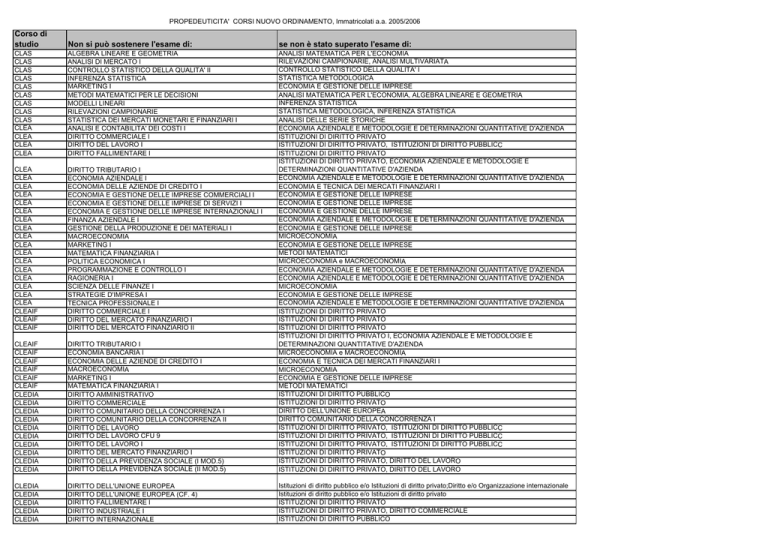 PROPEDEUTICITA' CORSI NUOVO ORDINAMENTO, Immatricolati a.a. 2005/2006 Corso di studio Non si può sostenere l'esame di: se non è stato superato l'esame di: CLAS CLAS CLAS CLAS CLAS CLAS CLAS CLAS CLAS CLEA CLEA CLEA CLEA ALGEBRA LINEARE E GEOMETRIA ANALISI DI MERCATO I CONTROLLO STATISTICO DELLA QUALITA' II INFERENZA STATISTICA MARKETING I METODI MATEMATICI PER LE DECISIONI MODELLI LINEARI RILEVAZIONI CAMPIONARIE STATISTICA DEI MERCATI MONETARI E FINANZIARI I ANALISI E CONTABILITA' DEI COSTI I DIRITTO COMMERCIALE I DIRITTO DEL LAVORO I DIRITTO FALLIMENTARE I CLEA CLEA CLEA CLEA CLEA CLEA CLEA CLEA CLEA CLEA CLEA CLEA CLEA CLEA CLEA CLEA CLEA CLEAIF CLEAIF CLEAIF DIRITTO TRIBUTARIO I ECONOMIA AZIENDALE I ECONOMIA DELLE AZIENDE DI CREDITO I ECONOMIA E GESTIONE DELLE IMPRESE COMMERCIALI I ECONOMIA E GESTIONE DELLE IMPRESE DI SERVIZI I ECONOMIA E GESTIONE DELLE IMPRESE INTERNAZIONALI I FINANZA AZIENDALE I GESTIONE DELLA PRODUZIONE E DEI MATERIALI I MACROECONOMIA MARKETING I MATEMATICA FINANZIARIA I POLITICA ECONOMICA I PROGRAMMAZIONE E CONTROLLO I RAGIONERIA I SCIENZA DELLE FINANZE I STRATEGIE D'IMPRESA I TECNICA PROFESSIONALE I DIRITTO COMMERCIALE I DIRITTO DEL MERCATO FINANZIARIO I DIRITTO DEL MERCATO FINANZIARIO II CLEAIF CLEAIF CLEAIF CLEAIF CLEAIF CLEAIF CLEDIA CLEDIA CLEDIA CLEDIA CLEDIA CLEDIA CLEDIA CLEDIA CLEDIA CLEDIA DIRITTO TRIBUTARIO I ECONOMIA BANCARIA I ECONOMIA DELLE AZIENDE DI CREDITO I MACROECONOMIA MARKETING I MATEMATICA FINANZIARIA I DIRITTO AMMINISTRATIVO DIRITTO COMMERCIALE DIRITTO COMUNITARIO DELLA CONCORRENZA I DIRITTO COMUNITARIO DELLA CONCORRENZA II DIRITTO DEL LAVORO DIRITTO DEL LAVORO CFU 9 DIRITTO DEL LAVORO I DIRITTO DEL MERCATO FINANZIARIO I DIRITTO DELLA PREVIDENZA SOCIALE (I MOD.5) DIRITTO DELLA PREVIDENZA SOCIALE (II MOD.5) ANALISI MATEMATICA PER L'ECONOMIA RILEVAZIONI CAMPIONARIE, ANALISI MULTIVARIATA CONTROLLO STATISTICO DELLA QUALITA' I STATISTICA METODOLOGICA ECONOMIA E GESTIONE DELLE IMPRESE ANALISI MATEMATICA PER L'ECONOMIA, ALGEBRA LINEARE E GEOMETRIA INFERENZA STATISTICA STATISTICA METODOLOGICA, INFERENZA STATISTICA ANALISI DELLE SERIE STORICHE ECONOMIA AZIENDALE E METODOLOGIE E DETERMINAZIONI QUANTITATIVE D'AZIENDA ISTITUZIONI DI DIRITTO PRIVATO ISTITUZIONI DI DIRITTO PRIVATO, ISTITUZIONI DI DIRITTO PUBBLICO ISTITUZIONI DI DIRITTO PRIVATO ISTITUZIONI DI DIRITTO PRIVATO, ECONOMIA AZIENDALE E METODOLOGIE E DETERMINAZIONI QUANTITATIVE D'AZIENDA ECONOMIA AZIENDALE E METODOLOGIE E DETERMINAZIONI QUANTITATIVE D'AZIENDA ECONOMIA E TECNICA DEI MERCATI FINANZIARI I ECONOMIA E GESTIONE DELLE IMPRESE ECONOMIA E GESTIONE DELLE IMPRESE ECONOMIA E GESTIONE DELLE IMPRESE ECONOMIA AZIENDALE E METODOLOGIE E DETERMINAZIONI QUANTITATIVE D'AZIENDA ECONOMIA E GESTIONE DELLE IMPRESE MICROECONOMIA ECONOMIA E GESTIONE DELLE IMPRESE METODI MATEMATICI MICROECONOMIA e MACROECONOMIA ECONOMIA AZIENDALE E METODOLOGIE E DETERMINAZIONI QUANTITATIVE D'AZIENDA ECONOMIA AZIENDALE E METODOLOGIE E DETERMINAZIONI QUANTITATIVE D'AZIENDA MICROECONOMIA ECONOMIA E GESTIONE DELLE IMPRESE ECONOMIA AZIENDALE E METODOLOGIE E DETERMINAZIONI QUANTITATIVE D'AZIENDA ISTITUZIONI DI DIRITTO PRIVATO ISTITUZIONI DI DIRITTO PRIVATO ISTITUZIONI DI DIRITTO PRIVATO ISTITUZIONI DI DIRITTO PRIVATO I, ECONOMIA AZIENDALE E METODOLOGIE E DETERMINAZIONI QUANTITATIVE D'AZIENDA MICROECONOMIA e MACROECONOMIA ECONOMIA E TECNICA DEI MERCATI FINANZIARI I MICROECONOMIA ECONOMIA E GESTIONE DELLE IMPRESE METODI MATEMATICI ISTITUZIONI DI DIRITTO PUBBLICO ISTITUZIONI DI DIRITTO PRIVATO DIRITTO DELL'UNIONE EUROPEA DIRITTO COMUNITARIO DELLA CONCORRENZA I ISTITUZIONI DI DIRITTO PRIVATO, ISTITUZIONI DI DIRITTO PUBBLICO ISTITUZIONI DI DIRITTO PRIVATO, ISTITUZIONI DI DIRITTO PUBBLICO ISTITUZIONI DI DIRITTO PRIVATO, ISTITUZIONI DI DIRITTO PUBBLICO ISTITUZIONI DI DIRITTO PRIVATO ISTITUZIONI DI DIRITTO PRIVATO, DIRITTO DEL LAVORO ISTITUZIONI DI DIRITTO PRIVATO, DIRITTO DEL LAVORO CLEDIA CLEDIA CLEDIA CLEDIA CLEDIA DIRITTO DELL'UNIONE EUROPEA DIRITTO DELL'UNIONE EUROPEA (CF. 4) DIRITTO FALLIMENTARE I DIRITTO INDUSTRIALE I DIRITTO INTERNAZIONALE Istituzioni di diritto pubblico e/o Istituzioni di diritto privato;Diritto e/o Organizzazione internazionale Istituzioni di diritto pubblico e/o Istituzioni di diritto privato ISTITUZIONI DI DIRITTO PRIVATO ISTITUZIONI DI DIRITTO PRIVATO, DIRITTO COMMERCIALE ISTITUZIONI DI DIRITTO PUBBLICO PROPEDEUTICITA' CORSI NUOVO ORDINAMENTO, Immatricolati a.a. 2005/2006 Corso di studio Non si può sostenere l'esame di: se non è stato superato l'esame di: CLEDIA DIRITTO INTERNAZIONALE DELL'ECONOMIA I Istituzioni di diritto pubblico e/o Istituzioni di diritto privato;Diritto e/o Organizzazione internazionale CLEDIA CLEDIA CLEDIA CLEDIA CLEDIA CLEDIA DIRITTO INTERNAZIONALE DELL'ECONOMIA II DIRITTO INTERNAZIONALE I DIRITTO INTERNAZIONALE II DIRITTO PUBBLICO REGIONALE I DIRITTO SINDACALE I DIRITTO SINDACALE II CLEDIA DIRITTO TRIBUTARIO CLEDIA DIRITTO TRIBUTARIO CLEDIA CLEDIA CLEDIA CLEDIA CLEDIA CLEDIA CLEIM CLEIM CLEIM CLEIM CLEIM CLEIM CLEIM CLEIM CLEIM CLEIM CLEIM CLEIM CLEIM CLEIM CLEIM CLEIM CLEIM CLEIM CLEIM CLEIM CLEIM CLEIM CLEIM CLEIM CLEIM CLEIM CLEIM CLEIM CLEIM CLEIM CLEIM CLIPA CLIPA CLIPA CLIPA CLIPA CLIPA DIRITTO TRIBUTARIO I MACROECONOMIA ORGANIZZAZIONE INTERNAZIONALE I ORGANIZZAZIONE INTERNAZIONALE II SCIENZA DELLE FINANZE STATISTICA PER L'ECONOMIA I DIRITTO COMMERCIALE I DIRITTO COMMERCIALE II DIRITTO DEL LAVORO I DIRITTO TRIBUTARIO I DIRITTO TRIBUTARIO II ECONOMIA AZIENDALE I ECONOMIA BANCARIA I ECONOMIA BANCARIA II ECONOMIA DEL LAVORO I ECONOMIA DEL LAVORO II ECONOMIA DELLE AZIENDE DI CREDITO I ECONOMIA DELLO SVILUPPO I ECONOMIA DELLO SVILUPPO II ECONOMIA DELL'UNIONE EUROPEA I ECONOMIA DELL'UNIONE EUROPEA II ECONOMIA INDUSTRIALE I ECONOMIA INDUSTRIALE II ECONOMIA INTERNAZIONALE I ECONOMIA INTERNAZIONALE II ECONOMIA REGIONALE I ECONOMIA REGIONALE II FINANZA AZIENDALE I MACROECONOMIA MATEMATICA FINANZIARIA I POLITICA ECONOMICA I POLITICA ECONOMICA II SCIENZA DELLE FINANZE I SCIENZA DELLE F