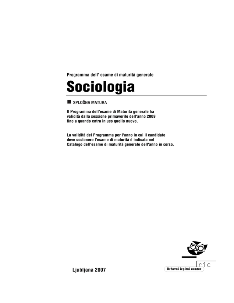 Programma dell' esame di maturità generale Sociologia SPLOŠNA MATURA Il Programma dell'esame di Maturità generale ha validità dalla sessione primaverile dell'anno 2009 fino a quando entra in uso quello nuovo. La validità del Programma per l'anno in cui il candidato deve sostenere l'esame di maturità è indicata nel Catalogo dell'esame di maturità generale dell'anno in corso. Ljubljana 2007 INDICE 1. Introduzione 4 2. Obiettivi dell’esame 5 3. Struttura dell’esame e criteri di valutazione 6 3.1 Schema d'esame 6 3.2 Tipi di esercizi e loro valutazione 7 3.3 Modalità di valutazione dell'esame e delle sue singole parti 8 4. Contenuti e obiettivi dell'esame 14 5. Indicazioni per la stesura della tesina 27 6. Candidati con necessità particolari 31 7. Bibliografia 32 8. Esempi di prove d'esame 33 Sociologia 3 1. INTRODUZIONE Il catalogo di sociologia è rivolto ai candidati che hanno scelto la sociologia come materia per l'esame di maturità liceale, indirizzo generale, e agli insegnanti che li prepareranno all'esame. 4 Sociologia 2. OBIETTIVI DELL’ESAME Il candidato/La candidata: dimostra di conoscere e comprendere i temi scelti di sociologia, conosce le nozioni e i metodi della sociologia, e' in grado di spiegare in modo autonomo le nozioni e i concetti della sociologia utilizzandone la terminologia e applicando a nuovi esempi il sapere acquisito. Il candidato/La candidata: analizza e interpreta i dati e le relative spiegazioni, utilizza i metodi della ricerca sociologica nella spiegazione dei fenomeni sociali, analizza i risultati delle ricerche e dimostra la loro applicabilità pratica, collega le conoscenze di sociologia con le conoscenze delle altre discipline sociali e umanistiche. Il candidato/La candidata: sa elaborare il piano della tesina, sa scegliere, paragonare e interpretare le fonti, sa analizzare la materia, presentarla in forma linguisticamente corretta, collegarne in maniera logica le varie parti e pervenire a delle conclusioni. Sociologia 5 3. STRUTTURA DELL’ESAME E CRITERI DI VALUTAZIONE 3.1 SCHEMA D'ESAME Parte scritta Prova d'esame Tempo a disposizione Percentuale di valutazione Valutazione Strumenti 1 120 minuti 40 % esterna 2 90 minuti 35 % esterna La penna stilografica o la penna a sfera 25 % interna Tesina L'esame di sociologia presenta un unico livello di difficoltà. Il voto viene definito in base alla valutazione del sapere esterna ed interna. La valutazione interna del sapere consiste nella valutazione della tesina ed equivale al 25 % del voto complessivo. La valutazione esterna del sapere consiste in una prova scritta ed equivale al 75 % del voto complessivo. La tesina La tesina è il risultato del lavoro individuale del candidato e consta di un minimo di 10 e un massimo di 20 pagine (contenenti circa 2000 battute per pagina - note e fonti incluse). Il candidato/La candidata sceglie il tema in accordo con il docente di riferimento al più tardi entro il termine previsto dal Regolamento per la stesura della tesina. Il termine ultimo per la consegna e la valutazione della tesina è definito dal Calendario degli esami di maturità generale per l'anno scolastico in corso. La tesina viene valutata dal docente di riferimento in base ai criteri di valutazione esposti nel catalogo di materia per gli esami di maturità liceale, indirizzo generale. La prova scritta (210 minuti) Prova d'esame 1: La prova d'esame comprende domande che richiedono competenze di tipo esegetico. Con questa prova si valutano le capacità del candidato, soprattutto di interpretazione e di analisi, di produzione di scritti con 6 Sociologia l’utilizzo della terminologia propria della sociologia e di analisi dei testi, nonché la capacità di pervenire a conclusioni. Tra le cinque domande di tipo esegetico proposte nella Prova d’esame 1, il candidato/la candidata sceglie e risponde a due domande. La lunghezza prevista per il tema d'esame e' un minimo di 300 parole e un massimo di 500 parole. Prova d'esame 2: La prova d'esame comprende domande strutturate che possono essere introdotte da varie fonti (testi specialistici, brani letterari, articoli di giornali, dati statistici ecc.). La Commissione statale della materia per l’esame di maturità liceale, indirizzo generale per la sociologia può, mediante una specifica circolare, comunicare alle scuole i contenuti che saranno obbligatori per gli esami, ossia i contenuti che non saranno oggetto di verifica alla fine dell'anno scolastico in corso. I contenuti che saranno d’obbligo o i contenuti che non rientreranno nell’esame di maturità vengono pubblicati prima dell’inizio dell’ultimo anno di studi per gli alunni che sosterranno l’esame di maturità. I suddetti contenuti vengono pubblicati il primo martedì del mese di febbraio dell’anno scolastico precedente all’esame di maturità alle ore 12.00 sul sito internet del Centro statale per gli esami (www.ric.si). Dopo tale data viene fatta pervenire alle scuole una circolare nella quale si comunicano i contenuti soggetti alla verifica nell’esame di maturità ossia vengono comunicati i contenuti che non rientreranno nell’esame di maturità. Tra i quattro temi proposti e che rientrano nel piano di studio della sociologia il candidato/la candidata è invitato/a a sceglierne due. Con la prova d’esame si valutano il sapere e la comprensione, ma anche la capacità di analisi e di interpretazione. 3.2 TIPI DI ESERCIZI E LORO VALUTAZIONE Prova d'esame Tipo di compito Valutazione 1 fino a 5 domande esegetiche I candidati rispondono a 2 domande. Ogni domanda vale 20 punti. 2 fino a 4 domande strutturate I candidati rispondono a 2 domande. Ogni domanda vale 17,5 punti. Tesina di maturità 25 punti Sociologia 7 3.3 MODALITÀ DI VALUTAZIONE DELL'ESAME E DELLE SUE SINGOLE PARTI Il voto complessivo viene calcolato tenendo conto dei singoli aspetti della verifica e del tipo di verifica del sapere, che si basa sui seguenti livelli tassonomici: Prova d'esame 1 Prova d'esame 2 Tesina