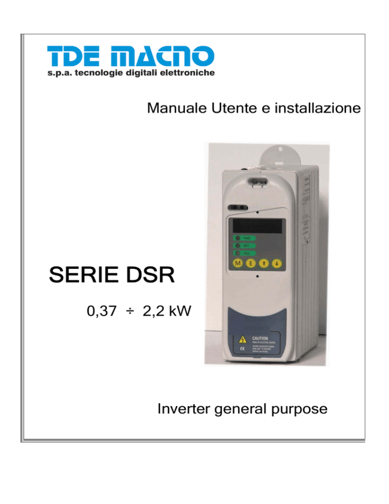 Manuale Utente e installazione SERIE DSR 0,37 ÷ 2,2 kW Inverter general purpose Vi ringraziamo per avere scelto questo prodotto TDE MACNO SPA. Saremo lieti di ricevere qualsiasi informazione che possa aiutarci a migliorare questo manuale. Prima dell'utilizzo del prodotto, leggere attentamente il capitolo relativo alle istruzioni di sicurezza. Durante il suo periodo di funzionamento conservate il manuale in un luogo sicuro e a disposizione del personale tecnico. La TDE MACNO SPA si riserva la facoltà di apportare modifiche e varianti a prodotti, dati, dimensioni, in qualsiasi momento, senza obbligo di preavviso. I dati indicati servono unicamente alla descrizione del prodotto e non devono essere intesi come proprietà assicurate nel senso legale. Tutti i diritti riservati. . Codice Edizione del Versione Software MADSRX0020I0 rev2.0 maggio 2009 0D.07-xx.00 Sommario Breve Paragrafo Sommario Istruzioni per la Sicurezza 1 Designazione del Tipo di inverter 3.1.2 Specifiche Elettriche 3.3.2 Specifiche Meccaniche 4.1 Denominazione dei morsetti di Potenza 5.2 Denominazione dei morsetti di Regolazione 5.3 Schemi Tipici di collegamento 5.4 Messa in Servizio Rapida 6.3 Liste Parametri 7.1 Indice Funzioni 10 Sommario 1. Istruzioni per la Sicurezza .............................................................................................................. - 1 1.1. 2. Generalità ...................................................................................................................................... - 5 2.1. 3. Tipo di alimentazione e collegamenti a terra ......................................................... - 4 Funzioni Standard ................................................................................................. - 6 - Descrizione Componenti e Specifiche ........................................................................................... - 8 3.1. Immagazzinaggio, Trasporto................................................................................. - 8 3.1.1 Generalità ...................................................................................................... - 8 3.1.2 Designazione del Tipo di Inverter .................................................................. - 9 3.1.3 Targhetta ..................................................................................................... - 10 - 3.2. Identificazione Componenti ................................................................................. - 10 - 3.3. Specifiche Generali ............................................................................................. - 12 3.3.1 Condizioni Ambientali e Normative ............................................................. - 12 3.3.2 Specifiche Elettriche .................................................................................... - 13 3.3.3 Corrente assorbita dall’inverter ................................................................... - 16 3.3.4 Precauzioni per l’uscita Inverter .................................................................. - 17 3.3.5 Parte di Regolazione e Controllo ................................................................. - 17 3.3.6 Precisione ................................................................................................... - 18 - 4. Montaggio .................................................................................................................................... - 19 4.1. Specifiche meccaniche ....................................................................................... - 19 4.1.1 Ingombro e distanze di montaggio .............................................................. - 19 - 4.2. Motori .................................................................................................................. - 20 4.2.1 Motori Asincroni AC..................................................................................... - 20 - 5. Collegamento Elettrico................................................................................................................. - 22 5.1. Accesso ai Morsetti per i collegamenti elettrici.................................................... - 22 - 5.2. Denominazione dei morsetti di Potenza .............................................................. - 22 5.2.1 Massima Sezione dei cavi di potenza ......................................................... - 23 5.2.2 Ponte Raddrizzatore e Circuito Intermedio ................................................. - 23 5.2.3 Ponte Inverter .............................................................................................. - 24 - 5.3. Denominazione dei morsetti di Regolazione ....................................................... - 26 5.3.1 Denominazione dei morsetti della scheda di Regolazione .......................... - 26 5.3.2 Descrizione Funzionalità Jumper ................................................................ - 27 5.3.3 Caratteristiche dei cavi di collegamento per la regolazione ........................ - 27 - 5.4. Schemi Tipici di Collegamento ............................................................................ - 28 5.4.1 Collegamento Inverter SERIE DSR ............................................................. - 28 5.4.2 Espansioni opzionali ................................................................................... - 29 5.4.3 Indicazioni Progettuali ................................................................................. - 30 5.4.4 Connessione in parallelo lato AC (ingresso) di più inverter ......................... - 31 - 5.5. Interfaccia seriale RS 485 ................................................................................... - 31 - 5.5.1 Generalità .................................................................................................... - 31 5.6. Protezioni ............................................................................................................ - 34 5.6.1 Fusibili estern