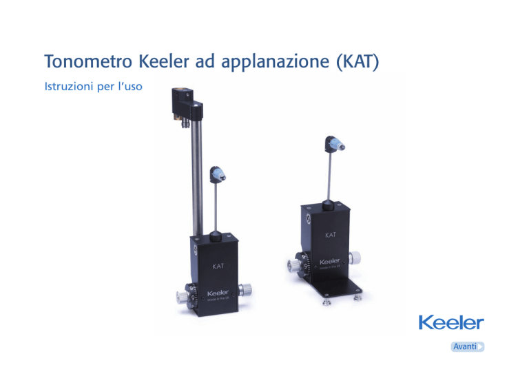 Tonometro Keeler ad applanazione (KAT) Istruzioni per l’uso Avanti Sommario 1. 2. Preparazione della lampada a fessura per esame con ingrandimento 10x 1.1 Breve descrizione dello strumento 1.2 Uso / finalità dello strumento 7.4 1.3 Come si misura la pressione intraoculare 7.4.1 Istruzioni per il paziente 1.4 Vantaggi di un tonometro Goldmann 7.4.2 Misurazione Simboli 3. Sicurezza Uso dello strumento/misurazione 8. Soluzionediproblemi 9. Informazionigeneraliesuggerimentiperlamisurazione 3.1 Normative 10. Astigmatismo 3.2 Avvertenze e Attenzione 11. Manutenzioneordinariadellostrumento 4. Puliziaedisinfezione 7.3 Introduzione 11.1 Controllo con cilindro di misurazione regolato su 0 4.1 Pulizia del corpo del tonometro 11.2 Controllo con cilindro di misurazione regolato su 2 4.2 Disinfezione dei prismi del tonometro 11.3 Controllo con braccio di calibrazione regolato su 6 5. Controllosulcampodelprisma 12. Servizioecalibrazione 6. ComponentideiKATtipoRetipoT 13. Caratteristichetecniche 7. Proceduradimisurazione 13.1 Condizioni di trasporto, stoccaggio e funzionamento 13.2 Caratteristiche tecniche 7.1 Montaggio sulla lampada a fessura 7.1.1 Tonometro Keeler ad applanazione (tipo T) 14. Accessoriegaranzia 7.1.2 Tonometro Keeler ad applanazione ‘fisso’ (tipo R) 15.Contatti 7.2 Preparazione del paziente Per andare direttamente alla sezione richiesta, fare clic sul sommario oppure utilizzare i tasti di navigazione ‘Avanti’ e ‘Indietro’ situati a destra. Facendo clic su ‘Home’ si torna a questa pagina. Nell’ambito della nostra politica di continuo sviluppo dei prodotti, ci riserviamo il diritto di modificare le caratteristiche tecniche in qualsiasi momento senza preavviso. Indietro Avanti 2 1. Introduzione Vi ringraziamo di aver scelto questo tonometro Keeler ad applanazione (KAT). 1.2 Uso / finalità dello strumento Il tonometro Keeler ad applanazione è indicato Prima di usare il vostro KAT, leggete attentamente questo per la misurazione della pressione intraoculare, manuale per assicurare l’incolumità del paziente e l’affidabilità facilitando l’esame e la diagnosi del glaucoma. delle misurazioni. Conservate al sicuro questo manuale per futura consultazione. 1.1 Breve descrizione dello strumento Il tonometro Keeler ad applanazione (KAT) è un accessorio adatto alla maggior parte delle lampade a fessura del tipo “illuminazione a Il tonometro Keeler ad applanazione funziona secondo il torre” e, grazie alla sua versatilità, si può “metodo Goldmann”, per cui la misurazione della pressione montare e usare il tonometro KAT con lampade intraoculare è data dalla forza necessaria per “appiattire” a fessura di varie marche. KAT tipo R (fisso) su lampada a fessura (applanare) un’area costante (3,06 mm) della cornea. Uno speciale prisma disinfettato (o monouso) è montato alla testina del Il KAT deve essere utilizzato solo da personale qualificato. Ai sensi tonometro e viene poi posizionato contro la cornea. delle leggi federali statunitensi, questo dispositivo può essere venduto soltanto da o su ordine di un medico. Usando un biomicroscopio-lampada a fessura con ingrandimento 10x e un filtro blu, l’esaminatore visualizza due semicerchi verdi Il fabbricante declina qualsiasi responsabilità e copertura in fluorescenti. Regolando il quadrante, si regola poi la forza garanzia se lo strumento viene in qualche modo manomesso o applicata alla testina del tonometro finché i bordi interni di in caso di mancata esecuzione della manutenzione ordinaria o questi semicerchi verdi non vengono a contatto l’uno con l’altro. qualora la manutenzione non venga eseguita secondo queste istruzioni Dato il contatto fisico con la cornea, è necessario applicare alla cornea del paziente un anestetico locale appropriato. del fabbricante. Home Indietro Avanti 3 1. Introduzione 1.3 Come si misura la pressione intraoculare 1.4 Vantaggi di un tonometro Goldmann La cornea viene appiattita da un prisma acrilico di misurazione, • Si può misurare la pressione intraoculare durante un esame di montato su un supporto anulare all’estremità del braccio del sensore del tonometro. È piatto, con bordi lisci o arrotondati per evitare danni alla cornea. routine con la lampada a fessura. • La deviazione standard tra misurazioni individuali è ≤ 0,5 mmHg circa. Il prisma di misurazione viene portato a contatto con l’occhio del paziente facendo avanzare la lampada a fessura. Quindi si gira la manopola del cilindro di misurazione per aumentare la pressione • Il valore è espresso in mmHg e letto direttamente sullo strumento. • Non è necessario tener conto della rigidità sclerale in quanto sull’occhio fino ad ottenere una superficie appiattita, uniforme il piccolo spostamento volumetrico (0,56 mm³) aumenta la e continua, di 3,06 mm di diametro (con un’area di 7,354 mm²). pressione intraoculare soltanto del 2,5% circa. Il prisma di duplicazione divide l’immagine e presenta le due • Non ci sono problemi di standardizzazione e calibrazione. sezioni semicircolari opposte a 3,06 mm (per ulteriori particolari vedere sezione 7.4.2 Procedura di misurazione). Posizionedelcilindro Forza dimisurazione mN Pressione kPammHg 1 9,81 1,33 10 2 19,62 2,66 20 3 29,43 39,9 30 4 39,24 53,2 40 5 49,05 66,5 50 La pressione intraoculare, espressa in 6 58,86 79,8 60 mmHg, si calcola moltiplicando la posizione 7 68,67 93,1 70 di misurazione del cilindro per dieci (per la 8 78,48 10,64 80 conversione da un’unità all’altra). Rapporto tra la pressione del cilindro di misurazione e la forza e pressione sulla superficie applanata. Home Indietro Avanti 4 2. Simboli Per le avvertenze e ulteriori informazioni, leggere le istruzioni per l’uso Il marchio CE indica che questo prodotto è stato testato 0088 e risulta conforme alle norme della direttiva 93/42/EEC sui dispositivi medici Consultare le istruzioni per l’uso Nome e indirizzo del fabbricante Tenere asciutto Fragile Materiale riciclabile Home 