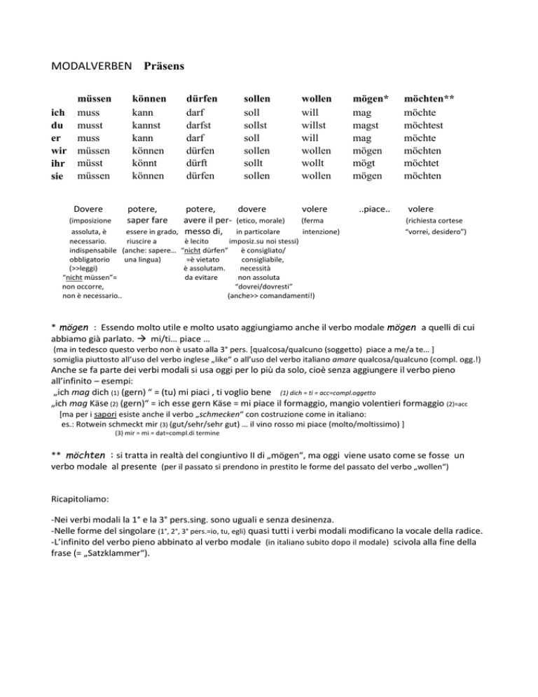 MODALVERBEN Präsens müssen ich muss du musst muss er wir müssen ihr müsst sie müssen Dovere können kann kannst kann können könnt können dürfen darf darfst darf dürfen dürft dürfen potere, saper fare sollen soll sollst soll sollen sollt sollen potere, dovere avere il per- (etico, morale) essere in grado, messo di, in particolare wollen will willst will wollen wollt wollen volere mögen* mag magst mag mögen mögt mögen möchten** möchte möchtest möchte möchten möchtet möchten ..piace.. (imposizione (ferma assoluta, è intenzione) necessario. riuscire a è lecito imposiz.su noi stessi) indispensabile (anche: sapere… “nicht dürfen” è consigliato/ obbligatorio una lingua) =è vietato consigliabile, (>>leggi) è assolutam. necessità “nicht müssen”= da evitare non assoluta non occorre, “dovrei/dovresti” non è necessario.. (anche>> comandamenti!) volere (richiesta cortese “vorrei, desidero”) * mögen : Essendo molto utile e molto usato aggiungiamo anche il verbo modale mögen a quelli di cui abbiamo già parlato. mi/ti… piace … (ma in tedesco questo verbo non è usato alla 3° pers. [qualcosa/qualcuno (soggetto) piace a me/a te… ] somiglia piuttosto all’uso del verbo inglese „like“ o all’uso del verbo italiano amare qualcosa/qualcuno (compl. ogg.!) Anche se fa parte dei verbi modali si usa oggi per lo più da solo, cioè senza aggiungere il verbo pieno all’infinito – esempi: „ich mag dich (1) (gern) “ = (tu) mi piaci , ti voglio bene (1) dich = ti = acc=compl.oggetto „ich mag Käse (2) (gern)“ = ich esse gern Käse = mi piace il formaggio, mangio volentieri formaggio (2)=acc [ma per i sapori esiste anche il verbo „schmecken“ con costruzione come in italiano: es.: Rotwein schmeckt mir (3) (gut/sehr/sehr gut) … il vino rosso mi piace (molto/moltissimo) ] (3) mir = mi = dat=compl.di termine ** möchten : si tratta in realtà del congiuntivo II di „mögen“, ma oggi viene usato come se fosse un verbo modale al presente (per il passato si prendono in prestito le forme del passato del verbo „wollen“) Ricapitoliamo: -Nei verbi modali la 1° e la 3° pers.sing. sono uguali e senza desinenza. -Nelle forme del singolare (1°, 2°, 3° pers.=io, tu, egli) quasi tutti i verbi modali modificano la vocale della radice. -L’infinito del verbo pieno abbinato al verbo modale (in italiano subito dopo il modale) scivola alla fine della frase (= „Satzklammer“). Per memorizzare ed esercitare i verbi modali e il loro uso (per ora al presente), provate a tradurre in tedesco queste frasi. Sarà un ripasso e un „pre-allenamento“ per la prossima lezione. Ricordatevi: il verbo all’infinito va alla fine della frase! NEGAZIONE: posizione di „nicht“/ „nichts“/ „kein“ La negazione „nicht“ non precede mai il verbo coniugato (qui modale)>> questa regola vale sempre! - di solito „nicht“ va posto verso la fine della frase, ma prima dell’infinito. - la doppia negazione italiana non…niente/nulla si traduce con un semplice „nichts“ >>posizione di solito verso fine frase ma prima dell‘infinito. >> queste sono indicazioni di massima, non sempre valide<< dipende dal contesto … >> (invece: non un/una…/nessun/nessuna.. = kein/keine… >>trattandosi di articolo indeterminativo negativo mantiene la sua posizione prima del sostantivo a cui si riferisce) COMPLEMENTI: quando una frase contiene sia una complemento di tempo che un complemento di luogo, in tedesco di solito il complemento di tempo precede quello di luogo 1. Devi mangiare adesso! Non voglio mangiare niente (nichts). Perché no? Devo andare a nuotare (schwimmen gehen). Vorrei anche fare immersioni (tauchen). Quando devi andare in piscina (ins Schwimmbad)? Vorremmo andare oggi pomeriggio in piscina. Allora (dann) non devi mangiare niente adesso! 2. Sapete fare i vostri compiti? Sapete fare i calcoli (rechnen=fare i calcoli) ? Sì, sappiamo fare i nostri compiti. E tu? Vuoi fare i tuoi compiti ? NO. Allora (dann) non puoi giocare. 3. Vorrei bere un bicchiere d’acqua, per favore! Vuoi/vorresti anche mangiare qualcosa (etwas)? Sì, volentieri. Posso avere una mela (r Apfel) e una pera (e Birne)? Ti (dir) possiamo dare anche due uova (s Ei, -er). Grazie! Sì, vorrei anche quattro uova. Non devi mangiare così tante (nicht so viele) uova! 4. Sai cavalcare (reiten) ? no, io non so cavalcare. E i tuoi amici? Sanno cavalcare? Sì, sanno cavalcare molto bene! Ma i loro cavalli (s Pferd, -e) sanno anche saltare (springen) ? 5. Adesso dobbiamo andare a casa (nach Hause) . Dovete aprire ancora i regali (s Geschenk, -e)! 6. Puoi darmi (mir) il libro? Voglio studiare. Sai parlare tedesco? Non molto bene. So leggere le parole. Tu sai capire l’inglese (Englisch) ? so fare meglio i calcoli !