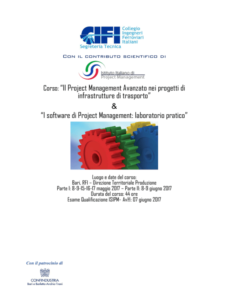 Con il contributo scientifico di Corso: “Il Project Management Avanzato nei progetti di infrastrutture di trasporto” & “I software di Project Management: laboratorio pratico” Luogo e date del corso: Bari, RFI – Direzione Territoriale Produzione Parte I: 8-9-15-16-17 maggio 2017 – Parte II: 8-9 giugno 2017 Durata del corso: 44 ore Esame Qualificazione ISIPM- Av®: 07 giugno 2017 Con il patrocinio di Indice Premessa ........................................................................................................................... 3 Obiettivi del corso .......................................................................................................... 4 Programma del corso ................................................................................................... 8 Crediti Formativi Professionali.................................................................................... 14 Costo del corso ............................................................................................................. 15 Modalità d’iscrizione ................................................................................................... 17 Modulo d’iscrizione ...................................................................................................... 18 Presentazione del CIFI ................................................................................................. 20 Riepilogo del programma del corso CIFI-ISIPM ................................................... 22 Esame “Qualificazione Project Management ISIPM-AV®”e Certificazione del Project Manager UNI 11648 (con iscrizione al Registro ACCREDIA valido in tutta la Unione Europea) ....................................................................................... 23 Iscritti al corso privi del requisito di accesso all’esame ISIPM-AV®” .............. 24 2/24 Premessa Il Collegio degli Ingegneri Ferroviari Italiani, associazione tecnica e professionale costituita nell’anno 1899, organizza il corso “Il Project Management Avanzato nei progetti di infrastrutture di trasporto” e “I software di Project Management: laboratorio pratico”: L’iniziativa nasce dalla necessità di: • diffondere la cultura del project management in contesti complessi quali il settore ferroviario o delle infrastrutture più in generale; • supportare l’imprescindibile esigenza per le aziende, di conciliare tempi, costi e qualità dei prodotti e dei servizi offerti; • supportare le Istituzioni stesse che cercano di dare maggior valore alla professione del Project Manager. Ne sono la testimonianza: o l’emanazione da parte di ANAC delle Linee Guida n. 3 di attuazione del D.Lgs. 18 aprile 2016, n. 50, recanti “Nomina, ruolo e compiti del Responsabile Unico del Procedimento per l’affidamento di appalti e concessioni”; o la pubblicazione della Norma UNI 11648 che definisce i requisiti di conoscenza, abilità e competenza nonché i requisiti relativi all'attività professionale del Project Manager; o la pubblicazione in "Banca Dati Accredia - Figure Professionali certificate" dei riferimenti relativi ai Project Manager professionisti. Il corso ha ricevuto la concessione del patrocinio di: Confindustria Bari e BAT, •rappresentare le imprese associate nei rapporti con le Istituzioni, la Pubblica Amministrazione, le Organizzazioni economiche, politiche, sindacali, sociali e con vari enti pubblici e privati; 3/24 Obiettivi del corso Il corso di “Il Project Management Avanzato nei progetti di infrastrutture di trasporto” e “I software di Project Management: laboratorio pratico” è finalizzato a: completare la preparazione sulle conoscenze di Gestione Progetti (project management) con lo studio approfondito dei processi secondo le linee guida fornite dalla Norma UNI ISO 21500 e sulle abilità nell’applicazione delle tecniche di project management, anche utilizzando strumenti software di supporto; acquisire una qualificazione di livello superiore rispetto alla ISIPM-Base® ed utilizzabile anche in un percorso orientato alle certificazioni del Project Manager rilasciate da Organismi di Certificazione accreditati (CEPAS e AICQ-SICEV hanno riconosciuto la qualificazione ISIPM-AV® come equivalente all’esame scritto con accesso diretto all’esame orale, volto alla verifica delle competenze); conoscere esempi applicativi di integrazione tra Sistemi di gestione della qualità e Project Management nelle attività di costruzione, gestione e manutenzione delle linee ferroviarie, con il caso applicativo dell’assistenza di Italferr alle Ferrovie d’Etiopia; Analizzare l’applicazione della teoria ai progetti ferroviari tecnologici internazionali, con la descrizione del Project Management applicato al progetto di attrezzaggio ERTMS alle ferrovie di Danimarca. Applicare le principali competenze tecniche e metodologiche di Project Management attraverso l’utilizzo di un software, mostrando le principali funzionalità̀. Il corso è articolato in 44 ore di formazione in aula e suddiviso in tre aree didattiche: La prima area didattica, è finalizzata al conseguimento della Qualificazione avanzata, trattata da docenti qualificati ISIPM, in possesso di certificazione 4/24 PMI, IPMA e/o PRINCE2. ISIPM è REP (Registered Education Provider) riconosciuto dal PMI (Project Management Institute). La seconda area didattica, basata su una metodologia pragmatica ed esperienziale, tratta casi applicativi descritti da docenti, selezionati dal CIFI, provenienti da società di ingegneria e aziende, di consolidata esperienza nel settore delle costruzioni e tecnologie ferroviarie: Italferr, società di ingegneria del Gruppo Ferrovie dello Stato Italiane, opera sul mercato italiano e internazionale nel campo dell’ingegneria dei trasporti ferroviari; Alstom ferroviaria, attiva nel settore della progettazione e realizzazione di soluzioni tecnologiche e applicazioni ferroviarie e metropolitane per il controllo in