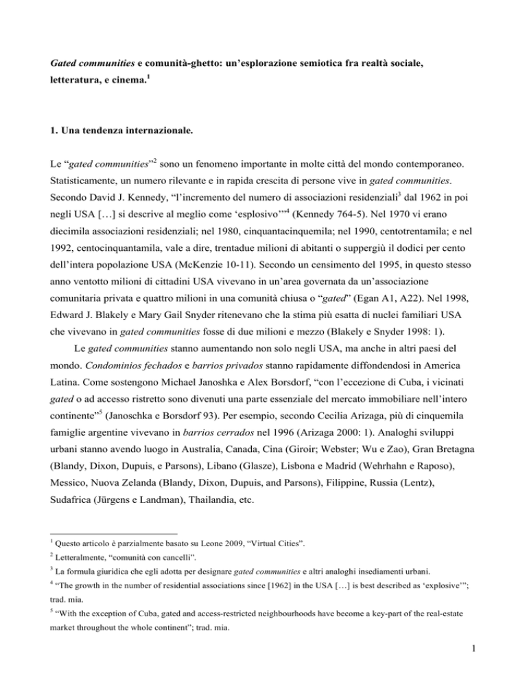 Gated communities e comunità-ghetto: un’esplorazione semiotica fra realtà sociale, letteratura, e cinema.1 1. Una tendenza internazionale. Le “gated communities”2 sono un fenomeno importante in molte città del mondo contemporaneo. Statisticamente, un numero rilevante e in rapida crescita di persone vive in gated communities. Secondo David J. Kennedy, “l’incremento del numero di associazioni residenziali3 dal 1962 in poi negli USA […] si descrive al meglio come ‘esplosivo’”4 (Kennedy 764-5). Nel 1970 vi erano diecimila associazioni residenziali; nel 1980, cinquantacinquemila; nel 1990, centotrentamila; e nel 1992, centocinquantamila, vale a dire, trentadue milioni di abitanti o suppergiù il dodici per cento dell’intera popolazione USA (McKenzie 10-11). Secondo un censimento del 1995, in questo stesso anno ventotto milioni di cittadini USA vivevano in un’area governata da un’associazione comunitaria privata e quattro milioni in una comunità chiusa o “gated” (Egan A1, A22). Nel 1998, Edward J. Blakely e Mary Gail Snyder ritenevano che la stima più esatta di nuclei familiari USA che vivevano in gated communities fosse di due milioni e mezzo (Blakely e Snyder 1998: 1). Le gated communities stanno aumentando non solo negli USA, ma anche in altri paesi del mondo. Condominios fechados e barrios privados stanno rapidamente diffondendosi in America Latina. Come sostengono Michael Janoshka e Alex Borsdorf, “con l’eccezione di Cuba, i vicinati gated o ad accesso ristretto sono divenuti una parte essenziale del mercato immobiliare nell’intero continente”5 (Janoschka e Borsdorf 93). Per esempio, secondo Cecilia Arizaga, più di cinquemila famiglie argentine vivevano in barrios cerrados nel 1996 (Arizaga 2000: 1). Analoghi sviluppi urbani stanno avendo luogo in Australia, Canada, Cina (Giroir; Webster; Wu e Zao), Gran Bretagna (Blandy, Dixon, Dupuis, e Parsons), Libano (Glasze), Lisbona e Madrid (Wehrhahn e Raposo), Messico, Nuova Zelanda (Blandy, Dixon, Dupuis, and Parsons), Filippine, Russia (Lentz), Sudafrica (Jürgens e Landman), Thailandia, etc. 1 Questo articolo è parzialmente basato su Leone 2009, “Virtual Cities”. 2 Letteralmente, “comunità con cancelli”. 3 La formula giuridica che egli adotta per designare gated communities e altri analoghi insediamenti urbani. 4 “The growth in the number of residential associations since [1962] in the USA […] is best described as ‘explosive’”; trad. mia. 5 “With the exception of Cuba, gated and access-restricted neighbourhoods have become a key-part of the real-estate market throughout the whole continent”; trad. mia. 1 2. Una questione interdisciplinare. Le gated communities possono essere considerate come uno degli insediamenti più caratteristici delle città postmoderne e globalizzate. Nell’ultimo decennio, esse hanno attirato l’attenzione di diverse discipline accademiche: gli economisti si sono concentrati sulle opportunità e sulle esternalità che le gated communities producono nelle città (Foldvary); i giuristi si sono occupati delle controversie accese dal modo in cui le gated communities mettono in crisi la distinzione fra i concetti giuridici di “privato” e “pubblico” (McKenzie; Kennedy; Stahilevitz); i sociologi hanno studiato la struttura socio-economica dei nuclei familiari che vivono in gated communities e formulato ipotesi sulle ragioni di tale scelta, soffermandosi specialmente sulla relazione fra crimine, sicurezza, e insediamenti gated (Arizaga 2000 e 2005); gli etnologi e gli antropologi hanno condotto osservazioni partecipanti in numerose comunità gated in giro per il mondo, sviluppando una comprensione qualitativa di questo fenomeno urbano (Setha 2001 e 2003); infine, gli studi urbani e l’urbanistica hanno soppesato gli inconvenienti delle gated communities, proponendo forme alternative di sviluppo urbano (Blakely e Snyder 1997 e 1998; Degoutin). È stata fondata una rete di ricerca sugli “immobili gated”, la quale ha prodotto diversi incontri e pubblicazioni internazionali. 3. Una prospettiva semiotica.6 Questo articolo non intende semplicemente aggiungere una prospettiva semiotica sulle gated communities a quelle che sono state già sviluppate da altre discipline, ma sostiene che tale prospettiva sia un prerequisito per condurre ricerca economica, giuridica, sociologica, e urbanistica su questo fenomeno. Per quanto riguarda l’etnologia e l’antropologia, la prospettiva della semiotica sulle gated communities condivide numerosi elementi con quelle di queste due discipline; tuttavia, la semiotica implica anche l’opportunità di studiare le gated communities attraverso l’analisi di vari testi di finzione che le hanno rappresentate nell’ultimo decennio — un’opportunità che è spesso trascurata dalla ricerca etnoantropologica. 3.1. Definizione delle gated communities. 6 La semiotica può essere definita, grosso modo, come la disciplina che studia i fenomeni di significazione e comunicazione. Per un’introduzione, Volli 2002. 2 Il primo contributo che la semiotica può offrire allo studio delle gated communities riguarda il problema della loro definizione. Che cosa sono le gated communities? Secondo David J. Kennedy, l’espressione “gated communities” — che egli adotta quale designazione giuridica delle gated communities e di altre forme analoghe di insediamento urbano — “[…] si riferisce generalmente a un vicinato i cui membri hanno deciso di isolarsi tramite un muro o di privatizzare le loro strade, piuttosto che a un condominio che non estende il proprio controllo oltre una strada chiusa e un parcheggio”7 (Kennedy 765). Secondo Edwrad J. Blakely e Mary Gail Snyder, “[…] le gated communities sono aree residenziali ad accesso ristretto, le quali privatizzano spazi normalmente pubblici”8 (Blakely e Snyder 1998: 53). Glasze, Webster, e Frantz ridefiniscono le gated communities come “[…] vicinati in cui il governo e la