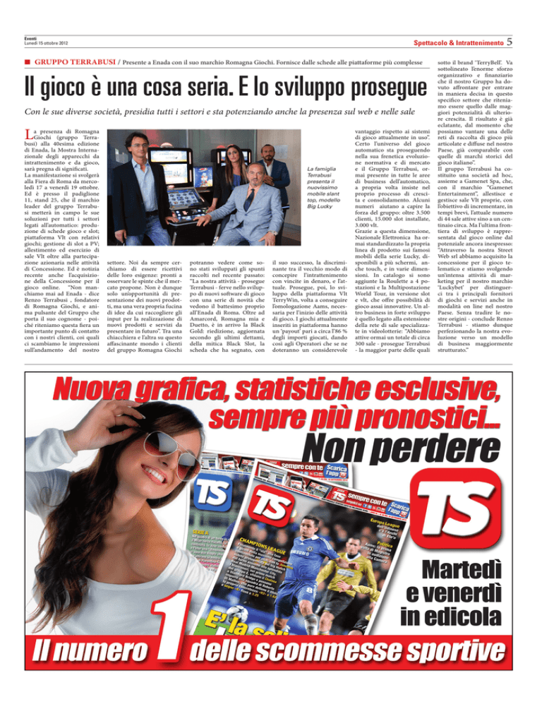 Eventi Lunedì 15 ottobre 2012 Spettacolo & Intrattenimento ■■ GRUPPO TERRABUSI / Presente a Enada con il suo marchio Romagna Giochi. Fornisce dalle schede alle piattaforme più complesse Il gioco è una cosa seria. E lo sviluppo prosegue Con le sue diverse società, presidia tutti i settori e sta potenziando anche la presenza sul web e nelle sale L a presenza di Romagna Giochi (gruppo Terrabusi) alla 40esima edizione di Enada, la Mostra Internazionale degli apparecchi da intrattenimento e da gioco, sarà pregna di significati. La manifestazione si svolgerà alla Fiera di Roma da mercoledì 17 a venerdì 19 ottobre. Ed è presso il padiglione 11, stand 25, che il marchio leader del gruppo Terrabusi metterà in campo le sue soluzioni per tutti i settori legati all’automatico: produzione di schede gioco e slot; piattaforma Vlt con relativi giochi; gestione di slot a PV; allestimento ed esercizio di sale Vlt oltre alla partecipazione azionaria nelle attività di Concessione. Ed è notizia recente anche l’acquisizione della Concessione per il gioco online. “Non manchiamo mai ad Enada - dice Renzo Terrabusi , fondatore di Romagna Giochi, e anima pulsante del Gruppo che porta il suo cognome - poiché riteniamo questa fiera un importante punto di contatto con i nostri clienti, coi quali ci scambiamo le impressioni sull’andamento del nostro La famiglia Terrabusi presenta il nuovissimo mobile slant top, modello Big Lucky settore. Noi da sempre cerchiamo di essere ricettivi delle loro esigenze: pronti a osservare le spinte che il mercato propone. Non è dunque solo un’opportunità di presentazione dei nuovi prodotti, ma una vera propria fucina di idee da cui raccogliere gli input per la realizzazione di nuovi prodotti e servizi da presentare in futuro”. Tra una chiacchiera e l’altra su questo affascinante mondo i clienti del gruppo Romagna Giochi potranno vedere come sono stati sviluppati gli spunti raccolti nel recente passato: “La nostra attività - prosegue Terrabusi - ferve nello sviluppo di nuovi software di gioco con una serie di novità che vedono il battesimo proprio all’Enada di Roma. Oltre ad Amarcord, Romagna mia e Duetto, è in arrivo la Black Gold: riedizione, aggiornata secondo gli ultimi dettami, della mitica Black Slot, la scheda che ha segnato, con il suo successo, la discriminante tra il vecchio modo di concepire l’intrattenimento con vincite in denaro, e l’attuale. Prosegue, poi, lo sviluppo della piattaforma Vlt TerryWin, volta a conseguire l’omologazione Aams, necessaria per l’inizio delle attività di gioco. I giochi attualmente inseriti in piattaforma hanno un ‘payout’ pari a circa l’86 % degli importi giocati, dando così agli Operatori che se ne doteranno un considerevole vantaggio rispetto ai sistemi di gioco attualmente in uso”. Certo l’universo del gioco automatico sta proseguendo nella sua frenetica evoluzione normativa e di mercato e il Gruppo Terrabusi, ormai presente in tutte le aree di business dell’automatico, a propria volta insiste nel proprio processo di crescita e consolidamento. Alcuni numeri aiutano a capire la forza del gruppo: oltre 3.500 clienti, 15.000 slot installate, 3.000 vlt. Grazie a questa dimensione, Nazionale Elettronica ha ormai standardizzato la propria linea di prodotto sui famosi mobili della serie Lucky, disponibili a più schermi, anche touch, e in varie dimensioni. In catalogo si sono aggiunte la Roulette a 4 postazioni e la Multipostazione World Tour, in versione slot e vlt, che offre possibilità di gioco assai innovative. Un altro business in forte sviluppo è quello legato alla estensione della rete di sale specializzate in videolotterie: “Abbiamo attive ormai un totale di circa 300 sale - prosegue Terrabusi - la maggior parte delle quali 5 sotto il brand ‘TerryBell’. Va sottolineato l’enorme sforzo organizzativo e finanziario che il nostro Gruppo ha dovuto affrontare per entrare in maniera decisa in questo specifico settore che riteniamo essere quello dalle maggiori potenzialità di ulteriore crescita. Il risultato è già eclatante, dal momento che possiamo vantare una delle reti di raccolta di gioco più articolate e diffuse nel nostro Paese, già comparabile con quelle di marchi storici del gioco italiano”. Il gruppo Terrabusi ha costituito una società ad hoc, assieme a Gamenet Spa, che, con il marchio “Gamenet Entertainment”, allestisce e gestisce sale Vlt proprie, con l’obiettivo di incrementare, in tempi brevi, l’attuale numero di 44 sale attive sino a un centinaio circa. Ma l’ultima frontiera di sviluppo è rappresentata dal gioco online dal potenziale ancora inespresso: “Attraverso la nostra Street Web srl abbiamo acquisito la concessione per il gioco telematico e stiamo svolgendo un’intensa attività di marketing per il nostro marchio ‘Luckybet’ per distinguerci tra i principali fornitori di giochi e servizi anche in modalità on line nel nostro Paese. Senza tradire le nostre origini - conclude Renzo Terrabusi - stiamo dunque perfezionando la nostra evoluzione verso un modello di business maggiormente strutturato.”