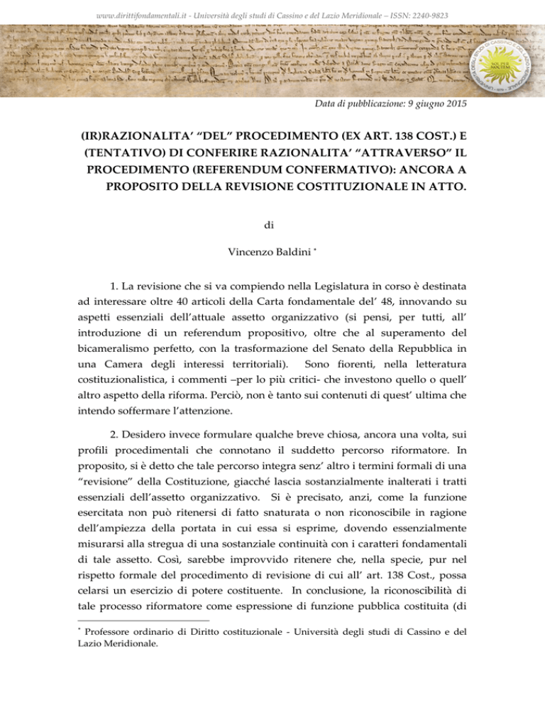 www.dirittifondamentali.it - Università degli studi di Cassino e del Lazio Meridionale – ISSN: 2240-9823 Data di pubblicazione: 9 giugno 2015 (IR)RAZIONALITA’ “DEL” PROCEDIMENTO (EX ART. 138 COST.) E (TENTATIVO) DI CONFERIRE RAZIONALITA’ “ATTRAVERSO” IL PROCEDIMENTO (REFERENDUM CONFERMATIVO): ANCORA A PROPOSITO DELLA REVISIONE COSTITUZIONALE IN ATTO. di Vincenzo Baldini * 1. La revisione che si va compiendo nella Legislatura in corso è destinata ad interessare oltre 40 articoli della Carta fondamentale del’ 48, innovando su aspetti essenziali dell’attuale assetto organizzativo (si pensi, per tutti, all’ introduzione di un referendum propositivo, oltre che al superamento del bicameralismo perfetto, con la trasformazione del Senato della Repubblica in una Camera degli interessi territoriali). Sono fiorenti, nella letteratura costituzionalistica, i commenti –per lo più critici- che investono quello o quell’ altro aspetto della riforma. Perciò, non è tanto sui contenuti di quest’ ultima che intendo soffermare l’attenzione. 2. Desidero invece formulare qualche breve chiosa, ancora una volta, sui profili procedimentali che connotano il suddetto percorso riformatore. In proposito, si è detto che tale percorso integra senz’ altro i termini formali di una “revisione” della Costituzione, giacché lascia sostanzialmente inalterati i tratti essenziali dell’assetto organizzativo. Si è precisato, anzi, come la funzione esercitata non può ritenersi di fatto snaturata o non riconoscibile in ragione dell’ampiezza della portata in cui essa si esprime, dovendo essenzialmente misurarsi alla stregua di una sostanziale continuità con i caratteri fondamentali di tale assetto. Così, sarebbe improvvido ritenere che, nella specie, pur nel rispetto formale del procedimento di revisione di cui all’ art. 138 Cost., possa celarsi un esercizio di potere costituente. In conclusione, la riconoscibilità di tale processo riformatore come espressione di funzione pubblica costituita (di * Professore ordinario di Diritto costituzionale - Università degli studi di Cassino e del Lazio Meridionale. www.dirittifondamentali.it - Università degli studi di Cassino e del Lazio Meridionale – ISSN: 2240-9823 revisione della Costituzione) legittima pienamente l’impiego del suddetto procedimento tipizzato. 3. Il tentativo che, ora, vuole compiersi è di provare ad analizzare con un metodo forse più formale quanto sta accadendo, partendo proprio dalla questione sulla natura del potere esercitato. Secondo un’accezione di tipo giuridico-positivo, non vi è dubbio che tale esercizio venga a qualificarsi come espressione del potere di revisione ex art. 138 Cost.. Nondimeno, se dal metodo di apprezzamento formale si passa ad uno –per dir così- sostanziale che prefigura la revisione ex art. 138 Cost. quale adattamento puntuale di singole disposizioni della Carta fondamentale (Mortati) allora il discorso sembra destinato a cambiare. Senza voler scomodare lo (scomodo di per sé) esercizio del potere costituente, non sembra potersi ragionevolmente contestare che si versa nel campo di una fattispecie “atipica”, che altri ordinamenti costituzionali (Svizzera, Spagna, etc.) tendono a qualificare come revisione “organica” della Costituzione, abbinandovi un iter procedimentale distinto e diverso da quello sancito per singoli adattamenti del testo costituzionale, certamente arricchito nella forza di legittimazione democratica (referendum automatico, scioglimento anticipato delle Assemblee parlamentari, etc.). A conferma che la legge costituzionale che si sta approvando ora presso le due Assemblee parlamentari assume tali connotati basti il fatto che qualora la riforma giunga in porto, si realizza un rilevante effetto di rimodellamento della consistenza rappresentativa del Senato che ridonda sui connotati della forma di governo parlamentare. 4. A favore della considerazione che la revisione costituzionale di cui all’ art. 138 Cost. riguardi soltanto adattamenti puntuali di disposizioni della Carta fondamentale vale il richiamo alla natura del referendum confermativo, ivi disciplinato. Al riguardo, sono due i profili di peculiare considerazione: il primo attiene alla natura eventuale (nel caso in cui in seconda deliberazione non sia approvato con il quorum dei due terzi dei componenti le singole Assemblee parlamentari) e facoltativa (nel caso ne facciano richiesta i soggetti legittimati dalla stessa norma costituzionale) di tale consultazione popolare. Il secondo elemento di rilievo attiene all’ assenza di ogni forma di controllo di ammissibilità del referendum. Sul primo versante, la norma si 2 www.dirittifondamentali.it - Università degli studi di Cassino e del Lazio Meridionale – ISSN: 2240-9823 spiega coerentemente in base al presupposto che revisione quale adattamento puntuale può ragionevolmente attraverso unicamente la volontà dell’organo rappresentativo, senza necessità di un surplus di legittimazione democratica attraverso l’intervento necessario dell’espressione di democrazia diretta. La stessa ratio –a parere di chi scrive- non avrebbe potuto reggere invece l’ipotesi di una riforma organica della Costituzione. Passando a considerare, invece, l’ assenza di ogni forma di controllo sulla struttura del quesito attinente al referendum costituzionale, sembra che una risposta possa ragionevolmente trovarsi, ancora una volta, nel presupposto “ideologico”, vale a dire nel postulato della revisione quale forma di adattamento puntuale del testo costituzionale (con la conseguenza che una pluralità di adattamenti avrebbe ragionevolmente richiesto distinte ed autonome procedure di revisione, scandite dall’ osservanza dell’ art. 138 Cost.). 5. L’ ordinamento costituzionale italiano –si è già detto- non sancisce alcun procedimento specifico per la revisione organica o totale della carta repubblicana. Si tratta, allo stato dell’esperienza, di una lacu