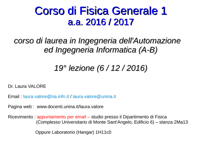 Corso di Fisica Generale 1 a.a. 2016 / 2017 corso di laurea in Ingegneria dell'Automazione ed Ingegneria Informatica (A-B) 19° lezione (6 / 12 / 2016) Dr. Laura VALORE Email : laura.valore@na.infn.it / laura.valore@unina.it Pagina web : www.docenti.unina.it/laura.valore Ricevimento : appuntamento per email – studio presso il Dipartimento di Fisica (Complesso Universitario di Monte Sant'Angelo, Edificio 6) – stanza 2Ma13 Oppure Laboratorio (Hangar) 1H11c0 Moto armonico semplice -xm xm 0 x Moto armonico : qualsiasi movimento che si ripeta ad intervalli regolari Moto armonico semplice : lo spostamento della particella rispetto all'origine in funzione del tempo t è di tipo sinusoidale puo' quindi essere descritto attraverso una funzione seno o coseno fase x(t) = xmcos(ωt + φ) spostamento angolo di fase o costante di fase ampiezza pulsazione o frequenza angolare Moto armonico semplice : spostamento in t=0, la particella si trova in x = +xm (estremità destra dell'asse x) negli istanti successivi, la particella inizia a spostarsi nel verso negativo delle x in t = T/2, la particella sarà arrivata in x = -xm (estremità sinistra dell'asse x) l'argomento della funzione coseno oscilla tra -1 e +1 → x(t) oscilla tra -xm ed xm → xm rappresenta l'ampiezza dell'oscillazione x(t) = xmcos(ωt + φ) spostamento ampiezza proseguendo ancora, la particella riprende a muoversi nel verso positivo delle x fino a completare il ciclo tornando in x = xm in corrispondenza di t = T (periodo) durante il ciclo, la particella transita 2 volte per la posizione x = 0 Moto armonico semplice : grafici grafico dello spostamento x(t) in funzione del tempo t x(t) = xmcos(ωt + φ) la velocità istantanea è la tangente alla curva Angolo di fase φ x(t) = xmcos(ωt + φ) l'argomento del coseno è detto fase del moto La costante φ è detta angolo di fase o costante di fase. fase Definisce la posizione della particella all'istante t=0 : → per t = 0, x(t=0) = xmcos(φ) φ=π rad φ=0 rad -xm xm φ=1/2 π rad φ=3/2 π rad x Pulsazione o frequenza angolare ω ω è legata alla frequenza (e di conseguenza al periodo) dell'oscillazione : ω = 2π/T = 2πƒ Dimostrazione : la posizione della particella deve essere la stessa in x(t) ed x(t + T) → posta la costante di fase φ = 0 per semplicità, xmcos(ωt) = xmcos(ω(t + T)) la funzione coseno restituisce lo stesso valore ogni 2π, quindi affinché sia vera l'equazione di sopra deve valere : ω(t + T) = ωt + 2π siccome T = 1/ƒ → ωT = 2π → ω = 2π/T → ω = 2πƒ Velocità nel moto armonico semplice la velocità varia in modulo e direzione durante il moto : ➢ v = 0 nei punti estremi ➢ v massima nel punto centrale v(t) = dx/dt = d/dt [xmcos(ωt + φ)] → ricordando che d/dx[cos(f(x))] = - f'(x)senf(x) v(t) = -ωxmsen(ωt + φ) la velocità nel moto armonico oscilla tra -ωxm e +ωxm. La quantità ωxm è detta estensione dell'oscillazione Accelerazione nel moto armonico semplice a(t) = dv(t)/dt = d/dt [-ωxmsen(ωt + φ)] → ricordando che d/dx(senf(x)) = f'(x)cosf(x) a(t) = -ω2xmcos(ωt + φ) l'ampiezza dell'accelerazione è ω2xm nella figura accanto sono messi a confronto spostamento, velocità ed accelerazione nel moto armonico semplice, ponendo per semplicità φ=0 x(t) = xmcos(ωt + φ) v(t) = - ωxmsen(ωt + φ) a(t) = - ω2xmcos(ωt + φ) a(t) è massima quando v(t) = 0, x(t) si trova ad uno dei due estremi ed il senso del moto si inverte Accelerazione nel moto armonico semplice a(t) = -ω2xmcos(ωt + φ) x(t) = xmcos(ωt + φ) a(t) = -ω2x(t) nel moto armonico semplice, ● l'accelerazione della particella è sempre di segno opposto allo spostamento x(t) ● il rapporto tra accelerazione e spostamento è una costante : a(t)/x(t) = -ω2 nel moto armonico semplice, l'accelerazione è proporzionale allo spostamento (ma di segno opposto) e le due quantità sono legate dal quadrato della pulsazione x(t) max valore positivo a(t) max valore negativo Forza nel moto armonico semplice usando la 2° legge di Newton : F = ma nel moto armonico semplice, a = -ω2x → F = (-mω2)x la forza esercitata sulla particella agisce in verso opposto allo spostamento : è una forza di richiamo! Abbiamo già incontrato una forza di richiamo → molla forza elastica → F = -kx dove k = mω2 il moto armonico semplice è il moto di una particella di massa m soggetta ad una forza proporzionale allo spostamento della particella ma di segno opposto F = -mω2x ω = √k/m pulsazione o frequenza angolare T = 2π √m/k (rapidità di oscillazione) periodo Esercizi 15.1 e 15.2 Esempio di conservazione dell'energia meccanica e bilancio tra energia cinetica e potenziale durante l'oscillazione del pendolo K ed U variano al variare dell'altezza del peso, ma Emec si conserva. In a) ed in e) l'energia è tutta cinetica : il peso ha velocità massima e passa per il punto piu' basso della traiettoria. In c) e g) all'opposto il peso è nel punto piu' alto della sua traiettoria, la velocità si è azzerata e l'energia è tutta potenziale (gravitazionale) Negli stati intermedi, metà dell'energia è cinetica e metà è potenziale Nel caso reale, in presenza di attrito, quest'ultimo dissiperebbe l'energia meccanica ed il pendolo alla fine si fermerebbe Moto armonico semplice : energia cinetica e potenziale sistema molla + blocco : Energia potenziale : U = ½ kx2 associata alla molla Energia cinetica : K = ½ mv2 associata al blocco m U(x) = ½kx2 = ½kxm2cos2(ωt+φ) da x(t) = xmcos(ωt+φ) K(x) = ½mv2 = ½m(-ωxm)2sen2(ωt+φ) da v(t) = -ωxmsen(ωt+φ) ricordando che per l'oscillatore armonico semplice lineare vale k/m = ω2 → K(x) = ½mω2xm2sen2(ωt+φ) = ½m(k/m)(xm)2sen2(ωt+φ) = ½ kxm2sen2(ωt+φ) Moto armonico semplice : energia meccanica U(x) = ½kxm2cos2(ωt+φ) K(x) = ½ kxm2sen2(ωt+φ) Emec = ½kxm2 Emec = U + K = ½ kxm2 [cos2(ωt+φ) + sen2(ωt+φ)] = ½ kxm2 costante =1 Se non ci sono attriti, agiscono solo forze conservative, Emec si conserva → K ed U si alternan