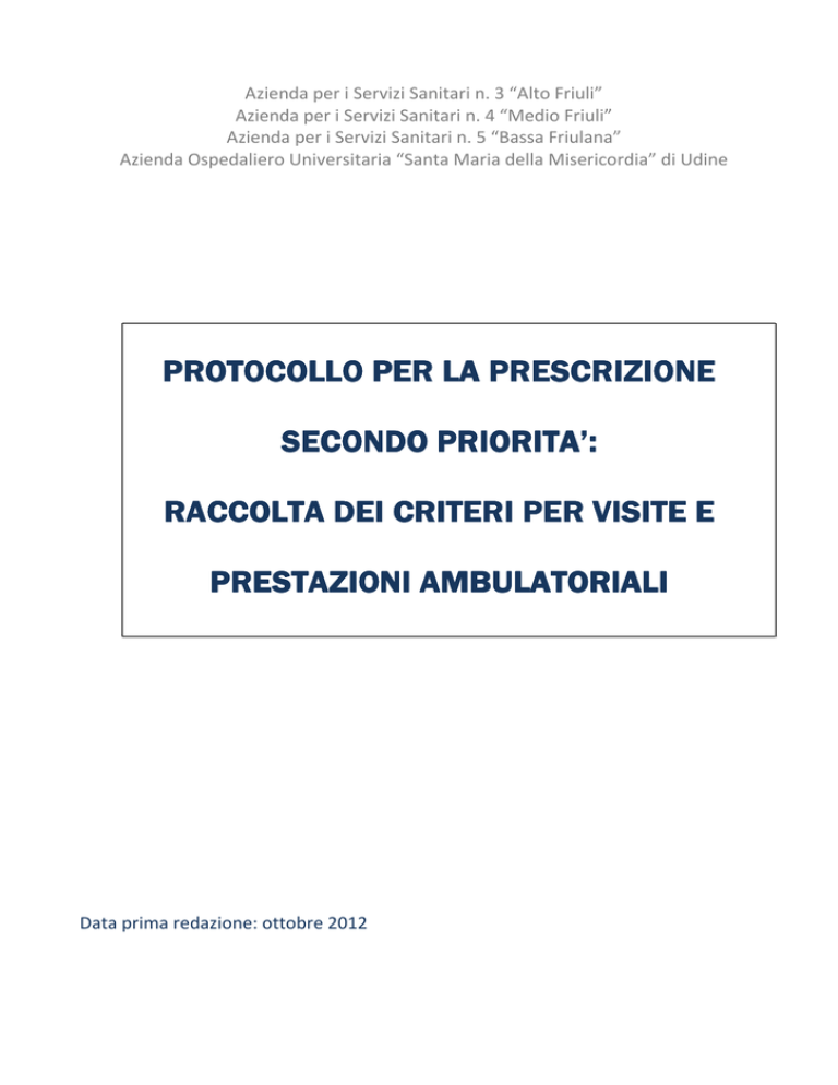 Azienda per i Servizi Sanitari n. 3 “Alto Friuli” Azienda per i Servizi Sanitari n. 4 “Medio Friuli” Azienda per i Servizi Sanitari n. 5 “Bassa Friulana” Azienda Ospedaliero Universitaria “Santa Maria della Misericordia” di Udine PROTOCOLLO PER LA PRESCRIZIONE SECONDO PRIORITA’: RACCOLTA DEI CRITERI PER VISITE E PRESTAZIONI AMBULATORIALI Data prima redazione: ottobre 2012 Azienda per i Servizi Sanitari n. 3 “Alto Friuli” Azienda per i Servizi Sanitari n. 4 “Medio Friuli” Azienda per i Servizi Sanitari n. 5 “Bassa Friulana” Azienda Ospedaliero Universitaria “Santa Maria della Misericordia” di Udine 1. Scopo Il presente documento è stato predisposto allo scopo di diffondere e rendere agevolmente accessibili le indicazioni operative e le priorità cliniche che sono state introdotte nel corso degli ultimi anni per ordinare la domanda di prestazioni specialistiche ambulatoriali nell’ambito dell’Area Vasta Udinese. I criteri di priorità che sono allegati alla presente raccolta sono stati adottati dalle Aziende sanitarie della provincia di Udine e dall’Azienda Ospedaliero-Universitaria di Udine al termine di percorsi che hanno coinvolto i professionisti delle specialità interessate (ospedalieri e territoriali), i Medici di Medicina Generale, oltre a personale delle Direzioni aziendali e, qualora interessati per la branca trattata, delle strutture private accreditate della provincia di Udine. Per le prestazioni specialistiche ambulatoriali critiche per tempi d’attesa e/o per numero di utenti in lista d’attesa, sono state individuate, secondo quanto stabilito dalla normativa nazionale e regionale, quattro classi di priorità, che si illustrano di seguito: Priorità U (urgente) B (breve) D (differibile) P (programmata) Inquadramento clinico I sintomi o il sospetto diagnostico sono riferiti a malattie gravi evolutive con danno alla salute se non trattate in tempi molto brevi (entro 24 ore) Prestazione la cui tempestiva esecuzione condiziona in un arco di tempo breve la prognosi a breve del paziente o influenza marcatamente il dolore, la disfunzione o la disabilità. Da eseguirsi entro 10 giorni Prestazione la cui tempestiva esecuzione non influenza significativamente la prognosi a breve ma è richiesta sulla base della presenza di dolore o di disfunzione o disabilità. Da eseguirsi entro 30 giorni per le visite e entro 60 giorni per le prestazioni strumentali Prestazione che può essere programmata in un maggiore arco di tempo in quanto non influenza la prognosi, il dolore, disfunzione, la disabilità. Da eseguirsi entro 180 giorni. Il tempo massimo di attesa per la visita cardiologica e l’ecografia addome in classe P è di 120 giorni. 2. Campo di applicazione Le prestazioni di specialistica ambulatoriale per le quali le Aziende sanitarie dell’Area Vasta Udinese hanno adottato criteri di priorità per l’accesso alle agende di prenotazione sono le seguenti: Visite (primo accesso) − Visita oculistica − Visita neurologica − Visita urologica − Visita medica per patologia pneumologia − Visita chirurgica per patologia vascolare − Visita cardiologica − Visita di chirurgia vertebro-midollare Prestazioni diagnostiche − Ecografia addominale − Prestazioni di endoscopia digestiva Raccolta criteri di priorità Area Vasta Udinese – ottobre 2012 2 Azienda per i Servizi Sanitari n. 3 “Alto Friuli” Azienda per i Servizi Sanitari n. 4 “Medio Friuli” Azienda per i Servizi Sanitari n. 5 “Bassa Friulana” Azienda Ospedaliero Universitaria “Santa Maria della Misericordia” di Udine − − − − − − Ecocolordoppler dei tronchi sovraortici, dei vasi periferici arteriosi e venosi ed aorta addominale Densitometria ossea Elettromiografia semplice Risonanza magnetica dell’encefalo e del tronco encefalico Risonanza magnetica della colonna vertebrale Diagnostica ecografica del capo e del collo Interventi chirurgici − Intervento di rimozione della cataratta 3. Destinatari I destinatari del presente documento sono: − Responsabili / Direttori delle strutture pubbliche e private accreditate che erogano le prestazioni oggetto dei criteri di priorità − Responsabili dei Distretti sanitari, Dipartimenti di Prevenzione, di Salute Mentale e delle Dipendenze − Medici di Medicina generale, Pediatri di Libera scelta, Medici di Continuità assistenziale − Medici specialisti dipendenti e convenzionati con il SSR − Referenti /coordinatori dei Centri Unici di Prenotazione − Responsabili degli Uffici Relazioni con il Pubblico 4. Modalità di svolgimento delle attività I medici prescrittori, all’atto della compilazione della ricetta per prescrizione di una prestazione oggetto della presente raccolta, sono tenuti a indicare la classe di priorità (U, B, D, P) che definisce il tempo massimo di attesa secondo la normativa vigente, tenendo conto dei criteri clinici contenuti nelle schede di seguito riportate. Note generali per la prescrizione • • • In attesa di ulteriori indirizzi regionali per l’applicazione dell’articolo 9 della legge regionale n. 7/2009, per quanto riguarda la prescrizione di esami diagnostici integrativi alla visita specialistica e la prescrizione di eventuali accertamenti e visite di controllo, si rinvia al documento di Area Vasta “Protocollo per la semplificazione della prescrizione delle prestazioni specialistiche”, consultabile nei siti aziendali. La richiesta di visita specialistica e/o di indagine strumentale deve essere corredata dalla diagnosi o dal sospetto diagnostico (art. 51 dell’Accordo Collettivo Nazionale per la disciplina dei rapporti con i M.M.G - 2005 e successive modifiche). Qualora il paziente, nel rispetto della normativa dei dati sensibili (privacy), non dia il consenso di esplicitare il quesito diagnostico nella ricetta, il prescrittore dovrà consegnare al paziente in busta chiusa il quesito clinico e dovrà riportare nella ricetta la seguente dicitura “quesito clinico riporta
