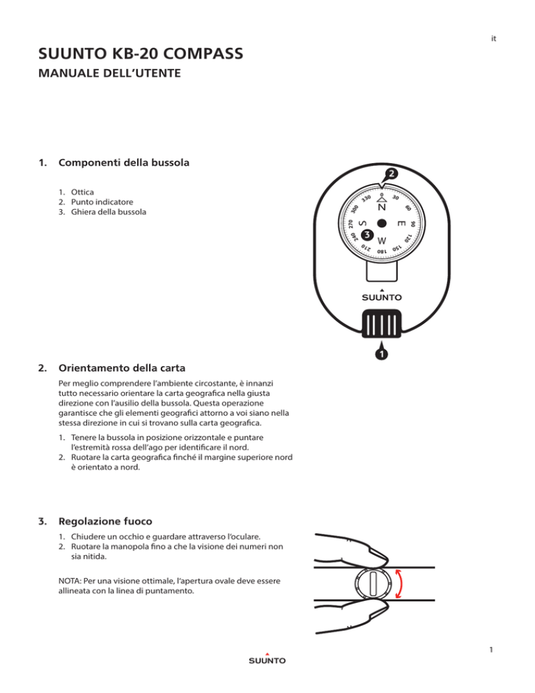 it SUUNTO KB-20 COMPASS MANUALE DELL’UTENTE 1. Componenti della bussola I I I I I I I I I I I I I I I I I I I I I 0 33 0 30 90 3 12 0 I 80 0 1 15 210 0 0 27 24 300 60 I I I I I I I I I I I I I I I I I I I I I I I I I I I I I I I I I I I I I I I I I I I I I I I I I I I I I I I I I I I I I I I I I I I I I I I 1. Ottica 2. Punto indicatore 3. Ghiera della bussola 2 I 1 2. Orientamento della carta Per meglio comprendere l’ambiente circostante, è innanzi tutto necessario orientare la carta geografica nella giusta direzione con l’ausilio della bussola. Questa operazione garantisce che gli elementi geografici attorno a voi siano nella stessa direzione in cui si trovano sulla carta geografica. 1. Tenere la bussola in posizione orizzontale e puntare l’estremità rossa dell’ago per identificare il nord. 2. Ruotare la carta geografica finché il margine superiore nord è orientato a nord. 3. Regolazione fuoco 1. Chiudere un occhio e guardare attraverso l‘oculare. 2. Ruotare la manopola fino a che la visione dei numeri non sia nitida. NOTA: Per una visione ottimale, l‘apertura ovale deve essere allineata con la linea di puntamento. 1 4. Definizione dell’azimut 1. Tenere entrambi gli occhi aperti e guardare attraverso l‘oculare in direzione dell‘obiettivo. Un‘illusione ottica crea una corrispondenza tra obiettivo e linea di puntamento consentendo una lettura precisa. 2. Leggere il valore indicato dalla linea di puntamento. A La scala principale definisce l’azimut tra voi e il punto di arrivo. La scala secondaria definisce il controazimut tra il punto di arrivo e voi. NOTA: SE I PROPRI OCCHI NON SONO PERFETTAMENTE PARALLELI, COME IN CASO DI ETEROFORIA, POTREBBE ESSERE NECESSARIO PUNTARE CON UN SOLO OCCHIO. VERIFICARE PREVENTIVAMENTE TALE EVENTUALITÀ ESEGUENDO UNA MISURAZIONE CON ENTRAMBI GLI OCCHI APERTI. POI CHIUDERE L’OCCHIO LIBERO MENTRE SI GUARDA L’OGGETTO. SE LA LETTURA CAMBIA NOTEVOLMENTE, USARE UN SOLO OCCHIO PER PUNTARE L’OGGETTO ED EFFETTUARE LA MISURAZIONE. 190 10 180 0 170 350 5. Triangolazione E’ possibile individuare due o più oggetti e utilizzare la triangolazione per definire in modo preciso il punto in cui ci si trova. E S 1 2 18 0 90 90 0 B 1 0 0 18 1. Eseguire il rilevamento inverso di almeno due oggetti visibili dalla propria posizione ed indicati sulla mappa. 2. Con goniometro e righello, tracciare sulla mappa le due linee direzionali dalla posizione degli oggetti in base alle misurazioni effettuate. 3. Valutare la propria posizione in base al punto di intersezione delle due linee. N W 2 2 6. Manutenzione Per la pulizia utilizzare solo acqua dolce e detergente delicato. Pulire regolarmente la bussola. Per pulire l‘oculare, svitare la manopola fino ad estrarla completamente. Sciacquare la cavità interna con acqua. Eliminare la polvere e l‘acqua in eccesso con un bastoncino di ovatta. Lasciare asciugare completamente l‘unità prima di riassemblarla. Temperatura di funzionamento/conservazione: -30° C - +60° C / -22° F - +140° F ATTENZIONE: NON USARE ALCUN TIPO DI SOLVENTE. ATTENZIONE: NON USARE INSETTIFUGHI. ATTENZIONE: EVITARE URTI E CADUTE. © Suunto Oy 2/2014. Tutti i diritti riservati. Prodotto soggetto a modifiche senza preavviso. Suunto è un marchio registrato di Suunto Oy. SUUNTO CUSTOMER SUPPORT 1.www.suunto.com/support www.suunto.com/mysuunto 2.support@suunto.com 3.AUSTRALIA +61 1800 240 498 AUSTRIA +43 720 883 104 CANADA +1 800 267 7506 FINLAND +358 9 4245 0127 FRANCE +33 4 81 68 09 26 GERMANY +49 89 3803 8778 ITALY +39 02 9475 1965 JAPAN +81 3 4520 9417 NETHERLANDS +31 1 0713 7269 NEW ZEALAND +64 9887 5223 RUSSIA +7 499 918 7148 SPAIN +34 91 11 43 175 SWEDEN +46 8 5250 0730 SWITZERLAND +41 44 580 9988 UK +44 20 3608 0534 USA +1 855 258 0900 3