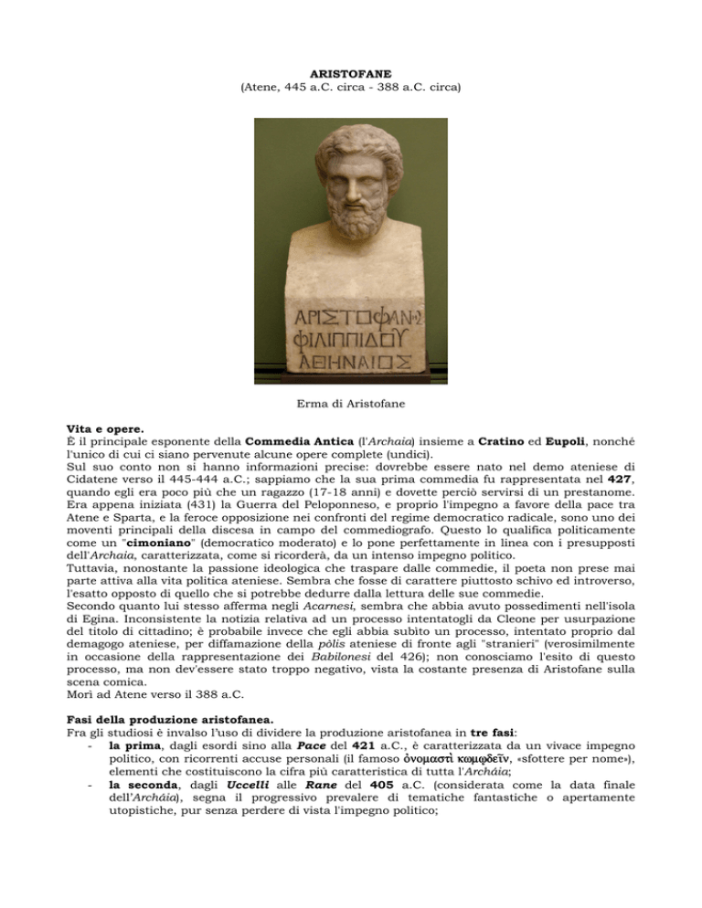 ARISTOFANE (Atene, 445 a.C. circa - 388 a.C. circa) Erma di Aristofane Vita e opere. È il principale esponente della Commedia Antica (l'Archaia) insieme a Cratino ed Eupoli, nonché l'unico di cui ci siano pervenute alcune opere complete (undici). Sul suo conto non si hanno informazioni precise: dovrebbe essere nato nel demo ateniese di Cidatene verso il 445-444 a.C.; sappiamo che la sua prima commedia fu rappresentata nel 427, quando egli era poco più che un ragazzo (17-18 anni) e dovette perciò servirsi di un prestanome. Era appena iniziata (431) la Guerra del Peloponneso, e proprio l'impegno a favore della pace tra Atene e Sparta, e la feroce opposizione nei confronti del regime democratico radicale, sono uno dei moventi principali della discesa in campo del commediografo. Questo lo qualifica politicamente come un "cimoniano" (democratico moderato) e lo pone perfettamente in linea con i presupposti dell'Archaia, caratterizzata, come si ricorderà, da un intenso impegno politico. Tuttavia, nonostante la passione ideologica che traspare dalle commedie, il poeta non prese mai parte attiva alla vita politica ateniese. Sembra che fosse di carattere piuttosto schivo ed introverso, l'esatto opposto di quello che si potrebbe dedurre dalla lettura delle sue commedie. Secondo quanto lui stesso afferma negli Acarnesi, sembra che abbia avuto possedimenti nell'isola di Egina. Inconsistente la notizia relativa ad un processo intentatogli da Cleone per usurpazione del titolo di cittadino; è probabile invece che egli abbia subìto un processo, intentato proprio dal demagogo ateniese, per diffamazione della pòlis ateniese di fronte agli "stranieri" (verosimilmente in occasione della rappresentazione dei Babilonesi del 426); non conosciamo l'esito di questo processo, ma non dev'essere stato troppo negativo, vista la costante presenza di Aristofane sulla scena comica. Morì ad Atene verso il 388 a.C. Fasi della produzione aristofanea. Fra gli studiosi è invalso l’uso di dividere la produzione aristofanea in tre fasi: - la prima, dagli esordi sino alla Pace del 421 a.C., è caratterizzata da un vivace impegno politico, con ricorrenti accuse personali (il famoso o\nomastì kwm§de_n, «sfottere per nome»), elementi che costituiscono la cifra più caratteristica di tutta l'Archáia; - la seconda, dagli Uccelli alle Rane del 405 a.C. (considerata come la data finale dell’Archáia), segna il progressivo prevalere di tematiche fantastiche o apertamente utopistiche, pur senza perdere di vista l'impegno politico; la terza, posteriore al 405 a.C. (e dunque alla fine della guerra peloponnesiaca) preannuncia ormai temi e stile della cosiddetta Commedia di Mezzo, se non addirittura della Commedia Nuova, con la sua rinuncia definitiva all’impegno politico e il suo ripiegamento su soluzioni di comicità utopica o su trame svincolate da ogni aggancio con la realtà contemporanea. Gli studiosi si sono a lungo interrogati sulle cause di tale involuzione: già nelle Nuvole del 423, a dire il vero, Aristofane si scaglia contro la satira stereotipata e strasentita dei suoi rivali; ma la ragione profonda risiede nelle mutate condizioni politiche e sociali: con la morte di Cleone, nel 421 a.C., veniva a mancare uno degli avversari storici di Aristofane; inoltre, a partire dal 415 a.C., il decreto di Siracosio tolse (in parte) ai commediografi la parrhesìa di cui andavano fieri e proibì loro di o\nomastì kwm§de_n. Questo tuttavia non impedì al poeta di continuare a manifestare le sue convinzioni politiche mediante allusioni e "nomi parlanti": gli Uccelli rimandano senza troppi veli alla vicenda scandalosa e scottante degli Ermocopidi (lo scandalo che travolse fra gli altri Alcibiade nel 415 a.C.); la Lisistrata allude al clima da golpe imminente che non tardò a concretizzarsi nell’impresa dei Quattrocento; e ancora le Rane difendono l’impegno civile e politico di Eschilo anteponendolo a qualsiasi criterio di apprezzamento estetico. Ma dopo la tragica sconfitta di Atene ad Egospotami (405 a.C.) verrà a cadere il movente politico stesso: quasi animato (si direbbe) da una sorta di solidarietà nei confronti della sua città abbattuta e sconfitta, Aristofane, che tante volte l'aveva messa in guardia, cessa ogni attacco e dà l'impressione di fare fronte comune con i suoi concittadini, senza più fomentare le divisioni interne. Le ultime commedie di Aristofane segnano il definitivo passaggio al disimpegno, con importanti ricadute sulla stessa tecnica drammaturgica (ad esempio lo spazio sempre minore riconosciuto al coro, in passato autentico protagonista della paràbasi, cioè di quella sezione drammatica in cui la finzione scenica veniva interrotta e il pubblico interpellato direttamente su alcune delle piú urgenti questioni sociali e politiche). - PROMEMORIA: Com'è fatta una commedia "Archàia" La commedia Archàia ha struttura fluida e dinamica, per cui non sempre le varie opere seguono la stessa falsariga. In generale, però, essa si può considerare bipartita: risulta infatti dalla giustapposizione di due parti piuttosto diverse, unite da una cerniera centrale, costituita dalla paràbasi. Prima parte: Si apre con un prologo molto ampio, recitato dai personaggi, in cui si espone sia la situazione iniziale, sempre negativa, sia il piano che il protagonista si propone per modificarla a suo favore. Segue in genere l'ingresso del coro o pàrodo. Quindi si sviluppa l'azione del protagonista, culminante nell'agone, una disputa verbale costruita secondo precise corresponsioni metriche, in cui uno dei due contendenti (in genere il protagonista o un suo rappresentante) riporta il successo e stabilisce il nuovo ordine. Si può dire perciò che la conclusione dell'azione drammatica si situi a metà della commedia. Paràbasi: è l'aspetto più caratteristico di questa commedia: situata in posizione centrale, interrompe la finzione scenica per parlare di politica: ad un tratto gli attori escono di scena, mentre il