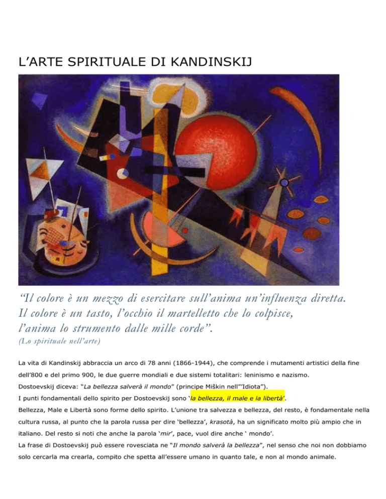L’ARTE SPIRITUALE DI KANDINSKIJ “Il colore è un mezzo di esercitare sull’anima un’influenza diretta. Il colore è un tasto, l’occhio il martelletto che lo colpisce, l’anima lo strumento dalle mille corde”. (Lo spirituale nell’arte) La vita di Kandinskij abbraccia un arco di 78 anni (1866-1944), che comprende i mutamenti artistici della fine dell’800 e del primo 900, le due guerre mondiali e due sistemi totalitari: leninismo e nazismo. Dostoevskij diceva: “La bellezza salverà il mondo” (principe Miškin nell”’Idiota”). I punti fondamentali dello spirito per Dostoevskij sono ‘la bellezza, il male e la libertà’. Bellezza, Male e Libertà sono forme dello spirito. L’unione tra salvezza e bellezza, del resto, è fondamentale nella cultura russa, al punto che la parola russa per dire ‘bellezza’, krasotà, ha un significato molto più ampio che in italiano. Del resto si noti che anche la parola ‘mir’, pace, vuol dire anche ‘ mondo’. La frase di Dostoevskij può essere rovesciata ne “Il mondo salverà la bellezza”, nel senso che noi non dobbiamo solo cercarla ma crearla, compito che spetta all’essere umano in quanto tale, e non al mondo animale. Noi possiamo vivere nella bellezza in molti modi. La pittura è solo uno di questi. Vivere nella bellezza significa vivere in armonia con l’esistente. La bellezza non è solo un modo di vedere le cose, ma un modo di viverle, di respirarle, un’arte spirituale. La bellezza è la via per vedere lo spirito ovunque. I colori sono solo una delle tante variegazioni dello spirito, come le note nella musica. E attraverso i colori noi possiamo fare un esercizio magico: contattare ciò che sta al di là dell’avvertire Quando ricevevo le voci dirette, una di esse fu, al risveglio: “Alimentiamo la Materia con i colori dello Spirito!” Svegliandomi, ho visto una bianca luce calda, che si fletteva, come puro atto d’amore, e, così facendo, si variegava, creando i colori dell’iride, le apparenze della bellezza, la moltitudine delle cose. In automatico, ho preso dal comodino un libriccino ancora chiuso che trattava del Buddhismo e ho cominciato a voltare le pagine a caso. A un certo punto mi sono fermata e ho letto: “Il Buddha primordiale concepito come Luce indifferenziata e incolore, a un certo momento si esteriorizza e si manifesta come una vibrazione, per cui esso dà luogo ai colori. Da questa variegatura inizia l’evoluzione, caratterizzata dall’estroversione del puro principio spirituale fino al limite dell’esperienza materiale del mondo.” Il mio principio guida lo aveva detto meglio. 1. Il concetto di “necessità interiore” sarà un concetto chiave della teoria di Kandinsky, che verrà da lui sempre ripetuto come leitmotiv per la creazione Ci sono molti modi per fare spiritualità, ovvero per ricercare la fonte profonda di noi stessi e sentire un afflato (un soffio , una spinta) universale, e uno di questi è la pittura. Platone diceva: “Il Bello è lo splendore del Vero“, anche se poi, pur essendo un artista, non capiva il bello nell’arte. Un mistico del quinto secolo, lo Pseudo Dionigi Aeropagita, ha scritto: “Dio ci concede di partecipare alla sua propria Bellezza“. La Bellezza non è spiegabile e non è comunicabile. Partecipare di Dio può essere una astrusità per un ateo, ma anche per un credente è un mistero. E, se ci tocca, è un atto di grazia. La Bellezza è una chiave di accesso, da una parte agli archetipi (modelli) profondi che vivono dentro di noi. Quindi la Bellezza è una chiave di accesso per comunicare più profondamente con noi e con l’universo. Gli antichi Greci avevano colto il legame intrinseco della Bellezza col Bene e avevano creato una parola “kalokagathia”, kalòs kai agathòs, per indicare l’uomo bello e buono, l’unità nella stessa persona di bellezza e valore morale. L’universo è un oceano di luce in movimento. Noi vediamo i colori e percepiamo i movimenti. Al di là delle forme c’è l’astrazione della luce pura. I colori sono i suoni della luce. La pittura deve cogliere lo spirituale dell’arte. Ecco Kandinskij! Novalis diceva: “Anche il compimento dell’essere umano è un’arte” . Per compiere quest’arte possono essere necessarie molte vie. L’arte è una di queste. .. Premetto che quello che diremo di Kandinskij, il suo spiritualismo, il suo esoterismo, valgono solo per lui. Se egli crea l’arte astratta, questa poi prese altre vie e altre manifestazioni. .. Fino alla fine del 1800, Occidente e Oriente camminano separati. Ma, a partire dalla fine dell’800, alcuni personaggi della cultura europea, intellettuali, scrittori, poeti, pittori, sensitivi ecc. cominciarono ad interessarsi del pensiero orientale, indiano e tibetano, e lo portarono in Occidente, in Europa prima e in America dopo, dove ebbe grande successo, creando una particolare ricerca esoterica, una filosofia che univa due culture. Kandinskij fu un estremo creativo, un grande innovatore e il suo modo di fare bellezza costituì un preciso messaggio rivoluzionario, aprendo orizzonti nuovi e sconfinati che toccavano tutti i campi della conoscenza umana, dall’arte alla fisica (si pensi solo alla fisica quantistica). Negli ultimi due secoli, l’Occidente è stato prevaricato dalla scienza, che ha ridotto il mondo al visibile, al tangibile, al misurabile, chiudendolo in parametri ristretti e dimenticando i componenti sottili della realtà, dimenticando l’anima. Proprio per bilanciare questo scientismo solo materialista che ha avocato a sé tutto, sono sorti movimenti che hanno diffuso un pensiero alternativo, spiritualista o esoterico, e tra questi, appunto, la Società Teosofica. Abbiamo parlato di Spiritualismo ed Esoterismo (segreto, riservato), due termini importanti per Kandinskij. Per SPIRITUALISMO intendiamo qualunque concezione religiosa o filosofica che consideri lo Spirito come realtà preminente, superiore alla materia, o riduca la materia s