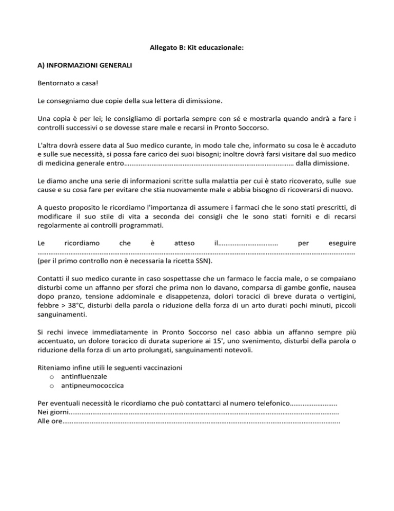 Allegato B: Kit educazionale: A) INFORMAZIONI GENERALI Bentornato a casa! Le consegniamo due copie della sua lettera di dimissione. Una copia è per lei; le consigliamo di portarla sempre con sé e mostrarla quando andrà a fare i controlli successivi o se dovesse stare male e recarsi in Pronto Soccorso. L'altra dovrà essere data al Suo medico curante, in modo tale che, informato su cosa le è accaduto e sulle sue necessità, si possa fare carico dei suoi bisogni; inoltre dovrà farsi visitare dal suo medico di medicina generale entro………………………………………………………………………………… dalla dimissione. Le diamo anche una serie di informazioni scritte sulla malattia per cui è stato ricoverato, sulle sue cause e su cosa fare per evitare che stia nuovamente male e abbia bisogno di ricoverarsi di nuovo. A questo proposito le ricordiamo l'importanza di assumere i farmaci che le sono stati prescritti, di modificare il suo stile di vita a seconda dei consigli che le sono stati forniti e di recarsi regolarmente ai controlli programmati. Le ricordiamo che è atteso il…………………………… per eseguire ………………………………………………………………………………………………………………………………………………………… (per il primo controllo non è necessaria la ricetta SSN). Contatti il suo medico curante in caso sospettasse che un farmaco le faccia male, o se compaiano disturbi come un affanno per sforzi che prima non lo davano, comparsa di gambe gonfie, nausea dopo pranzo, tensione addominale e disappetenza, dolori toracici di breve durata o vertigini, febbre > 38°C, disturbi della parola o riduzione della forza di un arto durati pochi minuti, piccoli sanguinamenti. Si rechi invece immediatamente in Pronto Soccorso nel caso abbia un affanno sempre più accentuato, un dolore toracico di durata superiore ai 15', uno svenimento, disturbi della parola o riduzione della forza di un arto prolungati, sanguinamenti notevoli. Riteniamo infine utili le seguenti vaccinazioni o antinfluenzale o antipneumococcica Per eventuali necessità le ricordiamo che può contattarci al numero telefonico…………………….. Nei giorni…………………………………………………………………………………………………………………………………. Alle ore…………………………………………………………………………………………………………………………………….. ATEROSCLEROSI CORONARICA, ISCHEMIA CARDIACA, INFARTO MIOCARDICO, ANGINA PECTORIS Le arterie coronariche o coronarie sono i vasi che portano il sangue al muscolo cardiaco. Quando queste arterie si restringono o si chiudono impedendo il flusso del sangue e quindi l’apporto di ossigeno al cuore, si manifesta l’ischemia coronarica. Il restringimento o la chiusura della coronaria avviene a causa della formazione di un'incrostazione (detta placca o ateroma) sulla parete interna del vaso, un processo definito aterosclerosi. La placca è costituita da diverse componenti, ma uno dei principali responsabili della sua formazione è il colesterolo. Peraltro, l’aterosclerosi può interessare tutte le arterie e quindi colpire organi differenti dal cuore. Il processo di aterosclerosi delle coronarie è graduale e può essere schematizzato in tre fasi: 1) Inizia la formazione della placca, che riduce lentamente il lume vasale e il flusso del sangue al muscolo cardiaco. In questo stadio iniziale è probabile non avvertire alcun sintomo. 2) Aumento dello spessore della placca con conseguente blocco parziale del flusso. In questa situazione è possibile non avvertire ancora sintomi oppure essere colpiti da un attacco di angina (dolore al petto), specie se si effettua un esercizio fisico, che cessa dopo pochi minuti. 3) Se sulla placca si attacca un grumo di sangue (trombo), si ostruisce completamente il flusso ematico. In questo caso insorge un infarto miocardico che implica un danno permanente e irreversibile di un’area del muscolo cardiaco. Il principale e più frequente sintomo dell’infarto è il dolore toracico, che può irradiarsi alle braccia e al collo. La gravità di tutte queste situazioni descritte è strettamente collegata al numero di arterie coronarie ostruite dalla placca. Angina pectoris È il primo sintomo che ci segnala che il flusso di una o più coronarie è parzialmente ostruito, quindi va presa in seria considerazione. Il dolore toracico talvolta può essere scambiato per indigestione o bruciore di stomaco e spesso scompare dopo pochi minuti. La sintomatologia che può presentarsi è molto differenziata: • Disturbo, dolore, pesantezza, oppressione o bruciore al torace • Pesantezza, dolore, intorpidimento o formicolii ai polsi, alle braccia, ai gomiti • Indolenzimento delle spalle, del collo, della gola • Difficoltà di respiro, mancanza di fiato L’angina è una condizione reversibile che non lascia danni al cuore. Infarto del miocardio Quando l’ostruzione di una o più coronarie è completa e il flusso di sangue verso una zona del cuore è interrotto, il muscolo cardiaco va incontro a un infarto, che porta alla morte delle cellule di quella particolare area. I sintomi sono simili a quelli dell’angina, ma possono però essere più intensi e duraturi. È importante chiamare il 118, perché un personale addestrato all’emergenza: Arriva velocemente e inizia il trattamento Manda informazioni all’ospedale prima che il malato vi arrivi. Sa trattare efficacemente un eventuale arresto cardiaco In alternativa, bisogna recarsi al pronto soccorso nel più breve tempo possibile. Questo tipo di attacco di cuore lascia danni irreversibili e la sua gravità è in relazione alla vastità dell’area muscolare colpita, che non svolgerà più il suo lavoro. Tuttavia, il cuore è un organo tenace. Anche se una sua parte è danneggiata, tutto il resto continu