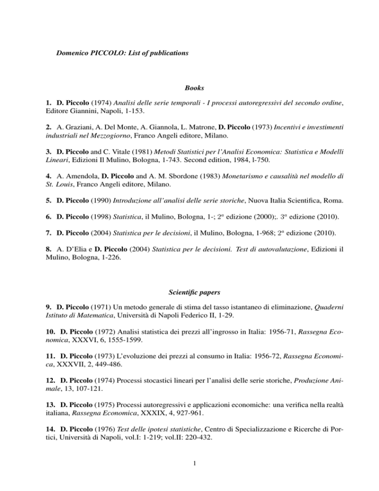 Domenico PICCOLO: List of publications Books 1. D. Piccolo (1974) Analisi delle serie temporali - I processi autoregressivi del secondo ordine, Editore Giannini, Napoli, 1-153. 2. A. Graziani, A. Del Monte, A. Giannola, L. Matrone, D. Piccolo (1973) Incentivi e investimenti industriali nel Mezzogiorno, Franco Angeli editore, Milano. 3. D. Piccolo and C. Vitale (1981) Metodi Statistici per l’Analisi Economica: Statistica e Modelli Lineari, Edizioni Il Mulino, Bologna, 1-743. Second edition, 1984, l-750. 4. A. Amendola, D. Piccolo and A. M. Sbordone (1983) Monetarismo e causalità nel modello di St. Louis, Franco Angeli editore, Milano. 5. D. Piccolo (1990) Introduzione all’analisi delle serie storiche, Nuova Italia Scientifica, Roma. 6. D. Piccolo (1998) Statistica, il Mulino, Bologna, 1-; 2a edizione (2000);. 3a edizione (2010). 7. D. Piccolo (2004) Statistica per le decisioni, il Mulino, Bologna, 1-968; 2a edizione (2010). 8. A. D’Elia e D. Piccolo (2004) Statistica per le decisioni. Test di autovalutazione, Edizioni il Mulino, Bologna, 1-226. Scientific papers 9. D. Piccolo (1971) Un metodo generale di stima del tasso istantaneo di eliminazione, Quaderni Istituto di Matematica, Università di Napoli Federico II, 1-29. 10. D. Piccolo (1972) Analisi statistica dei prezzi all’ingrosso in Italia: 1956-71, Rassegna Economica, XXXVI, 6, 1555-1599. 11. D. Piccolo (1973) L’evoluzione dei prezzi al consumo in Italia: 1956-72, Rassegna Economica, XXXVII, 2, 449-486. 12. D. Piccolo (1974) Processi stocastici lineari per l’analisi delle serie storiche, Produzione Animale, 13, 107-121. 13. D. Piccolo (1975) Processi autoregressivi e applicazioni economiche: una verifica nella realtà italiana, Rassegna Economica, XXXIX, 4, 927-961. 14. D. Piccolo (1976) Test delle ipotesi statistiche, Centro di Specializzazione e Ricerche di Portici, Università di Napoli, vol.I: 1-219; vol.II: 220-432. 1 15. D. Piccolo (1976) Introduzione alla analisi spettrale delle serie temporali, Istituto di Calcolo delle Probabilità, Università di Roma “La Sapienza”, n.8, 1-88. 16. D. Piccolo (1976) La variabile casuale “frequenza angolare” per un processo autoregressivo del secondo ordine, Statistica, vol.XXXVI,1, 29-42. 17. L. Matrone and D. Piccolo (1976) Come hanno votato i giovani, Politica ed economia, 4, 20– 23. 18. D. Piccolo (1977) La logica delle strutture lineari nell’analisi delle serie storiche, Rivista di Statistica Applicata, 3, 135-160. 19. C. D’Onofrio, D. Piccolo and F. Paradisi (1977) The Influence of Some Metabolic Inhibitors on “in vitro” Phagocytizing Macrophages, Medical Microbiology and Immunology, 163, 195-207. 20. D. Piccolo (1978) Problemi statistici nella stima del periodo, Quaderni di Statistica e Econometria, I, 92-122. 21. D. Piccolo (1978) Modelli lineari e Intervention Analysis nei problemi idrologici, in: Estremi idrologici e modelli di previsione, CNR, Università di Perugia, 227-246. 22. D. Piccolo (1978) La problematica e la metodologia statistica della Intervention Analysis, Istituto di Calcolo delle Probabilità, Università di Roma La Sapienza, n. 1, 1-68. 23. D. Piccolo (1978) Efficienza asintotica di stimatori alternativi del periodo, Metron, XXXVI, 1/2, 155-171. 24. D. Piccolo (1978) La metodologia Box-Jenkins per l’analisi di fenomeni monetari e creditizi, Rivista di Statistica Applicata, 11, 3, 161-179. 25. V. Fedele, D. Piccolo and E. Tremblay (1978) Materiali per una valutazione statistica delle popolazioni di “Aphis Gabae Scop” in cella climatica, Annali della Facoltà di Scienze Agrarie, vol.XII, 1-11. 26. D. Piccolo (1978) Analisi statistica sui dati demografici rilevati dalle fonti ufficiali, in: Progetto FORMEZ sulla Emigrazione meridionale, vol.I, 1 - 110. 27. D. Piccolo (1979) Una sintesi dei recenti sviluppi nell’analisi statistica di serie economiche, Rivista di Economia Agraria, XXXIV, 3, 481-530. 28. D. Piccolo (1979) DECOMEL: un metodo statistico per la decomposizione dei modelli ARMA, Atti Giornate di Lavoro AIRO, I, S15-S32. 29. F. Paradisi, C. D’Onofrio, G. Pepe, A. Cifarelli and D. Piccolo (1979) Phagocytosis and cellular metabolism. A study on mouse and human macrophages in culture, La Ricerca in Clinica e in Laboratorio, IX, 1, 47-60. 2 30. D. Piccolo and L. Ubertini (1979) Flood Forecasting by Transfer Intervention Models, in: Proceedings of the XVIII IAHR Meeting, vol.5-D, Cagliari, 319-326. 31. D. Piccolo and L. Venzi (1979) Analisi preliminare di alcune variabili economiche per un modello statistico del settore bovino nel Mezzogiorno, in: AA.VV., L’agricoltura nello sviluppo del Mezzogiorno, Edizioni il Mulino, Bologna, 1-20. 32. L. Pieraccini, G.A. Marselli, L. Matrone, D. Piccolo and C. Vitale (1980) Un’indagine diretta sull’emigrazione nelle zone interne del Mezzogiorno, in: M. De Benedictis (ed.), L’agricoltura nello sviluppo del Mezzogiorno, Edizioni il Mulino, Bologna, 271-310. 33. D. Piccolo (1980) La decomposizione di un modello ARMA: proposte di metodo e prospettive di applicazione, Giornale degli Economisti e Annali di Economia, 112, 75-87. 34. D. Piccolo (1980) Un confronto tra alcuni criteri statistici di identificazione automatica, Quaderni di Statistica e Econometria, III, 117-167. 35. C. Vitale and D. Piccolo (1980) Contributi recenti all’analisi delle serie economiche, in: AA.VV., Atti del Convegno “Le statistiche dello sviluppo”, Università di Salerno, ESI, 231-245. 36. F. Melone, D. Piccolo and L. Ubertini (1980) Stochastic Modelling of Monthly Flows for some Italian Rivers, 3rd International Symposium on Stochastic Hydraulics, A-10-1, 153-163. 37. D. Piccolo (1981) Per una interpretazione dei modelli ARMA, in: D. Piccolo (ed.), Atti del Convegno nazionale “Analisi moderna delle serie storiche”, Franco Angeli editore, Milano, 1983, 191-206. 38. D. Piccolo (1981) Regioni osservabili per modelli AR e MA, Statistica, vol.XLI, 1, 11-22. 39. D. Piccolo (1981) Problemi di forma e proble