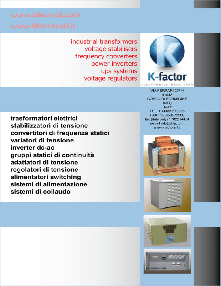 www.ideomat.com www.kfactorssrl.it industrial transformers voltage stabilisers frequency converters power inverters ups systems voltage regulators trasformatori elettrici stabilizzatori di tensione convertitori di frequenza statici variatori di tensione inverter dc-ac gruppi statici di continuità adattatori di tensione regolatori di tensione alimentatori switching sistemi di alimentazione sistemi di collaudo VIA FERRARI 27/44 41043 CORLO DI FORMIGINE (MO) ITALY TEL. +39-059573986 FAX +39-059573986 fax (italy only) 1782214454 e-mail info@kfactor.it www.kfactorsrl.it INDICE Trasformatori monofase Trasformatori monofase a colonne da 3.15kVA Autotrasformatori monofase Trasformatori di sicurezza IP55 Trasformatori trifase Autotrasformatori trifase Autotrasformatori e reattanze di avviamento Box Metallici pag. 5 : 10 pag. 11 : 13 pag. 14 pag. 15 pag. 16 : 17 pag. 18 : 19 pag. 20 pag. 21 Stabilizzatori elettromeccanici fino a 2000VA Stabilizzatori elettronici monofase Stabilizzatori elettromeccanici monofase Stabilizzatori elettromeccanici trifase pag. 25 pag. 26 : 28 pag. 29 : 32 pag. 33 : 35 Convertitori di frequenza pag. 36 : 37 SUMMARY Single phase transformers Two limbs single ph. transformers from 3.15kVA Single phase autotransformers IP55 safety isolation transformers Three phase transformers Three phase autotransformers Starting autotransformers and reactances Metal enclosures for transformers pag. 5 : 10 pag. 11 : 13 pag. 14 pag. 15 pag. 16 : 17 pag. 18 : 19 pag. 20 pag. 21 electromechanical voltage stabilizers up to 2000VA Single phase electronic stabilizers Single phase electromechanical stabiizers Three phase electromechanical stabilizers pag. 25 pag. 26 : 28 pag. 29 : 32 pag. 33 : 35 Frequency converters pag. 36 : 37 2007 FERRARI CHALLENGE WORLD CHAMPINSHIP OFFICIAL SPONSOR VIA FERRARI 27/44 41043 CORLO DI FORMIGINE (MO) ITALY TEL. +39-059573986 FAX +39-059573986 fax (italy only) 1782214454 e-mail info@kfactor.it www.kfactorsrl.it TRASFORMATORI ELETTRICI VOLTAGE TRANSFORMERS Per poter fornire tutti i dati necessari per una corretta richiesta di trasformatori occore fornire i seguenti dati: To arrive at the specifications of a needed transformer, determine the following: guida all’acquisto purchase guide Potenza Nominale (VA) Numero delle fasi (monofase o trifase) Frequenza (Hz) della tensione Rated Power (VA) Number of Phases (single or three-phase) Frequency (Hz): Avvolgimento primario: Tensione nominale di ingresso (Vrms) Eventuali prese intermedie (Vrms) Se trifase, il gruppo di collegamento Primary Winding: Nominal Input Voltage (Vrms) Tap Voltages if any (Vrms) If Three-Phase, the Connection (triangolo o stella) (Delta or Wye) Avvolgimento secondario(i): Secondary Winding(s): (fornire i seguenti dati per ogni avvolgimento secondario:) (determine the following for each Secondary:) Tensione di uscita a pieno carico (Vrms) Corrente di uscita a pieno carico (Irms) Eventuali prese intermedie (di norma la corrente è Full-Load Output Voltage (Vrms) Full-Load Output Current (Irms) Tap Voltages if any (Vrms) (Include Tap Current if less than in proporzione alla corrente della tensione più elevata) Winding Current) Se trifase, il gruppo di collegamento If Three-Phase, Connection (triangolo, stella, altro) (cfr. pag.15) (Delta or Wye) (see page15) Eventuali altre informazioni: Caduta di tensione a pieno carico Tensione di isolamento Schermo elettrostatico Intermittenza (se diverso da 100%) Terminali particolari Additional Electrical Information: Regulation No-Load to Full-Load (%) Dielectric withstanding Voltage Shielding Requirements Duty Cycle (if other than 100%) Any Special Winding Terminal Type Needed (specificare tipo, dimensione,posizione, ecc.) (specify type, size, location, etc.) Gradi di protezione (IP) Classe di isolamento (I o II) Protection class (IP) Isolation class (I or II) Informazioni ambientali: Temperatura ambiente (ºC or ºF) Classe di sovratemperatura del trasformatore (A,B,E,F,H in conformità agli standard IEC) Tipo di raffreddamento del trasformatore (aria naturale Environmental Information: Ambient Temperature Range (ºC or ºF) Transformer’s Temperature Rise (A,B,E,F,H – Informazioni fisiche e meccaniche: Limiti dimensionali (largh., prof., altezza) Particolari condizioni di montaggio Tipo di costruzione (aperto, in contenitore, in armadio) Richieste particolari di marcatura (logo, targhe di Physical and Mechanical Information: Space Constraints (length, width, and height) Special Mounting Arrangements (if required) Type of Construction (open frame, enclosure, etc.) Special Marking Requirements (specific logos, according to IEC standards) Transformer’s cooling (natural convection, forced air, water, etc.) –AN-, aria forzata –AF- ecc.) pericolo, ecc.) Norme applicabili • Marcatura CE su tutti i prodotti hazard stickers, etc.) Applicable Standards: • CE Mark to be applied on any products • Norme CEI 96-7/8 (CEI EN 61558-2-4/6) Corrispondenti alle precedenti norme EN 60742. Vengono applicate a tutti i trasformatori di isolamento e sicurezza per potenze fino a 25 kVA se monofase, 40 kVA se trifase. Per i trasformatori di sicurezza (trasformatori di isolamento la cui tensione secondaria non è superiore a 50 Vca), le potenze massime previste dalla norma sono 10 kVA se monofase, 16 kVA se trifase. Sostuiscono le precedenti norme CEI 14-6. • EN 61558-2-4/6 Applicable to all isolation transformers up to 25 kVA single phase, and up to 40 kVA three phase. As regards the safety isolation transformers (isolation transformers with a secondary voltage less than 50 V a.c.) the limit is specified by the standards to 10 kVA single phase, 16 kVA three phase. • Norme CEI 96-9 (EN61558-2-2) Corrispondenti alle precedenti norme IEC 989, trovano applicazione nei trasformatori di comando e separazione utilizzati nell’impiantistica civile ed industriale. • EN61558-2-2 Applicable to all control and separation transformers used in the panel boards manufactu