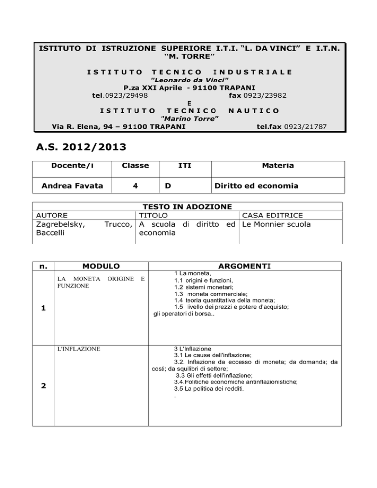 ISTITUTO DI ISTRUZIONE SUPERIORE I.T.I. “L. DA VINCI” E I.T.N. “M. TORRE” ISTITUTO TECNICO INDUSTRIALE "Leonardo da Vinci" P.za XXI Aprile - 91100 TRAPANI tel.0923/29498 fax 0923/23982 E ISTITUTO TECNICO NAUTICO "Marino Torre" Via R. Elena, 94 – 91100 TRAPANI tel.fax 0923/21787 A.S. 2012/2013 Docente/i Classe Andrea Favata 4 AUTORE Zagrebelsky, Baccelli n. 1 L'INFLAZIONE 2 D Materia Diritto ed economia TESTO IN ADOZIONE TITOLO CASA EDITRICE Trucco, A scuola di diritto ed Le Monnier scuola economia MODULO LA MONETA FUNZIONE ITI ORIGINE ARGOMENTI E 1 La moneta, 1.1 origini e funzioni, 1.2 sistemi monetari; 1.3 moneta commerciale; 1.4 teoria quantitativa della moneta; 1.5 livello dei prezzi e potere d'acquisto; gli operatori di borsa.. 3 L'Inflazione 3.1 Le cause dell'inflazione; 3.2. Inflazione da eccesso di moneta; da domanda; da costi; da squilibri di settore; 3.3 Gli effetti dell'inflazione; 3.4.Politiche economiche antinflazionistiche; 3.5 La politica dei redditi. . IL SISTEMA DEL CREDITO IL COMMERCIO INTER. 3 1 DIRITTI RELATIVI ASSOLUTI 2 Il sistema di credito 2.1 funzioni e soggetti del mercato monetario e del mercato finanziario; 2.2 il sistema bancario; 2.3 i contratti bancari; 2.4. la Borsa valore; 2.5 gli operatori di borsa. 4 Il Commercio Internazionale 4.1 La teoria dei costi comparati; 4.2 Mercato valutario e tasso di scambio; 4.3 La bilancia dei Pagamenti 1 I diritti reali I beni, diritti reali e obbligazioni, la proprietà, i modi di acquisto della proprietà, azioni a difesa della proprietà, 2 Il possesso 2.1 possesso e detenzione, 2.2 la tutela del possesso. E 4 Le OBBLIGAZIONI 3.1 le fonti dell'obbligazione, 3.2 modificazione attive e passive, 3.3 l'adempimento delle obbligazioni, 3.4 la mora del creditore e la mora del debitore, 3.5 l'estinzione dell'obbligazione 5 . IL CONTRATTO 6 7 4 Il contratto 4.1 Elementi essenziali, accidentali contratto, 4.2 l'invalidità del contratto, 4.3 nullità, 4.4 annullabilità, 4.5 principali contratti commerciali; . e naturali del ISTITUTO DI ISTRUZIONE SUPERIORE I.T.I. “L. DA VINCI” E I.T.N. “M. TORRE” ISTITUTO TECNICO INDUSTRIALE "Leonardo da Vinci" P.za XXI Aprile - 91100 TRAPANI tel.0923/29498 fax 0923/23982 E ISTITUTO TECNICO NAUTICO "Marino Torre" Via R. Elena, 94 – 91100 TRAPANI tel.fax 0923/21787 A.S. 2012/2013 Docente Classe ITI - ITN MURO ROSARIO 4D ITI Materia EDUCAZIONE FISICA PROGRAMMAZZIONE MODULARE TESTO IN ADOZIONE AUTORE TITOLO CASA EDITRICE GOTTIN-DEGANI MOVE SEI n. MODULO Il corpo umano Educazione del Corpo ARGOMENTI Attività ed esercizi a carico naturaleAttività ed esercizi di opposizione e resistenza Attività ed esercizi e ai grandi attrezzi codificati e non codificati 1. Miglioramento delle capacità individuali iniziali 2. Adattamento fisiologico alla durata dello sforzo 3. Potenziamento fisiologico 4. Consolidamento e rielaborazione degli schemi motori di base. Padronanza Motoria Il Movimento Attività di rilassamentoControllo segmentario- Controllo della respirazioneAttività ed esercizi eseguiti in varietà di ampiezza, ritmo. Situazioni spazio-temporali Equilibrio in situazioni dinamiche Attività di sviluppo di capacità coordinative e condizionali 1.Esecuzioni di azioni semplici e complesse in situazioni gioco 2.Miglioramento dei movimenti periarticolari 3.Controlli segmentari e Posturali 1 2 Pratica motoriasportiva e cultura del movimento 3 Attitudini personali Transfert 4 - Attività sportive individuali - Specialità sportive di libera scelta - Tabelle di allenamento 1. Conoscenza e pratica di almeno due discipline individuali e due sport di squadra 2. Promozione delle attività sportive e miglioramento della comunicazione interpersonale 3. Temi d’attualità (doping,agonismo,violenza,massmedia,sportspettacolo,sport e scuola etc.) Ed.alla Salute – Fumo e Alcool - Attività sportiva in ambiente naturale (sport all’aria aperta) - Lo sport dell’orientamento - Pratica sportiva come costume di vita - -Educazione alla salute - Prevenzione dei traumi 1.Adattamento delle capacità e competenze motorie in realtà ambientali 2.Conoscenza delle norme elementari del comportamento ai fini della prevenzione degli infortuni ed in caso di incidenti Educazione stradale 5 I MOMENTI DI VERIFICA 6 - L’educazione stradale secondo le indicazioni ministeriali in attuazione dell’art.230 del nuovo codice della strada. - A piedi - Bici - Moto - Auto -Norme di primo soccorso 1. Prevenzione degli infortuni in caso di incidente 2. Conoscenza delle regole di comportamento stradale Conoscenza delle norme igieniche I MOMENTI DI VERIFICA Domande Tests Esercizi Attività sportive Autoverifiche Osservatorio:capacità motoria . Al fine di far conseguire allo studente la capacità di organizzare progetti autonomi, utilizzabili anche dopo la conclusione degli studi secondari, sono opportune forme di coinvolgimento attivo dello stesso nelle varie fasi dell'organizzazione dell'attività dalla progettazione alla realizzazione dei percorsi operativi e metodologici da adottare. Prof. Rosario Muro ISTITUTO DI ISTRUZIONE SUPERIORE I.T.I. “L. DA VINCI” E I.T.N. “M. TORRE” ISTITUTO TECNICO INDUSTRIALE "Leonardo da Vinci" P.za XXI Aprile - 91100 TRAPANI tel.0923/29498 fax 0923/23982 E ISTITUTO TECNICO NAUTICO "Marino Torre" Via R. Elena, 94 – 91100 TRAPANI tel.fax 0923/21787 A.S. 2012/2013 Docente/i Classe ITI - ITN Materia Campo Renato IVD ITI ELETTRONICA AUTORE CUNIBERTI E. / DE LUCCHI L. n. TESTO IN ADOZIONE TITOLO ELETTRONICA ELN 2. COMPONENTI ANALOGICI E PROGRAMMABILI + CD ROM 2 MODULO RETI ELETTRICHE IN REGIME CONTINUO 1 PETRINI ARGOMENTI Reti lineari - Resistenza - Capacità – Induttanza - Generatore di tensione Generatore di corrente - Generatore dipendente - Elementi in serie e in parallelo. Tipi di segnale: Segnali sinusoidali - Segnali quadri - Altri segnali - Legge di Ohm - 1° e 2° Principio di Kirchhoff - Teorema della sovrapposizione degli effetti - Teorema di Thevenin - Teorema di Norton -