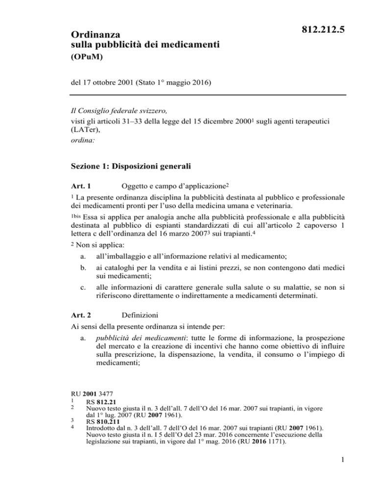 Ordinanza sulla pubblicità dei medicamenti 812.212.5 (OPuM) del 17 ottobre 2001 (Stato 1° maggio 2016) Il Consiglio federale svizzero, visti gli articoli 31–33 della legge del 15 dicembre 20001 sugli agenti terapeutici (LATer), ordina: Sezione 1: Disposizioni generali Art. 1 Oggetto e campo d’applicazione2 La presente ordinanza disciplina la pubblicità destinata al pubblico e professionale dei medicamenti pronti per l’uso della medicina umana e veterinaria. 1 1bis Essa si applica per analogia anche alla pubblicità professionale e alla pubblicità destinata al pubblico di espianti standardizzati di cui all’articolo 2 capoverso 1 lettera c dell’ordinanza del 16 marzo 20073 sui trapianti.4 2 Non si applica: a. all’imballaggio e all’informazione relativi al medicamento; b. ai cataloghi per la vendita e ai listini prezzi, se non contengono dati medici sui medicamenti; c. alle informazioni di carattere generale sulla salute o su malattie, se non si riferiscono direttamente o indirettamente a medicamenti determinati. Art. 2 Definizioni Ai sensi della presente ordinanza si intende per: a. pubblicità dei medicamenti: tutte le forme di informazione, la prospezione del mercato e la creazione di incentivi che hanno come obiettivo di influire sulla prescrizione, la dispensazione, la vendita, il consumo o l’impiego di medicamenti; RU 2001 3477 1 RS 812.21 2 Nuovo testo giusta il n. 3 dell’all. 7 dell’O del 16 mar. 2007 sui trapianti, in vigore dal 1° lug. 2007 (RU 2007 1961). 3 RS 810.211 4 Introdotto dal n. 3 dell’all. 7 dell’O del 16 mar. 2007 sui trapianti (RU 2007 1961). Nuovo testo giusta il n. I 5 dell’O del 23 mar. 2016 concernente l’esecuzione della legislazione sui trapianti, in vigore dal 1° mag. 2016 (RU 2016 1171). 1 812.212.5 Sostanze terapeutiche b. pubblicità destinata al pubblico: la pubblicità dei medicamenti che si rivolge al pubblico; c. pubblicità professionale: pubblicità dei medicamenti che si rivolge al personale specializzato autorizzato alla prescrizione, alla dispensazione o all’impiego professionale di medicamenti sotto la propria responsabilità. Sezione 2: Pubblicità professionale Art. 3 Cerchia dei destinatari della pubblicità professionale I destinatari della pubblicità professionale sono: a. i medici, i dentisti e i veterinari; b. i farmacisti; c. i droghieri; d. le altre persone autorizzate alla dispensazione di medicamenti secondo gli articoli 24 e 25 LATer. Art. 4 Generi di pubblicità professionale Per pubblicità professionale s’intende la pubblicità di medicamenti come: a. le inserzioni in riviste specializzate e in altri stampati per specialisti; b. la pubblicità su oggetti; c. la pubblicità mediante l’impiego di mezzi audiovisivi e di altri supporti video, audio, di dati e mediante altri sistemi di trasmissione di dati, per esempio Internet; d. la pubblicità in occasione di giornate di promozione di vendita o di incontri scientifici; e. l’esecuzione e il sostegno finanziario di giornate di promozione di vendita; f. le spese di rappresentanza a congressi scientifici e manifestazioni di promozione; g. gli invii e materiale di promozione; h. le visite di rappresentanti di medicamenti; i. le forniture di campioni di medicamenti. Art. 5 Requisiti in materia di pubblicità professionale Tutte le indicazioni nella pubblicità professionale devono concordare con l’ultima informazione sui medicamenti approvata dall’Istituto svizzero per gli agenti terapeutici (Istituto); in particolare possono essere pubblicizzate soltanto indicazioni e possibilità di impiego approvate dall’Istituto. 1 2 Pubblicità dei medicamenti. O 812.212.5 Se l’informazione relativa al medicamento non è ancora pubblicata, il titolare dell’omologazione deve allegare alla pubblicità professionale l’intero contenuto dell’ultima informazione relativa al medicamento, approvata dall’Istituto.5 2 Le affermazioni della pubblicità professionale devono essere formulate in termini precisi ed essere equilibrate, oggettivamente pertinenti e documentabili. Su richiesta, i documenti giustificativi devono essere messi a disposizione degli specialisti. 3 La pubblicità deve essere riconoscibile come tale. I contributi redazionali devono essere chiaramente separati dalla pubblicità.6 4 Le affermazioni devono basarsi sullo stato attuale delle conoscenze scientifiche e farvi riferimento. La pubblicità può far riferimento soltanto a studi clinici eseguiti e pubblicati o proposti per la pubblicazione secondo i criteri della Buona prassi degli studi clinici (BPSC). Le pubblicazioni devono essere citate integralmente, con l’indicazione esatta della fonte. Nella pubblicità professionale occorre indicare che gli specialisti possono chiedere all’impresa una copia completa del rapporto d’esame.7 5 Un medicamento, un’indicazione, un dosaggio, una formula galenica o un imballaggio possono essere reclamizzati come «nuovi» per la durata di un anno dalla prima omologazione in Svizzera. Dall’informazione deve risultare chiaramente in che cosa consiste la novità.8 6 Art. 6 Contenuto minimo della pubblicità professionale La pubblicità deve contenere almeno le indicazioni seguenti: 5 6 7 8 a. il nome del preparato (marca); b. i principi attivi con la sigla (DCI/INN o la designazione dell’edizione più recente della farmacopea; se dovessero mancare, altre sigle generalmente riconosciute e approvate dall’Istituto); c. il nome e l’indirizzo del titolare dell’omologazione; d. almeno un’indicazione o una possibilità di impiego, nonché il dosaggio e il tipo di impiego; e. un riepilogo delle restrizioni dell’impiego, degli effetti indesiderati e delle interazioni; f. la categoria di dispensazione del medicamento; Nuovo testo giusta il n. I 4 dell’O del 18 ago. 2004, in vigore dal 1° set. 2004 (RU 2004 4037). Nuovo testo giusta il n. I 4 dell’O del 18 ago. 2004, in vigore dal 1° set. 2004 (RU 2004 4037). Nuovo testo giusta il n. I 4