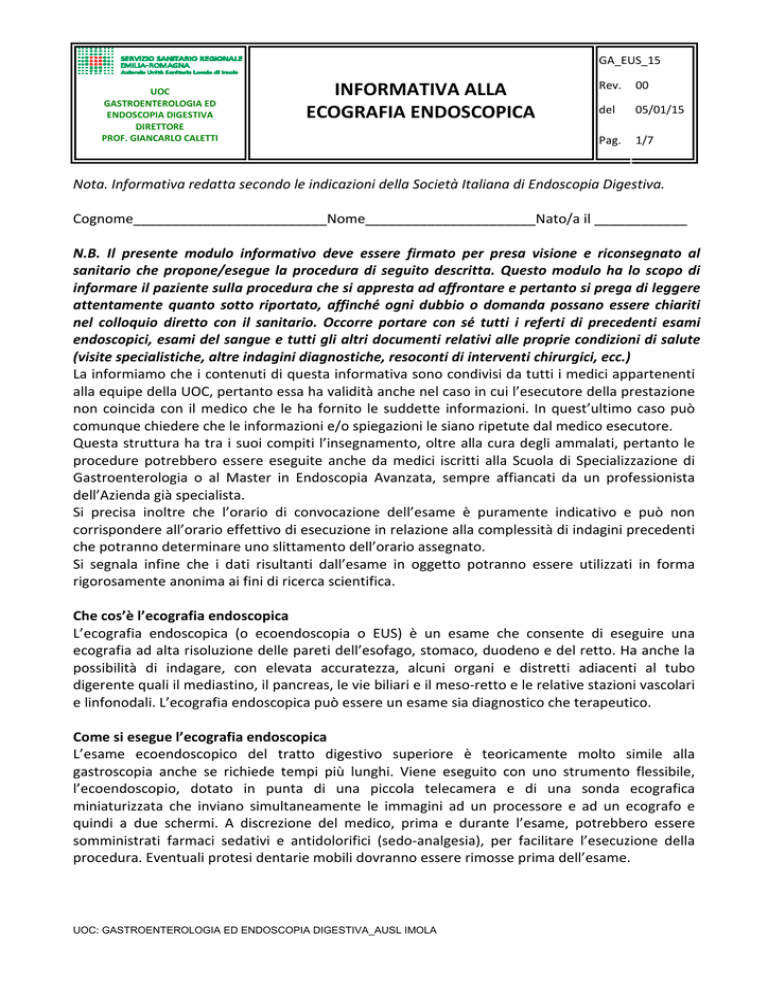 GA_EUS_15 UOC GASTROENTEROLOGIA ED ENDOSCOPIA DIGESTIVA DIRETTORE PROF. GIANCARLO CALETTI INFORMATIVA ALLA ECOGRAFIA ENDOSCOPICA Rev. 00 del 05/01/15 Pag. 1/7 Nota. Informativa redatta secondo le indicazioni della Società Italiana di Endoscopia Digestiva. Cognome_________________________Nome______________________Nato/a il ____________ N.B. Il presente modulo informativo deve essere firmato per presa visione e riconsegnato al sanitario che propone/esegue la procedura di seguito descritta. Questo modulo ha lo scopo di informare il paziente sulla procedura che si appresta ad affrontare e pertanto si prega di leggere attentamente quanto sotto riportato, affinché ogni dubbio o domanda possano essere chiariti nel colloquio diretto con il sanitario. Occorre portare con sé tutti i referti di precedenti esami endoscopici, esami del sangue e tutti gli altri documenti relativi alle proprie condizioni di salute (visite specialistiche, altre indagini diagnostiche, resoconti di interventi chirurgici, ecc.) La informiamo che i contenuti di questa informativa sono condivisi da tutti i medici appartenenti alla equipe della UOC, pertanto essa ha validità anche nel caso in cui l’esecutore della prestazione non coincida con il medico che le ha fornito le suddette informazioni. In quest’ultimo caso può comunque chiedere che le informazioni e/o spiegazioni le siano ripetute dal medico esecutore. Questa struttura ha tra i suoi compiti l’insegnamento, oltre alla cura degli ammalati, pertanto le procedure potrebbero essere eseguite anche da medici iscritti alla Scuola di Specializzazione di Gastroenterologia o al Master in Endoscopia Avanzata, sempre affiancati da un professionista dell’Azienda già specialista. Si precisa inoltre che l’orario di convocazione dell’esame è puramente indicativo e può non corrispondere all’orario effettivo di esecuzione in relazione alla complessità di indagini precedenti che potranno determinare uno slittamento dell’orario assegnato. Si segnala infine che i dati risultanti dall’esame in oggetto potranno essere utilizzati in forma rigorosamente anonima ai fini di ricerca scientifica. Che cos’è l’ecografia endoscopica L’ecografia endoscopica (o ecoendoscopia o EUS) è un esame che consente di eseguire una ecografia ad alta risoluzione delle pareti dell’esofago, stomaco, duodeno e del retto. Ha anche la possibilità di indagare, con elevata accuratezza, alcuni organi e distretti adiacenti al tubo digerente quali il mediastino, il pancreas, le vie biliari e il meso-retto e le relative stazioni vascolari e linfonodali. L’ecografia endoscopica può essere un esame sia diagnostico che terapeutico. Come si esegue l’ecografia endoscopica L’esame ecoendoscopico del tratto digestivo superiore è teoricamente molto simile alla gastroscopia anche se richiede tempi più lunghi. Viene eseguito con uno strumento flessibile, l’ecoendoscopio, dotato in punta di una piccola telecamera e di una sonda ecografica miniaturizzata che inviano simultaneamente le immagini ad un processore e ad un ecografo e quindi a due schermi. A discrezione del medico, prima e durante l’esame, potrebbero essere somministrati farmaci sedativi e antidolorifici (sedo-analgesia), per facilitare l’esecuzione della procedura. Eventuali protesi dentarie mobili dovranno essere rimosse prima dell’esame. UOC: GASTROENTEROLOGIA ED ENDOSCOPIA DIGESTIVA_AUSL IMOLA GA_EUS_15 UOC GASTROENTEROLOGIA ED ENDOSCOPIA DIGESTIVA DIRETTORE PROF. GIANCARLO CALETTI INFORMATIVA ALLA ECOGRAFIA ENDOSCOPICA Rev. 00 del 05/01/15 Pag. 2/7 Durante la procedura: - si insuffla aria in quantità adeguata a distendere le pareti degli organi da esaminare e facilitarne la visione; questo può causare al paziente una sensazione di distensione addominale che non deve allarmare, in quanto assolutamente transitoria. - saranno monitorate, frequenza cardiaca, saturazione di ossigeno e, se necessario, attività elettrocardiografica. L’esame dura dai 15 ai 30 minuti e viene condotto generalmente con il paziente sdraiato sul fianco sinistro, più raramente posto in posizione supina. È importante ricordare anche per le procedure del tratto inferiore che gli esami operativi e/o terapeutici che comportano l’esecuzione di agobiopsie (FNA) o drenaggio di raccolte, richiedono ovviamente tempi di esecuzione più lunghi. In questi casi va considerata la possibilità di svolgere la procedura in sedazione profonda. L’ecoendoscopia del tratto digestivo superiore prevede che lo strumento venga introdotto dalla bocca e condotto, sotto visione endoscopica diretta, sino al duodeno passando attraverso l’esofago e lo stomaco. Serve per la valutazione della parete e degli organi limitrofi, oltre che per i linfonodi distrettuali L’ecoendoscopia del tratto digestivo inferiore prevede che lo strumento venga inserito dall’ano e condotto attraverso il retto, fino al sigma distale (circa 25 cm dall’ano) per permettere la visualizzazione della parete, degli organi limitrofi (genitali interni maschili e femminili, vescica), dei vasi e delle stazioni linfonodali per la valutazione completa delle neoplasie rettali. Può essere eseguita in maniera agevole senza somministrazione di farmaci sedativi o con una sedazione cosciente a seconda dello stato clinico e/o delle richieste del paziente. La preparazione all’ecografia endoscopica Nel colloquio precedente l’esame è indispensabile che il medico venga informato di eventuali malattie e/o allergie di cui il paziente soffre, se il paziente assume farmaci e se è portatore di pacemaker o di altra apparecchiatura impiantabile che possa interferire con strumenti elettromedicali. Nel caso in cui il paziente assuma farmaci anticoagulanti e/o antiaggreganti, in previsione dell’esame, potrebbe rendersi necessaria la loro sospensione o sostituzione previo consulto con lo specialista di riferimento. In condizioni cliniche particolari, può rendersi necessario l’utilizzo di farmaci che perm