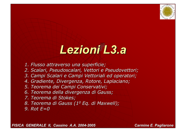 Lezioni L3.a 1. 2. 3. 4. 5. 6. 7. 8. 9. Flusso attraverso una superficie; Scalari, Pseudoscalari, Vettori e Pseudovettori; Campi Scalari e Campi Vettoriali ed operatori; Gradiente, Divergenza, Rotore, Laplaciano; Teorema dei Campi Conservativi; Teorema della divergenza di Gauss; Teorema di Stokes; Teorema di Gauss (10 Eq. di Maxwell); Rot E=0 FISICA GENERALE II, Cassino A.A. 2004-2005 Carmine E. Pagliarone Flusso di un vettore F E Consideriamo una superficie piana nello spazio; e' possibile descriverla introducendo r il vettore superficie A avente come modulo l' area della superficie e verso e dire zione perpendicolare alla superficie medesima. Dato un campo vettoriale E, il flusso del campo E attraverso la superficie A e’ definito come: r r Φ E = E ⋅ A = EA⊥ = EA cos ϑ FISICA GENERALE II, Cassino A.A. 2004-2005 Carmine Elvezio Pagliarone Flusso di E attraverso una superficie r r Φ E = ∑ Ei ⋅ ∆ Ai n i =1 r ? Ai → 0 ΦE = r r E ⋅ dA Area r dA e' un elemento di superficie infinitesimo FISICA GENERALE II, Cassino A.A. 2004-2005 Carmine Elvezio Pagliarone Flusso attraverso una superficie chiusa una superficie chiusa divide lo spazio in due regioni (interna ed esterna alla superficie). Per definizione la direzione dell’elemento di area dA e’ sempre perpendicolare ed uscente dalla superficie. FISICA GENERALE II, Cassino A.A. 2004-2005 Carmine Elvezio Pagliarone Campo Vettoriale esterno ad una superficie chiusa Il flusso netto è zero perchè ogni linea di campo che entra nella superficie è poi uscente. Dimostrarlo ! FISICA GENERALE II, Cassino A.A. 2004-2005 Carmine Elvezio Pagliarone Carica netta all’interno della superficie Una carica netta (-2Q + Q)= -Q e’ contenuta all’interno della superficie A, producendo il flusso del campo elettrico attraverso la superficie FISICA GENERALE II, Cassino A.A. 2004-2005 Carmine Elvezio Pagliarone Prodotto Scalare e Prodotto Vettore I • Prodotto Scalare: Applicazione che va dallo spazio prodotto R3xR3 in R tale che: r r r r 3 A, B ≡ A ⋅ B = ∑ j =1 Aj B j • Norma di un Vettore: Applicazione che va dallo spazio dei vettori R3 nello spazio dei Reali positivi R+ definito come: r A ≡ r r A, A = ∑ 2 3 j =1 A j • Prodotto Vettore: Applicazione che va dallo spazio prodotto R3xR3 nello spazio dei vettori R3, definito dalla relazione: xˆ r r A × B ≡ Ax yˆ zˆ Ay Az Bx By Bz FISICA GENERALE II, Cassino A.A. 2004-2005 Carmine Elvezio Pagliarone Prodotto Scalare e Prodotto Vettore II r r r r r r j =3 A, B ≡ A ⋅ B = ∑ j =1 Aj B j = A B cos θ AB xˆ r r A × B ≡ Ax yˆ zˆ Ay Az = uˆ AB Bx By Bz uAB r r A B sin θ AB FISICA GENERALE II, Cassino A.A. 2004-2005 A θAB B Carmine Elvezio Pagliarone Inversione del sistema di coordinate z x’ P(x,y,z) P y’ y x z’ ℘( P ( x, y , z ) ) = P (− x, − y , − z ) FISICA GENERALE II, Cassino A.A. 2004-2005 Carmine Elvezio Pagliarone Scalari,Pseudoscalari,Vettori,Pseudovettori • Scalare: Scalare elemento appartenente ad R invariante per Inversione del sistema di coordinate; • Pseudoscalare: Pseudoscalare elemento appartenente ad R che cambia segno per inversione del sistema di coordinate • Vettore: Vettore Elemento dello spazio R3 che cambia segno per inversione del sistema di coordinate; • Pseudovettore: Pseudovettore Elemento dello spazio R3 che non cambia segno per inversione del sistema di coordinate; ESERCIZIO Dimostrare che dati due qualsiasi vettori nello spazio: • il loro prodotto scalare è commutativo; commutativo • il loro prodotto scalare da sempre uno scalare; scalare • il loro prodotto vettoriale è anticommutativo; anticommutativo • il loro prodotto vettoriale da sempre uno pseudovettore; pseudovettore FISICA GENERALE II, Cassino A.A. 2004-2005 Carmine Elvezio Pagliarone Operatori Matematici (I) • Nabla r ∂ ∂ ∂ ∇ ≡ xˆ + yˆ + zˆ ∂y ∂z ∂x • Gradiente: Gradiente Operatore che va dallo spazio dei Campi Scalari nello spazio dei Campi Vettoriali, definito dalla relazione: r ∂Φ ∂Φ ∂Φ ˆ ˆ ∇Φ = grad Φ ≡ x+ y+ zˆ ∂y ∂z ∂x • Divergenza: Divergenza Operatore che va dallo spazio dei Campi Vettoriali nello spazio dei Campi Scalari, definito dalla relazione: r ∂Ax ∂Ay ∂Az r r ∇ ⋅ A = div A ≡ + + ∂ x ∂ y ∂ z • Rotore: Rotore Operatore che va dallo spazio dei Campi Vettoriali nello spazio dei Campi Pseudovettoriali, definito dalla relazione: xˆ yˆ zˆ r r r ∇ × A = Rot A ≡ ∂ / ∂x ∂ / ∂y ∂ / ∂z Ax Ay Az FISICA GENERALE II, Cassino A.A. 2004-2005 Carmine Elvezio Pagliarone Formule di calcolo vettoriale • Alcune proprietà dei Prodotti Scalari e Vettoriali: r r r r r r r r a ⋅ b × c = b ⋅ (c × a ) = c ⋅ a × b r r r r r r r r r a × b ×c = ( a ⋅ c ) b − a ⋅ b c r r r r r r r r r r r r a × b ⋅ c × d = (a ⋅ c ) b ⋅ d − a ⋅ d b ⋅ c ( ) ( ) ( )( ) ( ( ( ) ) ) ( )( ) • Alcune Proprietà dell’Operatore Nabla: r r ∇ × ∇ψ = 0 r r r ∇⋅ ∇× A = 0 r r r r r r r ∇ × ∇ × A = ∇ ∇ ⋅ A − ∆A r r r r r r ∇ ⋅ ψ A = A ⋅∇ψ + ψ ∇ ⋅ A r r r r r r ∇ × ψ A = ∇ψ × A +ψ ∇ × A ( ) ( ) ( ) ( ) FISICA GENERALE II, Cassino A.A. 2004-2005 ( ) Carmine Elvezio Pagliarone Operatore di Laplace (laplaciano) • L’operatore di Laplace o laplaciano e’ una applicazione che va dallo spazio dei campi scalari nello spazio dei campi scalari definito come r r ∂ ) ∂ ) ∂ ) ∂ ) ∂ ) ∂ ) ∆ = ∇ ⋅ ∇ = x + y + z ⋅ x + y + z = ∂y ∂z ∂x ∂y ∂z ∂x 2 2 2 ∂ ∂ ∂ = 2+ 2+ 2 ∂x ∂y ∂z 2 2 2 r r ∂ Φ ∂ Φ ∂ Φ ∆Φ = ∇ ⋅ ∇Φ ≡ + 2 + 2 2 ∂x ∂y ∂z FISICA GENERALE II, Cassino A.A. 2004-2005 Carmine Elvezio Pagliarone Operatori Matematici II • Laplaciano (applicazione che va da un Campo Scalare in un campo Scalare): r r ∂ 2Φ ∂ 2Φ ∂ 2Φ ∆Φ = ∇ ⋅ ∇Φ ≡ + 2 + 2 2 ∂x ∂y ∂z • Dalambertiano (applicazione che va da un Campo Scalare in un campo Scalare): 1 