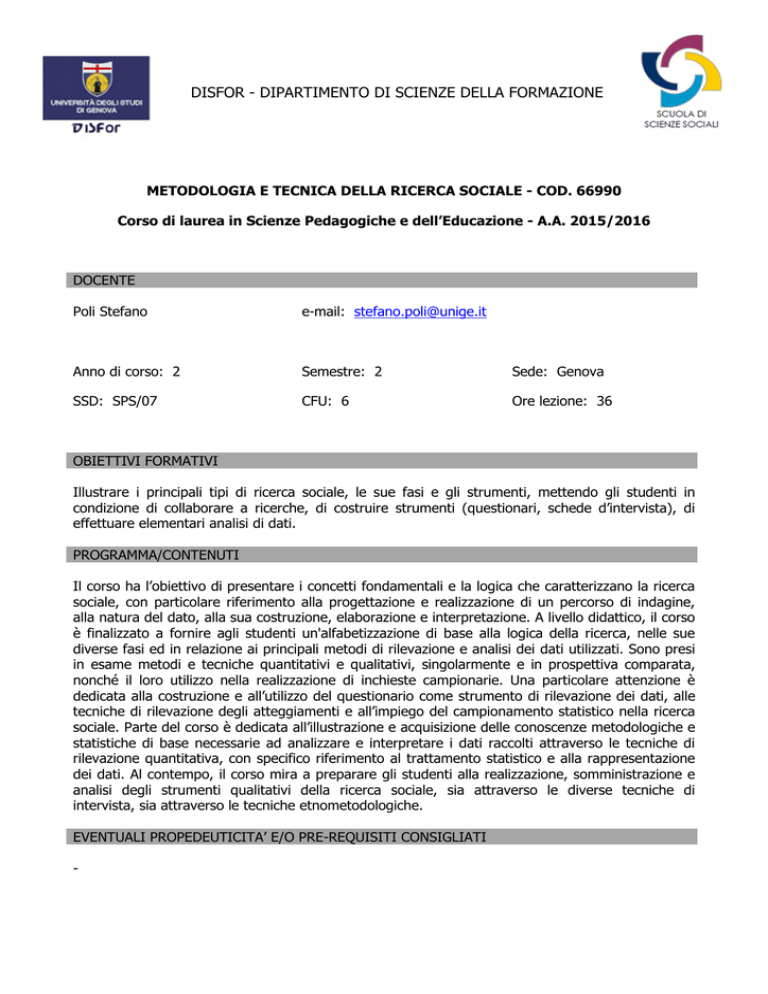DISFOR - DIPARTIMENTO DI SCIENZE DELLA FORMAZIONE METODOLOGIA E TECNICA DELLA RICERCA SOCIALE - COD. 66990 Corso di laurea in Scienze Pedagogiche e dell’Educazione - A.A. 2015/2016 DOCENTE Poli Stefano e-mail: stefano.poli@unige.it Anno di corso: 2 Semestre: 2 Sede: Genova SSD: SPS/07 CFU: 6 Ore lezione: 36 OBIETTIVI FORMATIVI Illustrare i principali tipi di ricerca sociale, le sue fasi e gli strumenti, mettendo gli studenti in condizione di collaborare a ricerche, di costruire strumenti (questionari, schede d’intervista), di effettuare elementari analisi di dati. PROGRAMMA/CONTENUTI Il corso ha l’obiettivo di presentare i concetti fondamentali e la logica che caratterizzano la ricerca sociale, con particolare riferimento alla progettazione e realizzazione di un percorso di indagine, alla natura del dato, alla sua costruzione, elaborazione e interpretazione. A livello didattico, il corso è finalizzato a fornire agli studenti un'alfabetizzazione di base alla logica della ricerca, nelle sue diverse fasi ed in relazione ai principali metodi di rilevazione e analisi dei dati utilizzati. Sono presi in esame metodi e tecniche quantitativi e qualitativi, singolarmente e in prospettiva comparata, nonché il loro utilizzo nella realizzazione di inchieste campionarie. Una particolare attenzione è dedicata alla costruzione e all’utilizzo del questionario come strumento di rilevazione dei dati, alle tecniche di rilevazione degli atteggiamenti e all’impiego del campionamento statistico nella ricerca sociale. Parte del corso è dedicata all’illustrazione e acquisizione delle conoscenze metodologiche e statistiche di base necessarie ad analizzare e interpretare i dati raccolti attraverso le tecniche di rilevazione quantitativa, con specifico riferimento al trattamento statistico e alla rappresentazione dei dati. Al contempo, il corso mira a preparare gli studenti alla realizzazione, somministrazione e analisi degli strumenti qualitativi della ricerca sociale, sia attraverso le diverse tecniche di intervista, sia attraverso le tecniche etnometodologiche. EVENTUALI PROPEDEUTICITA’ E/O PRE-REQUISITI CONSIGLIATI - RISULTATI DI APPRENDIMENTO PREVISTI CONOSCENZA E COMPRENSIONE: Gli studenti devono acquisire adeguate conoscenze e un'efficace capacità di comprensione di/dei fondamenti teorici della disciplina, nonché la capacità di applicare tecniche di indagine quali-quantitive realizzando i relativi strumenti. CAPACITA’ DI APPLICARE CONOSCENZA E COMPRENSIONE: Gli studenti devono essere in grado di applicare le conoscenze acquisite, di comprendere e risolvere problemi riferiti all'impostazione di una ricerca sociale, alla realizzazione e somministrazione dei relativi strumenti. AUTONOMIA DI GIUDIZIO: Gli studenti devono saper utilizzare sia sul piano concettuale che su quello operativo le conoscenze acquisite con autonoma capacità di valutazione e con abilità nei diversi contesti applicativi. ABILITA’ COMUNICATIVE: Gli studenti sapranno acquisire il linguaggio tecnico tipico della disciplina per comunicare in modo chiaro e senza ambiguità con interlocutori specialisti e non specialisti. CAPACITA’ DI APPRENDIMENTO: Gli studenti sapranno sviluppare adeguate capacità di apprendimento che consentano loro di continuare ad approfondire in modo autonomo le principali tematiche della disciplina soprattutto nei contesti lavorativi in cui si troveranno ad operare. MODALITA’ DIDATTICHE, OBBLIGHI, TESTI E MODALITA’ DI ACCERTAMENTO MODALITA’ DIDATTICHE: Lezioni in presenza, con possibilità di partecipazione facoltativa a seminari tematici sui temi trattati, aulaweb PRESENTE SU AULAWEB: Sì OBBLIGHI: TESTI DI STUDIO: • Palumbo M., Garbarino E., Ricerca sociale: metodo e tecniche, FrancoAngeli, 2006, pp.303. Inoltre, come libro di lettura: • Poli. S., Città vecchia, nuovi anziani. Invecchiamento e postmodernità in una periferia metropolitana, FrancoAngeli, Milano, 2012. MODALITA’ DI ACCERTAMENTO: L’esame verrà realizzato in modalità scritta (5 domande a risposta aperta, di cui 4 sul manuale e 1 su libro di lettura), con eventuale integrazione orale qualora richiesta dal docente o dallo studente. RIPETIZIONE DELL’ESAME: Senza preclusioni INFORMAZIONI AGGIUNTIVE PER GLI STUDENTI NON FREQUENTANTI MODALITA’ DIDATTICHE: Possibilità di partecipazione eventuale a seminari tematici sui temi trattati, aulaweb OBBLIGHI: iscrizione su Aulaweb TESTI DI STUDIO: • Palumbo M., Garbarino E., Ricerca sociale: metodo e tecniche, FrancoAngeli, 2006, pp.303. Inoltre, come libro di lettura: • Poli. S., Città vecchia, nuovi anziani. Invecchiamento e postmodernità in una periferia metropolitana, FrancoAngeli, Milano, 2012. MODALITA’ DI ACCERTAMENTO: L’esame verrà realizzato in modalità scritta (5 domande a risposta aperta, di cui 4 sul manuale e 1 su libro di lettura), con eventuale integrazione orale qualora richiesta dal docente o dallo studente. RIPETIZIONE DELL’ESAME: Senza preclusioni NOTE Si invitano tutti gli studenti a consultare periodicamente la pagina di questo insegnamento sul portale dell’e-learning AulaWeb (raggiungibile dal sito di Ateneo o all’indirizzo: www.aulaweb.unige.it ). Tutte le informazioni e i materiali relativi a questo insegnamento sono pubblicate esclusivamente in tale sito.