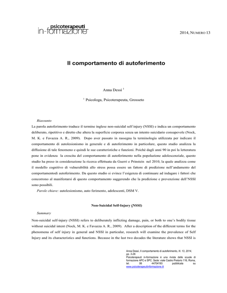 2014, NUMERO 13 Il comportamento di autoferimento Anna Dessì 1 1 Psicologa, Psicoterapeuta, Grosseto Riassunto La parola autoferimento traduce il termine inglese non-suicidal self injury (NSSI) e indica un comportamento deliberato, ripetitivo e diretto che altera la superficie corporea senza un intento suicidario consapevole (Nock, M. K. e Favazza A. R., 2009). Dopo aver passato in rassegna la terminologia utilizzata per indicare il comportamento di autolesionismo in generale e di autoferimento in particolare, questo studio analizza la diffusione di tale fenomeno e quindi le sue caratteristiche e funzioni. Poiché dagli anni 90 in poi la letteratura pone in evidenza la crescita del comportamento di autoferimento nella popolazione adolescenziale, questo studio ha preso in considerazione la ricerca effettuata da Guerri e Prinstein nel 2010, la quale analizza come il modello cognitivo di vulnerabilità allo stress possa essere un fattore di predizione nell’andamento del comportamentodi autoferimento. Da questo studio si evince l’esigenza di continuare ad indagare i fattori che concorrono al manifestarsi di questo comportamento suggerendo che la predizione e prevenzione dell’NSSI sono possibili. Parole chiave: autolesionismo, auto ferimento, adolescenti, DSM V. Non-Suicidal Self-Injury (NSSI) Summary Non-suicidal self-injury (NSSI) refers to deliberately inflicting damage, pain, or both to one’s bodily tissue without suicidal intent (Nock, M. K. e Favazza A. R., 2009). After a description of the different terms for the phenomena of self injury in general and NSSI in particular, research will examine the prevalence of Self Injury and its characteristics and functions. Because in the last two decades the literature shows that NSSI is Anna Dessì, Il comportamento di autoferimento, N. 13, 2014, pp. 3-28. Psicoterapeuti in-formazione è una rivista delle scuole di formazione APC e SPC. Sede: viale Castro Pretorio 116, Roma, tel. 06 44704193 pubblicata su www.psicoterapeutiinformazione.iit Anna Dessì more common in adolescent and young adult populations than previously thought, this research examines Guerri and Prinstein’s study (2010) which tested a cognitive vulnerability-stress model as a predictor of NSSI trajectories. Results from this study suggest that long-term prediction of NSSI may be possible. Key words: self injury, non-suicidal self injury, NSSI, adolescent, DSM V. Introduzione L’autoferimento sta diventando un fenomeno molto diffuso tra gli adolescenti e in letteratura sono rintracciabili numerosi contributi sulle caratteristiche e cause di questo comportamento. L’autoferimento è spesso dovuto ad eventi precipitanti, come ad esempio il reale o percepito abbandono, che provocano nel ragazzo la nascita di emozioni “negative”. L’adolescente che non è in grado di esprimere o gestire queste emozioni negative, spesso mette in atto dei comportamenti di coping maladattivi come il comportamento di autoferimento. La preoccupante crescita di questo fenomeno pone in evidenza la necessità di concentrare importanti energie sullo studio dei fattori di predizione al fine di attuare piani di prevenzione e di trattamento più puntuali e quindi aiutare il ragazzo ad apprendere nuove strategie di coping. Fenomenologia e definizione L’autolesionismo è un fenomeno molto eterogeneo e include pratiche assai diversificate tra loro: noi tutti quando pensiamo all’autolesionismo possiamo immaginare sia una pratica specifica, come il taglio dei polsi, sia associarlo ad un’ idea generica di condotte nocive per la nostra salute e la nostra vita; ci possiamo anche interrogare su quali siano gli elementi che ci fanno considerare la body art una forma d’arte e non di autolesionismo o quali siano i fattori che rendono più accettabile il fumare anziché il torturare il proprio corpo con degli spilli. L’eterogeneità di tale fenomeno ha sollecitato clinici e ricercatori a darne una definizione univoca e esaustiva: un’impresa ardua e forse non utile alla sua comprensione. La terminologia inglese per nominare tale comportamento è numerosa: molto spesso gli autori si trovano in disaccordo tra di loro e utilizzano lo stesso vocabolo per indicare fenomeni molto diversi o, a volte, usano parole diverse per far riferimento allo stesso comportamento. A riprova di ciò, Kahan e Pattison (1984) individuano 18 etichette utilizzate dai clinici per riferirsi a quei comportamenti strettamente autolesionistici e a comportamenti ad essi affini, come l’overdose e il tentato suicidio. 4 Il comportamento di autoferimento Autore Menninger (1938) Graff e Malin (1967) Pao (1969) Morgan et al (1975) Farber (2000) Pattison e Kahan (1983); Gratz (2001) Gardner e Cowdry (1985) Courtois (1988) Figueroa (1988) Mazelis (1990) Favazza (1996) Favazza e Rosenthal (1990) Tantam e Whittaker (1992) Linehan (1993) Herpertz (1995); Claes, Vandereycken Vertommen (2001) Dallam (1997) White, Trepal-Wollenzier, Nolan (2002) Nock e Prinstein (2004) Definizione Partial suicide Wrist-cutting syndrome Delicate self-cutting Non-fatal deliberate self harm Self-harm Deliberate self-harm Parasuicidal behavior Self-damaging behavior Self-destructive behavior Self-inflicted violence Self-mutilation Repetitive self-mutilation Self-wounding Parasuicide Self-injurious behaviors Socially deviant self-injury Self-injury Sel-mutilative behavior Tabella 1. Definizione dei comportamenti di auto ferimento. È stato, quindi, più facile per i clinici classificare queste condotte che darne una definizione esaustiva e esclusiva. Anche se la prima classificazione compare nel 1913 in un articolo di Emerson (1913), la classificazione al giorno d’oggi più accreditata è quella proposta da Favazza e Rosenthal nel 1990 (Favazza e Rosenthal, 1990), in seguito rivista dallo stesso autore insieme a Simeon nel 1995 (Favazza e Simeon, 1995), e raggiunge poi la sua forma definitiva nel 1996 (Favazza, 1996). Secondo l’ultima teorizzazione, Favazza