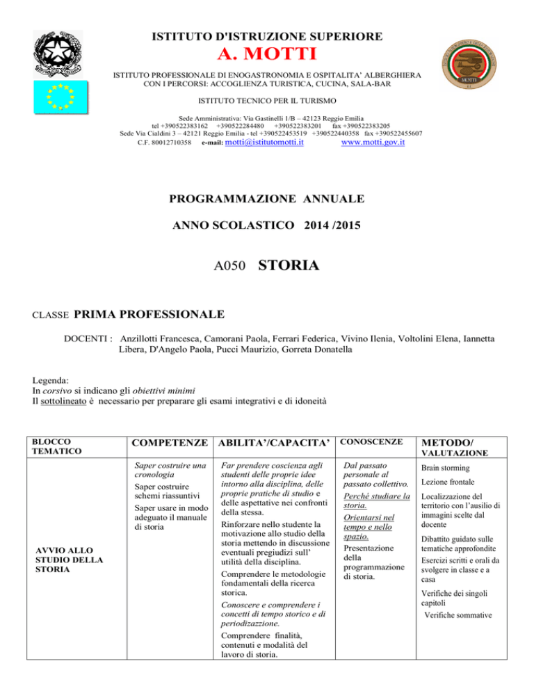 ISTITUTO D'ISTRUZIONE SUPERIORE A. MOTTI ISTITUTO PROFESSIONALE DI ENOGASTRONOMIA E OSPITALITA’ ALBERGHIERA CON I PERCORSI: ACCOGLIENZA TURISTICA, CUCINA, SALA-BAR ISTITUTO TECNICO PER IL TURISMO Sede Amministrativa: Via Gastinelli 1/B – 42123 Reggio Emilia tel +390522383162 +390522284480 +390522383201 fax +390522383205 Sede Via Cialdini 3 – 42121 Reggio Emilia - tel +390522453519 +390522440358 fax +390522455607 C.F. 80012710358 e-mail: motti@istitutomotti.it www.motti.gov.it PROGRAMMAZIONE ANNUALE ANNO SCOLASTICO 2014 /2015 A050 STORIA CLASSE PRIMA PROFESSIONALE DOCENTI : Anzillotti Francesca, Camorani Paola, Ferrari Federica, Vivino Ilenia, Voltolini Elena, Iannetta Libera, D'Angelo Paola, Pucci Maurizio, Gorreta Donatella Legenda: In corsivo si indicano gli obiettivi minimi Il sottolineato è necessario per preparare gli esami integrativi e di idoneità BLOCCO TEMATICO COMPETENZE ABILITA’/CAPACITA’ CONOSCENZE VALUTAZIONE Saper costruire una cronologia Saper costruire schemi riassuntivi Saper usare in modo adeguato il manuale di storia AVVIO ALLO STUDIO DELLA STORIA METODO/ Far prendere coscienza agli studenti delle proprie idee intorno alla disciplina, delle proprie pratiche di studio e delle aspettative nei confronti della stessa. Rinforzare nello studente la motivazione allo studio della storia mettendo in discussione eventuali pregiudizi sull’ utilità della disciplina. Comprendere le metodologie fondamentali della ricerca storica. Conoscere e comprendere i concetti di tempo storico e di periodizazzione. Comprendere finalità, contenuti e modalità del lavoro di storia. Dal passato personale al passato collettivo. Perché studiare la storia. Orientarsi nel tempo e nello spazio. Presentazione della programmazione di storia. Brain storming Lezione frontale Localizzazione del territorio con l’ausilio di immagini scelte dal docente Dibattito guidato sulle tematiche approfondite Esercizi scritti e orali da svolgere in classe e a casa Verifiche dei singoli capitoli Verifiche sommative POPOLAMENTO DELLA TERRA. AMBIENTI, CULTURA MATERIALE Sapere utilizzare i principali concetti delle demografia per comprendere la situazione di una popolazione in una data epoca Conoscere le fasi del popolamento della terra e le sue modalità. Comprendere l’interdipendenza fra consistenza numerica dei gruppi umani, ambienti e culture materiali. Conoscere e comprendere le principali dinamiche demografiche Il periodo dell’ominazione. La rivoluzione neolitica. Il periodo della formazione dei grandi imperi. Le grandi migrazioni. Brain storming Lezione frontale Localizzazione del territorio con l’ausilio di immagini scelte dal docente Dibattito guidato sulle tematiche approfondite Esercizi scritti e orali da svolgere in classe e a casa Verifiche dei singoli capitoli Verifiche sommative Saper collegare i processi migratori alle loro cause e conseguenze Conoscere le forme di organizzazione economica e sociale dell’umanità attraverso il tempo. Individuare e definire le parole chiave della storia economica e sociale. LE FORMAZIONI ECONOMICHE E SOCIALI Società tribali, ambienti,risorse dal paleolitico al neolitico. La civilizzazione neolitica. Le civiltà antiche. Le economie e le società schiavistiche. Brain storming Lezione frontale Localizzazione del territorio con l’ausilio di immagini scelte dal docente Dibattito guidato sulle tematiche approfondite Esercizi scritti e orali da svolgere in classe e a casa Verifiche dei singoli capitoli Verifiche sommative Sapere come distinguere uno stato centralizzato da una civiltà basata su città stato LE ORGANIZZAZZIONI POLITICHE E GIURIDICHE Conoscere le istituzioni politiche e giuridiche del passato. Individuare e definire i termini politici più significativi. Sapere come distinguere un governo oligarchico da uno democratico Le monarchie del Vicino Oriente antico. La struttura della città – stato. L’organizzazione politica e giuridica della Repubblica Romana Brain storming Lezione frontale Localizzazione del territorio con l’ausilio di immagini scelte dal docente Dibattito guidato sulle tematiche approfondite Esercizi scritti e orali da svolgere in classe e a casa Verifiche dei singoli capitoli Verifiche sommative La Costituzione italiana Comprendere l’importanza dei principi della Costituzione per il vivere civile della società italiana Saper analizzare il ruolo dei diversi soggetti pubblici e privati nel promuovere e orientare lo sviluppo economico e sociale, anche alla luce della Costituzione italiana Origine ed evoluzione storica dei principi e dei valori fondativi della Costituzione italiana Brain storming Lezione frontale Localizzazione del territorio con l’ausilio di immagini scelte dal docente Dibattito guidato sulle tematiche approfondite Esercizi scritti e orali da svolgere in classe e a casa Verifiche dei singoli capitoli Verifiche sommative Saper riflettere su alcuni problemi della società attuale e del possibile futuro in relazione alle loro radici. IL MONDO ATTUALE TRA PASSATO E FUTURO Acquisire consapevolezza delle tendenze future della civiltà e attitudine ad interrogarsi su di esse. La mondializzazione. Brain storming La popolazione. Localizzazione del territorio con l’ausilio di immagini scelte dal docente L’ambiente. Razzismo e tolleranza. Un passato di guerre; e il futuro? Lezione frontale Dibattito guidato sulle tematiche approfondite Esercizi scritti e orali da svolgere in classe e a casa Verifiche dei singoli capitoli Verifiche sommative ISTITUTO D'ISTRUZIONE SUPERIORE A. MOTTI ISTITUTO PROFESSIONALE DI ENOGASTRONOMIA E OSPITALITA’ ALBERGHIERA CON I PERCORSI: ACCOGLIENZA TURISTICA, CUCINA, SALA-BAR ISTITUTO TECNICO PER IL TURISMO Sede Amministrativa: Via Gastinelli 1/B – 42123 Reggio Emilia tel +390522383162 +390522284480 +390522383201 fax +390522383205 Sede Via Cialdini 3 – 42121 Reggio Emilia - tel +390522453519 +390522440358 fax +390522455607 C.F. 80012710358 e-mail: motti@istitutomotti.it www.mo