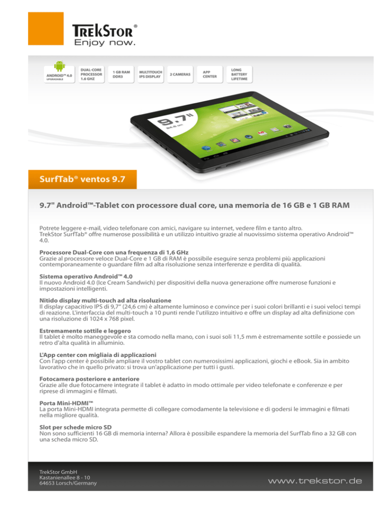 SurfTab® ventos 9.7 9.7" Android™-Tablet con processore dual core, una memoria de 16 GB e 1 GB RAM Potrete leggere e-mail, video telefonare con amici, navigare su internet, vedere film e tanto altro. TrekStor SurfTab® offre numerose possibilità e un utilizzo intuitivo grazie al nuovissimo sistema operativo Android™ 4.0. Processore Dual-Core con una frequenza di 1,6 GHz Grazie al processore veloce Dual-Core e 1 GB di RAM è possibile eseguire senza problemi più applicazioni contemporaneamente o guardare film ad alta risoluzione senza interferenze e perdita di qualità. Sistema operativo Android™ 4.0 Il nuovo Android 4.0 (Ice Cream Sandwich) per dispositivi della nuova generazione offre numerose funzioni e impostazioni intelligenti. Nitido display multi-touch ad alta risoluzione Il display capacitivo IPS di 9,7“ (24,6 cm) è altamente luminoso e convince per i suoi colori brillanti e i suoi veloci tempi di reazione. L'interfaccia del multi-touch a 10 punti rende l'utilizzo intuitivo e offre un display ad alta definizione con una risoluzione di 1024 x 768 pixel. Estremamente sottile e leggero Il tablet è molto maneggevole e sta comodo nella mano, con i suoi soli 11,5 mm è estremamente sottile e possiede un retro d'alta qualità in alluminio. L'App center con migliaia di applicazioni Con l'app center è possibile ampliare il vostro tablet con numerosissimi applicazioni, giochi e eBook. Sia in ambito lavorativo che in quello privato: si trova un'applicazione per tutti i gusti. Fotocamera posteriore e anteriore Grazie alle due fotocamere integrate il tablet è adatto in modo ottimale per video telefonate e conferenze e per riprese di immagini e filmati. Porta Mini-HDMI™ La porta Mini-HDMI integrata permette di collegare comodamente la televisione e di godersi le immagini e filmati nella migliore qualità. Slot per schede micro SD Non sono sufficienti 16 GB di memoria interna? Allora è possibile espandere la memoria del SurfTab fino a 32 GB con una scheda micro SD. TrekStor GmbH Kastanienallee 8 - 10 64653 Lorsch/Germany www.trekstor.de SurfTab® ventos 9.7 9.7" Android™-Tablet con processore dual core, una memoria de 16 GB e 1 GB RAM Connessione senza fili tramite wireless e Bluetooth® La connessione Wi-Fi con lo standard 802.11 b/g/n permette di navigare high speed su internet. Il veloce Bluetooth permette anche lo scambio di dati con altri dispositivi. Multimedia in full HD e divertimento nei giochi Il supporto di tantissimi formati permette la riproduzione della maggior parte dei formati di immagini, audio e video come i file MKV con Codec H.264 in risoluzione 1080p full HD. Il potente processore grafico 4-Core Mali-400 MP supporta inoltre tanti giochi di sport e di azione in 3D. TrekStor GmbH Kastanienallee 8 - 10 64653 Lorsch/Germany www.trekstor.de SurfTab® ventos 9.7 Dettagli tecnici Hardware Interfaccia Mini HDMI connector (female), Stereo Audio out, Microfono, Bluetooth®, WiFi, 1 x Micro-USB 2.0 connector (female), Fotocamera, Lettore di schede Lettore di schede microSD, microSDHC (max. 32 GB) Tipo di display IPS 10 point multitouch capacitive screen Formato dello schermo 24.6 cm (9.7") Risoluzione dello schermo 1024 x 768 Pixel Camera Trasera: 2.0 MP, Front: 0.3 MP Graphic Unit (GPU) Mali-400 MP (400MHz, 4 cores) Capacità di memoria 16 GB Processor (CPU) Cortex A9 dual core, 1.6 GHz 1 GB (DDR 3) G-Sensor Rotazione automatica in 4 direzioni Materiale alloggiamento Alluminio, Plastica Dimensioni (L x A x P) 243 mm x 190 mm x 11.5 mm Peso circa 620 g (solo apparecchio/senza accessori) Registrazione e riproduzione Formato immagine 4:3 Formati immagini supportati BMP, JPEG, GIF, PNG, Supporto per il formato addizionale tramite plugin o applicazioni Max. video-resolution 1080p Gaming 3D games, G-Sensor games, Classic games, Touch games Formati audio riproducibili MP3, WAV, OGG, AAC, FLAC, Supporto per il formato addizionale tramite plugin o applicazioni Formati video riproducibili MPEG-4.2 SP/ASP (per esempio Xvid a 1080p), WMV9/VC-1, MPEG-4.10 H.264/AVC (MP@L4.1, HP@L4.0), Supporto per il formato addizionale tramite plugin o applicazioni Formati video container AVI, MKV, MOV, WMV, RM, RMVB, Supporto per il formato addizionale tramite plugin o applicazioni Internet connessione WiFi TrekStor GmbH Kastanienallee 8 - 10 64653 Lorsch/Germany IEEE 802.11b/g/n www.trekstor.de SurfTab® ventos 9.7 Dettagli tecnici Altre caratteristiche Autonomia massima ca. 10 ore (WiFi on), ca. 12 ore (WiFi off ), Standby (ca. 5 giorni) Tempo di caricamento ca. 3 ore Alimentazione elettrica Batteria ai polimeri di litio (8000mAh) Sistemo operativo Android™ 4.0 (Ice Cream Sandwich) Software L'accesso a migliaia di applicazioni Lingue Supporto multilingue per Android™ OS 4.0 Contenuto della confezione SurfTab® ventos 9.7, Cavo Hi-Speed USB 2.0 (USB-A / Micro-USB), Hi-Speed USB 2.0 Host-Adaptercable (Micro-USB / USB-A (female)), Panno di pulizia, Alimentatore (100 V - 240 V), Guida Rapida Scheda di memoria non inclusa. Con riserva di modifiche e correzioni. Ulteriori informazioni e accessori li trovate qui http://www.trekstor.it/detail-surftabs-it/product/surftab-ventos-97.html TrekStor GmbH Kastanienallee 8 - 10 64653 Lorsch/Germany www.trekstor.de