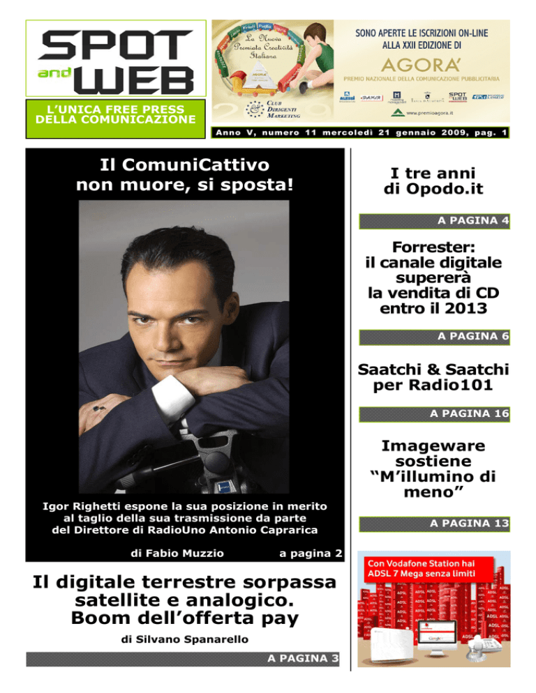 L’UNICA FREE PRESS DELLA COMUNICAZIONE Anno V, III, numero numero 11 12,mercoledì martedì 23 21 gennaio gennaio 2007, 2009, pag. 1 Il ComuniCattivo non muore, si sposta! I tre anni di Opodo.it A PAGINA 4 Forrester: il canale digitale supererà la vendita di CD entro il 2013 A PAGINA 6 Saatchi & Saatchi per Radio101 A PAGINA 16 Igor Righetti espone la sua posizione in merito al taglio della sua trasmissione da parte del Direttore di RadioUno Antonio Caprarica di Fabio Muzzio a pagina 2 Il digitale terrestre sorpassa satellite e analogico. Boom dell’offerta pay di Silvano Spanarello A PAGINA 3 Imageware sostiene “M’illumino di meno” A PAGINA 13 Anno 5 - numero 11 mercoledì 21 gennaio 2009 - pag. 2 Il ComuniCattivo non muore, si sposta! Igor Righetti espone la sua posizione in merito al taglio della sua trasmissione da parte del Direttore di RadioUno Antonio Caprarica di Fabio Muzzio Da due giorni prosegue una serrata polemica all’interno di RadioUno, per il taglio che Antonio Caprarica ha deciso all’interno del palinsesto del primo canale pubblico italiano. Il Direttore ha, infatti, deciso di eliminare una delle trasmissioni più note e importanti del panorama italiano, Il ComuniCattivo di Igor Righetti, che verrà sostituito da altre trasmissioni condotte da Uto Ughi e Italo Moscati. Una scelta che ieri ha indotto Caprarica a dichiarare di aver passato il caso all’ufficio legale. Si profila quindi un cambio di target che da pubblico affezionato e giovane si sposta su una scelta culturale di valore, ma totalmente differente. Sulla vicenda abbiamo sentito Righetti, al quale abbiamo risolto alcune domande. Il ComuniCattivo è stato tagliato: solo problema di ascolti? “Non certo di costi, perché è un programma che viene realizzato con quattro soldi da tre persone, senza regista, senza altri autori, e che conduco direttamente io. Caprarica parla di débâcle negli ascolti: ma perché non parla dei dati audiradio per quarti d’ora? Non prendiamo in giro i colleghi. Io non ho detto che Radiouno non sia la prima radio italiana, ma certo non si può dire che io sono crollato negli ascolti: sono sceso dello 0,3% - 0,4%, altri dell’11%, del 12% oppure del 32%. Io ho più di 500mila ascoltatori non 150mila. Se vuoi sperimentare chiudi i programmi con buoni ascolti, l’unico dedicato ai giovani e per i giovani? Vogliamo una radio tipo Villa Arzilla o con le badanti? I giovani sono il futuro e se ti perdi uno dei pochi programmi che parlano ai giovani... non ci sono parole... Sia chiaro che non discuto i sostituti”. La trasmissione aveva avuto già problemi? “Già c’era stato il primo spostamento dalla fascia pomeridiana al week-end, con la giustificazione che fosse, quella dalle 10.30 alle 1- 1.00, di pregio e io sono riuscito a farla risalire. La lascio, quindi, con ascolti più alti. Da Facebook, e dai vari siti arrivano migliaia di e-mail di sostegno da parte degli ascoltatori. Comunque dal 1° febbraio sono free e posso già confermare che mi sono arrivate diverse offerte dai network privati, ma non ho deciso ancora nulla. In compenso mi porto via i miei 500mila ascoltatori che a Caprarica, evidentemente fanno schifo. Sottolineo pure un altro aspetto: ai dati audiradio si devono aggiungere tutti i contatti che arrivano dal sito, perchè la trasmissione si può ascoltare e scaricare anche in modalità podcasting e real player, che non appartegono al target anziano. Il Comunicattore, poi, è pure trasmesso per gli italiani all’estero su Radio International, non certo per una scelta di Radiouno. Visto che a loro non interesso più me ne vado con il mio gruzzoletto di ascoltatori e i miei contatti, facendo la felicità dei network. Caprarica non vuole svecchiare il canale che dirige”. Il Direttore Caprarica non ha fornito altre motivazioni? “No, ha parlato solo del calo e di avvicendamento, ma la mia trasmissione è in onda solo da sei anni e le 1400 puntate sono poche se raffrontate ad altri programmi in onda da decenni. Una questione di linea editoriale? Il Comunicattivo non ha bavagli e a dimostrazione della sua imparzialità ho ricevuto solidarietà da esponenti di diversi partiti. La mia linea è sempre stata quella di affiancare a un ospite di destra uno di sinistra, anche perchè i miei ascoltatori non mi avrebbero mai perdonato una condotta diversa e di sgarrare. Il mio motto è dare spazio a tutti”. Dal prossimo mese cosa farà Righetti? “Adesso esce il terzo libro per De Agostini, con il titolo Felici come mosche in un Paese di stitici, e titolo mai più fu profetico per la mia situazione. Nel libro racconto l’Italia gerontocratica, nella quale il potere è fon- dato sulla prostata. Poi c’è l’altra Italia, con il pubblico fidelizzato: se qualcuno chiama in trasmissione antepone al suo nome prima sono il ComuniCattivo... Sono nati gruppi, spille, cappellini, magliette, insomma una comunità che si incontra e che ha il suo modo di essere. A questo punto posso dedurre che a Caprarica e alla Rai non interessa questo mondo e non ha bisogno delle aziende che investono e si rivolgono a questo target. Continuerò poi a collaborare nelle fiction e con Pupi Avati, come sempre”. L’esprienza in Rai, comunque non si interrompe: “No, proseguirà con la televisione su Rai2 con l’Italia allo specchio. Con la radio, invece, chiudo il 31, ma non si tratta di un addio, ma solo un arrivederci da un altra parte”. Un’ultima domanda: che messaggio vuole dare? “Che voglio rimanere libero, Caprarica mi vuole intimidire, ma io non mi faccio mettere lacci e lacciuoli, perchè dove non mi trovo bene me ne vado. Qui sono stato cacciato senza una motivazione, tantomeno di critica, molto buona nei miei confronti. La mia trasmissione, insieme a quella di Fiorello, era la più gettonata del palinsesto, quella di cui si parlava di più, con un riconoscimento come il Leggio d’oro. Ma non finisce qui: adesso c’è il libro con le sue date di presentazione, l’