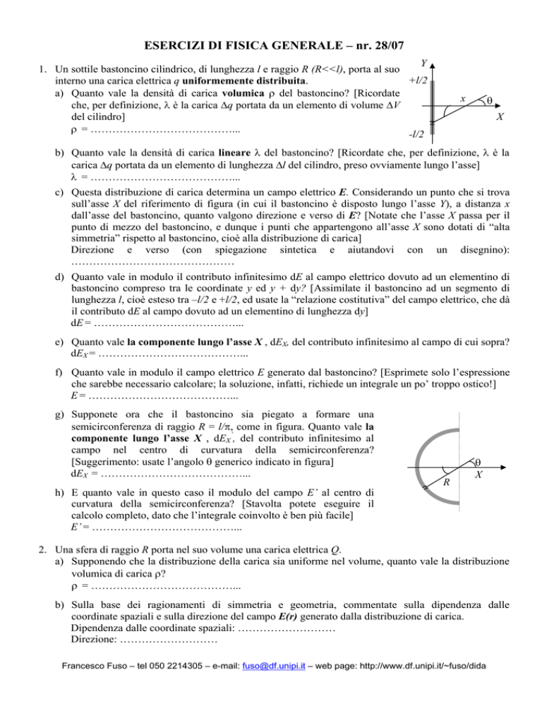 ESERCIZI DI FISICA GENERALE – nr. 28/07 Y 1. Un sottile bastoncino cilindrico, di lunghezza l e raggio R (R<<l), porta al suo +l/2 interno una carica elettrica q uniformemente distribuita. a) Quanto vale la densità di carica volumica ρ del bastoncino? [Ricordate che, per definizione, λ è la carica Δq portata da un elemento di volume ΔV del cilindro] ρ = …………………………………... -l/2 θ x X b) Quanto vale la densità di carica lineare λ del bastoncino? [Ricordate che, per definizione, λ è la carica Δq portata da un elemento di lunghezza Δl del cilindro, preso ovviamente lungo l’asse] λ = …………………………………... c) Questa distribuzione di carica determina un campo elettrico E. Considerando un punto che si trova sull’asse X del riferimento di figura (in cui il bastoncino è disposto lungo l’asse Y), a distanza x dall’asse del bastoncino, quanto valgono direzione e verso di E? [Notate che l’asse X passa per il punto di mezzo del bastoncino, e dunque i punti che appartengono all’asse X sono dotati di “alta simmetria” rispetto al bastoncino, cioè alla distribuzione di carica] Direzione e verso (con spiegazione sintetica e aiutandovi con un disegnino): ……………………………………… d) Quanto vale in modulo il contributo infinitesimo dE al campo elettrico dovuto ad un elementino di bastoncino compreso tra le coordinate y ed y + dy? [Assimilate il bastoncino ad un segmento di lunghezza l, cioè esteso tra –l/2 e +l/2, ed usate la “relazione costitutiva” del campo elettrico, che dà il contributo dE al campo dovuto ad un elementino di lunghezza dy] dE = …………………………………... e) Quanto vale la componente lungo l’asse X , dEX, del contributo infinitesimo al campo di cui sopra? dEX = …………………………………... f) Quanto vale in modulo il campo elettrico E generato dal bastoncino? [Esprimete solo l’espressione che sarebbe necessario calcolare; la soluzione, infatti, richiede un integrale un po’ troppo ostico!] E = …………………………………... g) Supponete ora che il bastoncino sia piegato a formare una semicirconferenza di raggio R = l/π, come in figura. Quanto vale la componente lungo l’asse X , dEX’, del contributo infinitesimo al campo nel centro di curvatura della semicirconferenza? [Suggerimento: usate l’angolo θ generico indicato in figura] dEX’ = …………………………………... R θ X h) E quanto vale in questo caso il modulo del campo E’ al centro di curvatura della semicirconferenza? [Stavolta potete eseguire il calcolo completo, dato che l’integrale coinvolto è ben più facile] E’ = …………………………………... 2. Una sfera di raggio R porta nel suo volume una carica elettrica Q. a) Supponendo che la distribuzione della carica sia uniforme nel volume, quanto vale la distribuzione volumica di carica ρ? ρ = …………………………………... b) Sulla base dei ragionamenti di simmetria e geometria, commentate sulla dipendenza dalle coordinate spaziali e sulla direzione del campo E(r) generato dalla distribuzione di carica. Dipendenza dalle coordinate spaziali: ……………………… Direzione: ……………………… Francesco Fuso – tel 050 2214305 – e-mail: fuso@df.unipi.it – web page: http://www.df.unipi.it/~fuso/dida c) Come si esprime il flusso del campo elettrico Φ(E) su una sfera di raggio r concentrica alla sfera assegnata? Φ(Ε) = …………………………………... d) Quanto vale in modulo il campo elettrico E(r) in un punto a distanza generica r dal centro della sfera? [Distinguete i due casi punto all’interno e all’esterno, cioè r < R ed r > R, ed applicate il teorema di Gauss!] E(r) = …………………………………... per r < R E(r) = …………………………………... per r > R e) Quanto vale il potenziale elettrico φ a cui si trova la superficie della sfera? [Considerate che il “potenziale” è la differenza di potenziale V(r) rispetto ad un punto di riferimento collocato all’infinito e che per convenzione il potenziale elettrico all’infinito si può porre pari a zero] φ = …………………………………... f) E quanto vale il potenziale elettrico φ0 al centro della sfera? φ0 = …………………………………... P g) Supponete ora che all’interno della sfera e decentrata rispetto al suo centro ci sia una “cavità” sferica di raggio R0 < R, in cui non si trova carica elettrica: chiamate a la distanza del centro della cavità rispetto al centro della sfera (vedi figura). Supponendo che la densità di carica volumica rimanga la stessa ρ calcolata sopra, quanto vale la nuova carica totale Q’ portata dalla sfera? Q’ = …………………………………... r’ r R0 R a h) E quanto vale, in queste condizioni, il modulo del campo E’(r) in un punto distante r>R dal centro della sfera di raggio R? Chiamate r’ la distanza tra il punto e il centro della sfera di raggio R0. [Suggerimento: ricordate il principio di sovrapposizione e tenete conto che, per “annullare” una carica, è sufficiente sommare una carica di segno opposto] E’(r) = …………………………………... Francesco Fuso – tel 050 2214305 – e-mail: fuso@df.unipi.it – web page: http://www.df.unipi.it/~fuso/dida