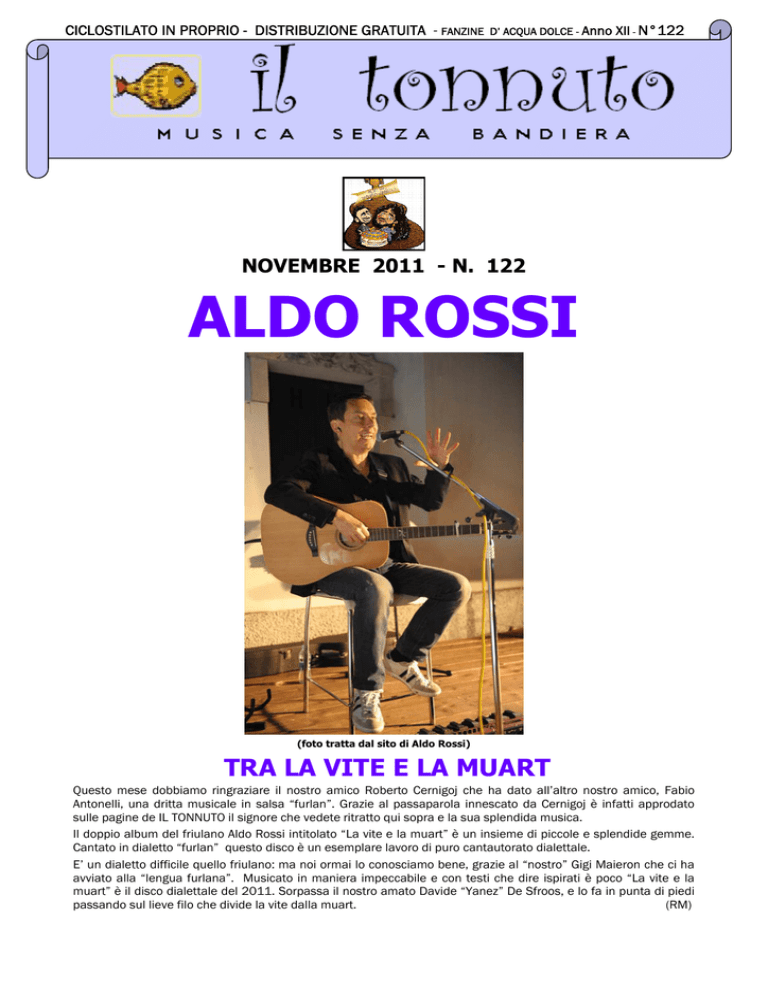 CICLOSTILATO IN PROPRIO - DISTRIBUZIONE GRATUITA - FANZINE D’ ACQUA DOLCE - Anno XII - N°122 NOVEMBRE 2011 - N. 122 ALDO ROSSI (foto tratta dal sito di Aldo Rossi) TRA LA VITE E LA MUART Questo mese dobbiamo ringraziare il nostro amico Roberto Cernigoj che ha dato all’altro nostro amico, Fabio Antonelli, una dritta musicale in salsa “furlan”. Grazie al passaparola innescato da Cernigoj è infatti approdato sulle pagine de IL TONNUTO il signore che vedete ritratto qui sopra e la sua splendida musica. Il doppio album del friulano Aldo Rossi intitolato “La vite e la muart” è un insieme di piccole e splendide gemme. Cantato in dialetto “furlan” questo disco è un esemplare lavoro di puro cantautorato dialettale. E’ un dialetto difficile quello friulano: ma noi ormai lo conosciamo bene, grazie al “nostro” Gigi Maieron che ci ha avviato alla “lengua furlana”. Musicato in maniera impeccabile e con testi che dire ispirati è poco “La vite e la muart” è il disco dialettale del 2011. Sorpassa il nostro amato Davide “Yanez” De Sfroos, e lo fa in punta di piedi passando sul lieve filo che divide la vite dalla muart. (RM) DISCHI DEL MESE ALDO ROSSI “LA VITE E LA MUART” di Fabio Antonelli La vita e la morte non risparmiano nessuno “Par fâ dal mâl baste nome un secont, par fâ dal ben la vite di un om” (Aldo Rossi - “A là su”) (“Per fare del male basta solo un secondo Per far del bene la vita di un uomo”) (Aldo Rossi - “Lassù”) Se non esiste forse una scuola genovese legata alla canzone d’autore, ancor meno si può parlare di una scuola friulana, perché a mancare qui, è sicuramente un epigono, una guida cui fare riferimento. E’ però innegabile che da questa terra di confine, spesso ancorata alla difficile vita di montagna, dove l’esistenza umana è fatta di sacrifici per strappare di che vivere a una terra difficile e avida, continuano a emergere figure di grande rilievo nell’ottica di quella canzone che definirei di qualità, se proprio non desideriamo utilizzare il termine “cantautorale” che vuol dire tutto e nulla e finisce per assumere un’accezione più negativa e limitativa, che positiva. Così, dopo i nomi forse più noti di Luigi Maieron e Lino Straulino; ecco un’altra nuova figura emergente, Aldo Rossi che poi, tanto nuova alla musica non è, se annovera alle proprie spalle già tre album. Come per i suoi colleghi, le sue canzoni nascono e sono pensate in “lengua furlana”, ma pur restando fedeli alla tradizione lessicale, trattano spesso temi universali. Anzi in questo disco si può dire che la tematica affrontata riguarda davvero tutti indistintamente e s’intuisce già dal titolo “La vite e la muart”, cioè “La vita e la morte”. E’ un disco pensato e ripensato, tanto che a un certo punto sembrava che il progetto non dovesse neppure più andare in porto, invece, piano piano, il tutto ha preso forma e il materiale compositivo è stato così abbondante da andare a formare un doppio album, un disco A intitolato “La vite” e un disco B “La muart”, per un totale di venti tracce e poco più di un’ora di musica. In questo duplice album, tutte le canzoni sono state pensate, scritte e musicate da Aldo Rossi ad eccezione delle tracce “Jo mûr” (“Muoio”) che altro non è che la cover di “Just dance” di Lady Gaga; “Preiere di Nadâl” (“Preghiera di Natale”) il cui testo è una poesia di padre Toni Bellina, un sacerdote, scrittore, giornalista e traduttore italiano di lingua friulana scomparso nel 2007; “La balade dal Pizighet” (“La ballata del becchino”) che è una cover dei Mitili FLK (band friulana) e comprende una discussione avvenuta via e-mail con Guido Carrara, ex chitarrista del gruppo e autore del brano stesso; “La so puema” (“La sua ragazza”) un testo di Giorgio Ferigo, un medico, scrittore, storico, e musicista italiano anche lui scomparso nel 2007 e musicato da Aldo; infine “Si podès” (“Se potessi”) un suo adattamento in friulano della poesia “Istanti” di Jorge Luis Borges. E’ ovviamente un disco di puro artigianato e per di più realizzato in piena autonomia, sia dal punto di vista produttivo sia da quello prettamente esecutivo, se si pensa che tutte le chitarre presenti sono state suonate da lui, così come da Aldo sono state realizzate le programmazioni dei computer di tutti gli strumenti utilizzati, eccezione fatta per l’esecuzione al pianoforte di “Preiere di Nadâl” a cura dell’autore stesso della musica di quel brano, ossia il pianista jazz friulano Rudy Fantin. Il disco promette di volare alto: “La morte compie un fulmineo montaggio della nostra vita: ossia sceglie i suoi momenti veramente significativi e li mette in successione (…) solo grazie alla morte, la nostra vita ci serve ad esprimerci” Questa è, infatti, la citazione di Pier Paolo Pasolini riportata in contro copertina da Aldo Rossi. Mantiene però le promesse? Cominciamo con il dire che i linguaggi musicali utilizzati da Aldo nell’affrontare i diversi temi sono quanto di più vario si possa immaginare, per cui si passa dal rock, al folk, alla ballade, alla beguine e così via. E’ ovvio che, così facendo, se da un certo punto vista si ottiene il vantaggio di rendere il disco più vario e piacevole, vista anche la difficoltà oggettiva dell’essere quasi totalmente cantato in lingua friulana, in compenso si finisce per rendere un po’ meno compatto l’intero progetto. Personalmente, ad esempio, tra i due dischi preferisco il secondo, quello dedicato alla morte, più triste e malinconico, ma anche più umanamente comprensibile come lo è l’irrevocabilità della morte, proprio come avviene nell’affrontare ad esempio la Divina Commedia, dove ci si sente più vicini all’umanità relegata all’inferno che non a quella lontana, quasi asettica, del Paradiso. Comunque del primo disco porrei l’accento almeno su “None” (“Nonna”) una bella e commov