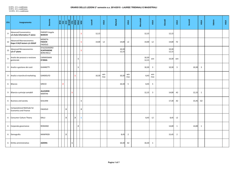 6 CFU - 4 h. a settimana 9 CFU - 6 h. a settimana 12 CFU - 8 h. a settimana 9 Advanced Econometrics c/o Aula informatica 3° piano PARENTI Angela BIANCHI 1 12,15 12 Advanced Macroeconomics Dopo il 24/3 lezioni c/o SSSUP MONETA FIASCHI FAGIOLO 1 14,00 12 Advanced Microeconomics c/o 3° piano D'ALESSANDRO SCAPPARONE BONCINELLI 1 9 Analisi dei processi e revisione gestionale CARMIGNANI D'ONZA 1 10,30 12,15 win 10,30 win 9 Analisi e gestione dei costi GIANNETTI 1 10,30 3 10,30 3 10,30 3 9 Analisi e ricerche di marketing GANDOLFO 6 Bilancio GRECO 9 Bilancio e principi contabili ALLEGRINI MARTINI 14,00 A2 12,15 1 6 Business and society GIULIANI 17,30 A2 15,45 G2 6 Computational Methods for Economics and Finance FAGIOLO 3 6 Consumer Culture Theory DALLI 3 8,45 L2 6 Corporate governance ROMANO 14,00 1 14,00 1 6 Demografia MANFREDI 15,45 2 6 Diritto amministrativo AZZENA 1 12,15 L2 14,00 L2 14,00 12,15 L2 10,30 12,15 10,30 win mac 2 14,00 F2 10,30 12,15 10,30 win mac 8,45 win mac 10,30 5 8,45 5 12,15 3 1 1 2 2 1 8,45 L2 2 2 1 Pagina 1 di 7 8,45 2 10,30 A2 10,30 1 AULA Sabato AULA Venerdì AULA Giovedì AULA Mercoledì AULA Martedì AULA Lunedì CPA MRM SMeC MSE Insegnamento BFM EAZ ECO BFAMF Docente CFU ORARIO DELLE LEZIONI 2° semestre a.a. 2014/2015 - LAUREE TRIENNALI E MAGISTRALI 6 CFU - 4 h. a settimana 9 CFU - 6 h. a settimana 12 CFU - 8 h. a settimana 9 Diritto commerciale CALVOSA 9 Diritto commerciale -­‐ Corso A PINTO 9 Diritto commerciale -­‐ Corso B IERMANO 6 Diritto dei mercati finanziari PINTO 6 Diritto dell’Unione Europea MUT su Diritto Unione Europea -­‐ PASQUALI Leonardo Dip. Giurisprudenza 6 Diritto delle assicurazioni GAGLIARDI Maria 6 Diritto delle public utilities MILAZZO 6 6 6 Diritto industriale e della concorrenza KUTUFA' Ilaria MUT su Diritto industriale -­‐ Dip. Giurisprudenza Diritto privato dell’economia e dell’azienda PELLECCHIA Enza MUT su Diritto privato economia -­‐ Dip. Giurisprudenza Diritto pubblico dell’economia PASSALACQUA MUT su Diritto pubblico economia Michela -­‐ Dip. Giurisprudenza 6 Diritto tributario dell’impresa BELLE' ZANOTTI 6 Economia dei settori regolamentati ZARONE BARONI 9 Economia del mercato mobiliare QUIRICI LAZZERETTI 6 Economia dell’informazione GUIDI 2 12,15 5 3 2 12,15 5 12,15 5 8,45 5 3 2 12,15 4 12,15 4 8,45 4 15,45 A2 12,15 F2 10,30 4 15,45 5 A2 3 2 2 3 3 12,15 L2 10,30 1 12,15 F2 1 3 3 3 3 2 1 1 2 8,45 G2 8,45 2 1 1 1 15,45 5 Pagina 2 di 7 10,30 4 14,00 B 15,45 4 G2 15,45 5 AULA Sabato AULA Venerdì AULA Giovedì AULA A 12,15 12,15 Mercoledì 8,45 1 5 AULA Martedì AULA Lunedì CPA MRM SMeC MSE Insegnamento BFM EAZ ECO BFAMF Docente CFU ORARIO DELLE LEZIONI 2° semestre a.a. 2014/2015 - LAUREE TRIENNALI E MAGISTRALI 6 CFU - 4 h. a settimana 9 CFU - 6 h. a settimana 12 CFU - 8 h. a settimana 9 Economia delle aziende di assicurazione CAPPIELLO TRASO 9 Economia delle aziende e amministrazioni pubbliche LAZZINI ANSELMI 6 Economia dello sviluppo D'ALESSANDRO 6 Economia e gestione dell’innovazione LANZARA 9 Economia e gestione delle imprese GANDOLFO 9 Economia e gestione delle imprese -­‐ LANZARA corso A 9 2 10,30 10,30 12,15 3 3 2 F2 12,15 F2 10,30 G2 10,30 F2 14,00 A2 10,30 G2 8,45 F2 8,45 A2 12,15 A 10,30 5 2 12,15 C 10,30 C 10,30 C Economia e gestione delle imprese -­‐ ANGELINI corso B 2 12,15 B 10,30 B 10,30 B 6 Economia e gestione delle imprese TONGIANI commerciali 3 3 14,00 C 6 Economia e gestione delle imprese TONGIANI commerciali II 6 Economia e storia delle crisi finanziarie 9 Economia e strategie del mercato QUIRICI mobiliare 6 Economia monetaria RUIZ 6 Economic Ethics GUIDI 3 6 Economic history FEDERICO 3 3 2 1 3 12,15 A 2 CONTI Giuseppe 2 2 2 12,15 3 15,45 2 8,45 2 8,45 G2 3 1 10,30 G2 12,15 Pagina 3 di 7 17,30 C 15,45 1 14,00 L2 14,00 G2 10,30 12,15 (Es) 5 A 10,30 5 8,45 F2 8,45 F2 F2 AULA Sabato AULA Venerdì AULA Giovedì AULA Mercoledì AULA Martedì AULA Lunedì CPA MRM SMeC MSE Insegnamento BFM EAZ ECO BFAMF Docente CFU ORARIO DELLE LEZIONI 2° semestre a.a. 2014/2015 - LAUREE TRIENNALI E MAGISTRALI 6 CFU - 4 h. a settimana 9 CFU - 6 h. a settimana 12 CFU - 8 h. a settimana 9 Economic Policy CHILOSI 2 6 Economics and management of innovation c/o SSSUP DOSI 1 6 Financial Economics c/o SSSUP BOTTAZZI 2 6 Finanziamenti di aziende FAVA 6 Gestione commerciale e logistica MUT su Economia e gestione imprese commerciali II TONGIANI 6 Industrial Economics SALVADORI 12 MECCHERI Industrial organization e teoria dei FANTI giochi SALVADORI 6 Intervento pubblico e impresa BRUNETTI CORSINI 9 Introduzione all’econometria BINOTTI 3 6 Istituzioni di diritto pubblico MILAZZO 2 Lettorato Lingua Francese LE GUENANFF Lettorato Lingua Inglese RISTEVSKI LORI Lettorato Lingua Spagnola CARLOS ANSO Lettorato Lingua Tedesca ELISABETH KRAMMER 10,30 L2 10,30 1 1 1 1 1 1 12,15 F2 12,15 L2 15,45 A2 14,00 F2 8,45 3 14,00 5 15,45 win mac 14,00 5 Lezioni organizzate da Dipartimento di Scienze Politiche. Per l'orario vai al sito: 12,15 B 12,15 A 12,15 A 15,45 A2 12,15 C 15,45 3 15,45 win mac F2 http://www.sp.unipi.it/images/materiali_2015/orario_secondo_semestre_1415/L16def.pdf A2 AULA Sabato A2 http://www.sp.unipi.it/images/materiali_2015/orario_secondo_semestre_1415/L16def.pdf 8,45 12,15 Pagina 4 di 7 AULA 14,00 10,30 Lezioni organizzate da Dipartimento di Scienze Politiche. Per l'orario vai al sito: L2 15,45 15,45 mac Venerdì AULA Giovedì AULA L2 2 2 Mercoledì AULA Martedì AULA Lunedì CPA MRM SMeC MSE Insegnamento BFM EAZ ECO BFAMF Docente CFU ORARIO DELLE LEZIONI 2° semestre a.a. 2014/2015 - LAUREE TRIENNALI E MAGISTRALI 6 CFU - 4 h. a settimana 9 CFU - 6 h. a settimana 12 CFU - 8 h. a settimana 9 Management internazionale GIULIANI 3 6 Marketing e qualità del prodotto TARABELLA 6 Matematica per l’economia SODINI 6 Metodi computazionali per la finanza CAMBINI 6 Metodi matematici per la finanza aziendale MARCHI Anna 6 Metodi statistici per le decisioni aziendali PALLINI 6 Modelli demografici per la ricerca MAN