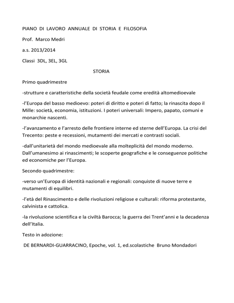 PIANO DI LAVORO ANNUALE DI STORIA E FILOSOFIA Prof. Marco Medri a.s. 2013/2014 Classi 3DL, 3EL, 3GL STORIA Primo quadrimestre -strutture e caratteristiche della società feudale come eredità altomedioevale -l’Europa del basso medioevo: poteri di diritto e poteri di fatto; la rinascita dopo il Mille: società, economia, istituzioni. I poteri universali: Impero, papato, comuni e monarchie nascenti. -l’avanzamento e l’arresto delle frontiere interne ed sterne dell’Europa. La crisi del Trecento: peste e recessioni, mutamenti dei mercati e contrasti sociali. -dall’unitarietà del mondo medioevale alla molteplicità del mondo moderno. Dall’umanesimo ai rinascimenti; le scoperte geografiche e le conseguenze politiche ed economiche per l’Europa. Secondo quadrimestre: -verso un’Europa di identità nazionali e regionali: conquiste di nuove terre e mutamenti di equilibri. -l’età del Rinascimento e delle rivoluzioni religiose e culturali: riforma protestante, calvinista e cattolica. -la rivoluzione scientifica e la civiltà Barocca; la guerra dei Trent’anni e la decadenza dell’Italia. Testo in adozione: DE BERNARDI-GUARRACINO, Epoche, vol. 1, ed.scolastiche Bruno Mondadori FILOSOFIA Primo quadrimestre: -filosofia, filosofare e storia della filosofia -la nascita della filosofia in Grecia e i primi filosofi -la filosofia e la polis: i sofisti e SOCRATE -PLATONE Secondo quadrimestre -ARISTOTELE -individuo e cosmo nell’età ellenistico-romana: epicureismo, stoicismo, scetticismo -l’incontro fra la filosofia greca e le religioni bibliche -interiorità, dottrina della creazione e tempo in AGOSTINO -caratteristiche fondamentali e periodizzazione della Scolastica -TOMMASO e il filosofare nella fede Testo in adozione: REALE-ANTISERI, Storia della filosofia, vol. 1, ed. La scuola PIANO DI LAVORO ANNUALE DI STORIA E FILOSOFIA Prof. Marco Medri a.s. 2013/14 Classi 4DL, 4EL FILOSOFIA Primo quadrimestre: -la rivoluzione astronomica e scientifica: Bacone, Bruno, Copernico, Keplero, GALILEI, Newton -il problema del metodo e della conoscenza: CARTESIO, HUME, LOCKE -PASCAL: miseria e grandezza dell’uomo Secondo quadrimestre: -caratteri generali dell’ILLUMINISMO -KANT e la fondazione della filosofia trascendentale -Romanticismo e Idealismo -HEGEL e l’Idealismo assoluto Testo in adozione: REALE-ANTISERI, Storia della filosofia, vol. 2, ed. La scuola STORIA Primo quadrimestre: -lo stato moderno tra concentrazione assolutistica e partecipazione costituzionale (assolutismo francese e costituzionalismo inglese, declino dell’Italia e delle aree mediterranee) -trasformazioni sociali, economiche e culturali (produzione agricola, manifatturiera e commerciale; cause della rivoluzione industriale inglese del ‘700; età dell’Illuminismo e di nuovi modelli di società borghese) -le rivoluzioni nazionali, costituzionali, liberali, democratiche (la rivoluzione americana; dalla rivoluzione francese all’età napoleonica) Secondo quadrimestre: -nazione, popolo e cultura nell’età romantica (nuove identità storiche, culturali, nazionali; liberali, socialisti, cattolici; Restaurazione e risorgimenti nazionali in Italia e in Europa) -unità nazionali e nuove prospettive politiche, economiche e culturali (l’Italia di Cavour, la Germania di Bismarck, la Francia di Napoleone III e l’Inghilterra vittoriana; accenni alla guerra civile americana) -grande depressione, imperialismo, colonialismo e seconda rivoluzione industriale (Destra e Sinistra storiche nell’Italia unificata; l’Europa dell’equilibrio bismarckiano; seconda rivoluzione industriale, colonialismo e imperialismo di fine Ottocento) Testo in adozione: DE BERNARDI-GUARRACINO, Epoche, vol. 2, ed. scol. Bruno Mondadori