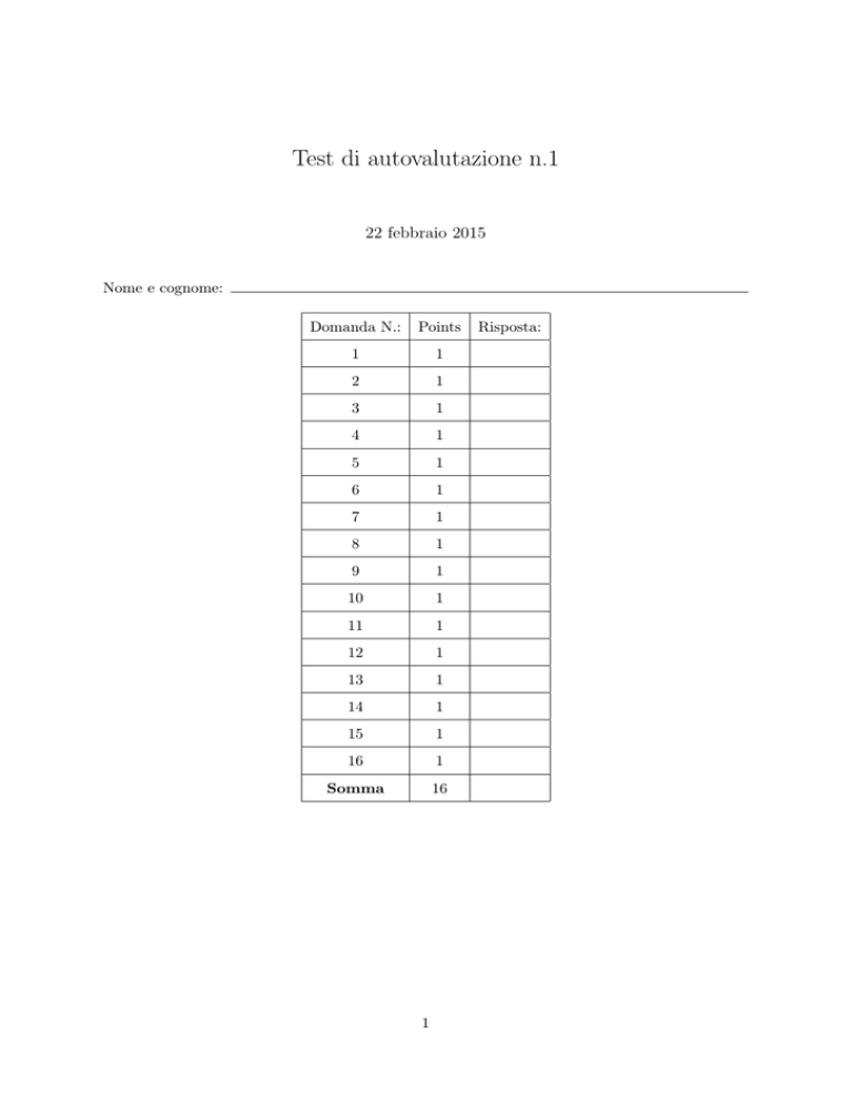 Test di autovalutazione n.1 22 febbraio 2015 Nome e cognome: Domanda N.: Points 1 1 2 1 3 1 4 1 5 1 6 1 7 1 8 1 9 1 10 1 11 1 12 1 13 1 14 1 15 1 16 1 Somma 16 1 Risposta: 2 DOMANDA n. 1 Il procedimento scientifico consiste nel/nella: A. Formulazione ipotesi - Esperimento - Conferma/Rifiuto ipotesi B. Raccolta informazioni - Esperimento - Formulazione ipotesi - Conferma/Rifiuto ipotesi C. Raccolta informazioni - Formulazione ipotesi - Esperimento - Conferma/Rifiuto ipotesi D. Raccolta informazioni - Formulazione ipotesi - Esperimento - Conferma/Rifiuto ipotesi DOMANDA n. 2 Abbiamo eseguito un’analisi chimica con tre repliche. I risultati sono 56, 59 e 54 ng/g. Utilizzando EXCEL, determinare media, deviazione standard e coefficiente di variabilità Scegliere una risposta. A. 56.33; 3.517; 5.467 B. 56.33; 2.517; 5.467 C. 56.33; 3.517; 4.467 D. 56.33; 2.517; 4.467 DOMANDA n. 3 Quali di queste affermazioni è vera? Scegliere una sola risposta. A. L’errore sperimentale può essere casuale e sistematico. La biostatistica ci consente di raggiungere conclusioni attendibili in presenza di entrambi i tipi di errore. B. L’errore sperimentale può essere casuale e sistematico. La biostatistica ci consente di raggiungere conclusioni attendibili in presenza dell’errore casuale, mentre l’errore sistematico deve essere evitato accuratamente. C. L’errore sperimentale può essere casuale e sistematico. La biostatistica ci consente di raggiungere conclusioni attendibili in presenza dell’errore sistematico, mentre l’errore casuale deve essere evitato accuratamente. DOMANDA n. 4 La differenza tra l’errore standard e la deviazione standard è che: A. L’errore standard rappresenta la variabilità sperimentale, mentre la deviazione standard rappresenta l’incertezza con cui stimo la media ’incognita’ della popolazione da cui ho estratto il campione B. La deviazione standard rappresenta la variabilità sperimentale, mentre l’errore standard rappresenta l’incertezza con cui stimo la media ’incognita’ della popolazione da cui ho estratto il campione C. La deviazione standard rappresenta la tendenza centrale di una popolazione, mentre l’errore standard rappresenta la sua variabilità . D. Nessuna. Sono la stessa cosa. DOMANDA n. 5 L’ipotesi nulla è che il trattamento sperimentale non ha avuto effetto. Il test d’ipotesi (test F) fornisce un p-level pari a 0.001. Ciò significa che: A. Il trattamento ha sicuramente avuto effetto significativo. Rifiuto l’ipotesi nulla. 3 B. Se l’ipotesi nulla fosse vera e ripetessi l’esperimento 1000 volte otterrei un risultato cosı̀ estremo o più estremo solo in un caso. E’ quindi estremamente improbabile che l’ipotesi nulla sia vera, allora la rifiuto. C. Se l’ipotesi nulla fosse vera e ripetessi l’esperimento 1000 volte non potrei mai ottenere un risultato cosı̀. E’ quindi impossibile che l’ipotesi nulla sia vera, allora la rifiuto D. Il trattamento non ha avuto nessun effetto significativo. Accetto l’ipotesi nulla. DOMANDA n. 6 L’intervallo di confidenza di una media si calcola aggiungendo e togliendo alla media una quantità pari al doppio (circa) dell’errore standard. Se l’intervallo di confidenza va da 13 a 18, significa che: A. C’è il 95% di probabilità che la media della popolazione da cui il campione è estratto è compresa tra 13 e 18 B. Se ripeto il campionamento (esperimento) 100 volte, in 95 circostanze l’intervallo di confidenza stimato conterrà la media vera della popolazione. C. La media della popolazione da cui il campione è estratto è compresa tra 13 e 18 D. La media può assumere qualunque valore tra 13 e 18 DOMANDA n. 7 Gli elementi fondamentali di un esperimento scientifico sono: A. Replicazione, randomizzazione e controllo locale degli errori B. Replicazione, randomizzazione e taratura degli strumenti C. Precisione, accuratezza e taratura degli strumenti D. Evitare di maneggiare l’attrezzatura con le mani sporche, seguire scrupolosamente il metodo di analisi DOMANDA n. 8 Quale di questi metodi non è correttamente finalizzato a minimizzare l’effetto bordo? A. Raccogliere solo la parte centrale di una parcella B. Circondare una prova sperimentale con un bordo coltivato con la stessa coltura C. Sistemare le parcelle in blocchi longitudinali DOMANDA n. 9 Eseguo un esperimento di concimazione per confrontare i concimi A, B, C e D. Con ogni concime tratto quattro parcelle, in modo indipendente. Da ogni parcella prelevo sei piante e le peso separatamente. Quante repliche ho? A. 24 repliche vere B. 4 repliche vere e 6 pseudo-repliche per replica C. 6 repliche vere e 4 pseudo-repliche per replica D. 24 pseudo-repliche DOMANDA n. 10 Qual è lo scopo di un esperimento a blocchi randomizzati? A. Rendere più facile l’esecuzione del trattamento sperimentale B. Diminuire l’errore sperimentale, suddividendo le unità sperimentali in gruppi omogenei e randomizzando i trattamenti entro i gruppi 4 C. Diminuire l’errore sperimentale, suddividendo le unità sperimentali in gruppi omogenei e somministrando un trattamento ad ogni gruppo DOMANDA n. 11 Ho effettuato un esperimento con tre varietà di frumento. La produzione media riscontrata è A=64 q/ha, B=61 q/ha, C=63 q/ha. La LSD è 2 q/ha. E’ vero che: A. A è significativamente migliore di B, ma non di C B. A è significativamente migliore di C, ma non di B C. A è significativamente migliore sia di B che di C D. C e B sono significativamente peggiori di A DOMANDA n. 12 In un esperimento con quattro repliche, dopo aver eseguito l’ANOVA, risulta che la varianza dell’errore sperimentale è pari a 25. Quanto è l’errore standard di una media? A. 254 B. 25/2 C. D. p √ 25/4 25/4 DOMANDA n. 13 Dovendo verificare l’assunzione di omogeneità delle varianze, noto che il p-level per il test di Bartlett è pari a 0.003. Cosa concludo? A. Non c’è problema, le varianze sono omogenee B. Le varianze non sono omogenee, ma non devo far nulla 