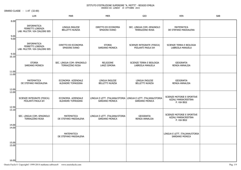 ISTITUTO D'ISTRUZIONE SUPERIORE "A. MOTTI" - REGGIO EMILIA ORARIO DA LUNEDI' 19 OTTOBRE 2015 ORARIO CLASSE - 1 AT (32:00) LUN MAR MER GIO VEN INFORMATICA FERRETTI LORENZA LAB. MULTIM. VIA CIALDINI 005 LINGUA INGLESE BELLETTI NUNZIA DIRITTO ED ECONOMIA SPADONI IVANO SEC. LINGUA COM.-SPAGNOLO TERRAZZINO ROSA MATEMATICA DE STEFANO MADDALENA INFORMATICA FERRETTI LORENZA LAB. MULTIM. VIA CIALDINI 005 DIRITTO ED ECONOMIA SPADONI IVANO STORIA SARDANO MONICA SCIENZE INTEGRATE (FISICA) PIOLANTI PAOLA 6H SCIENZE TERRA E BIOLOGIA LABRIOLA MANUELA STORIA SARDANO MONICA SEC. LINGUA COM.-SPAGNOLO TERRAZZINO ROSA RELIGIONE LANZI SIMONA SCIENZE TERRA E BIOLOGIA LABRIOLA MANUELA GEOGRAFIA RENGA ANNALISA MATEMATICA DE STEFANO MADDALENA ECONOMIA AZIENDALE ALEANDRI TOMASSINA LINGUA INGLESE BELLETTI NUNZIA LINGUA INGLESE BELLETTI NUNZIA GEOGRAFIA RENGA ANNALISA SCIENZE INTEGRATE (FISICA) PIOLANTI PAOLA 6H ECONOMIA AZIENDALE ALEANDRI TOMASSINA SEC. LINGUA COM.-SPAGNOLO TERRAZZINO ROSA MATEMATICA DE STEFANO MADDALENA SAB 8.00 9.00 9.00 9.50 10.10 11.00 11.00 12.00 12.00 LINGUA E LETT. ITALIANA/STORIA LINGUA E LETT. ITALIANA/STORIA SARDANO MONICA SARDANO MONICA SCIENZE MOTORIE E SPORTIVE AZZALI MARIACRISTINA P. VIA BIGI LINGUA E LETT. ITALIANA/STORIA SARDANO MONICA SCIENZE MOTORIE E SPORTIVE AZZALI MARIACRISTINA P. VIA BIGI 12.50 13.10 GEOGRAFIA RENGA ANNALISA 14.00 14.00 MATEMATICA DE STEFANO MADDALENA LINGUA E LETT. ITALIANA/STORIA SARDANO MONICA 15.00 15.00 16.00 Orario Facile 8 Copyright© 1999-2014 mathema software® www.orariofacile.com Pag. 1/9 ISTITUTO D'ISTRUZIONE SUPERIORE "A. MOTTI" - REGGIO EMILIA ORARIO DA LUNEDI' 19 OTTOBRE 2015 ORARIO CLASSE - 1 BT (32:00) LUN MAR MER GIO VEN MATEMATICA DE STEFANO MADDALENA DIRITTO ED ECONOMIA SPADONI IVANO ECONOMIA AZIENDALE ZANNI ALESSANDRA SCIENZE INTEGRATE (FISICA) PIOLANTI PAOLA 6H SCIENZE MOTORIE E SPORTIVE MORGANO MARIANNA P. VIA BIGI MATEMATICA DE STEFANO MADDALENA SCIENZE TERRA E BIOLOGIA LABRIOLA MANUELA DIRITTO ED ECONOMIA SPADONI IVANO GEOGRAFIA CORREGGIA ROSARIA SCIENZE MOTORIE E SPORTIVE MORGANO MARIANNA P. VIA BIGI LINGUA INGLESE BUFFAGNI ANNA GEOGRAFIA CORREGGIA ROSARIA SCIENZE INTEGRATE (FISICA) PIOLANTI PAOLA 6H RELIGIONE LANZI SIMONA STORIA SARDANO MONICA LINGUA E LETT. ITALIANA/STORIA SARDANO MONICA SCIENZE TERRA E BIOLOGIA LABRIOLA MANUELA INFORMATICA FERRETTI LORENZA LAB. MULTIM. VIA CIALDINI 005 ECONOMIA AZIENDALE ZANNI ALESSANDRA GEOGRAFIA CORREGGIA ROSARIA MATEMATICA DE STEFANO MADDALENA LINGUA INGLESE BUFFAGNI ANNA INFORMATICA FERRETTI LORENZA LAB. MULTIM. VIA CIALDINI 005 STORIA SARDANO MONICA SEC. LINGUA COM.-FRANCESE FRANCESE 9 ORE TEC SEC. LINGUA COM.-FRANCESE FRANCESE 9 ORE TEC LINGUA E LETT. ITALIANA/STORIA SARDANO MONICA SEC. LINGUA COM.-FRANCESE FRANCESE 9 ORE TEC LINGUA INGLESE BUFFAGNI ANNA SAB 8.00 9.00 9.00 9.50 10.10 LINGUA E LETT. ITALIANA/STORIA LINGUA E LETT. ITALIANA/STORIA SARDANO MONICA SARDANO MONICA MATEMATICA DE STEFANO MADDALENA 11.00 11.00 12.00 12.00 12.50 13.10 14.00 14.00 15.00 15.00 16.00 Orario Facile 8 Copyright© 1999-2014 mathema software® www.orariofacile.com Pag. 2/9 ISTITUTO D'ISTRUZIONE SUPERIORE "A. MOTTI" - REGGIO EMILIA ORARIO DA LUNEDI' 19 OTTOBRE 2015 ORARIO CLASSE - 1 CT (32:00) LUN MAR MER GIO VEN LINGUA INGLESE BUFFAGNI ANNA SCIENZE TERRA E BIOLOGIA LABRIOLA MANUELA DIRITTO ED ECONOMIA SAPUPPO CARMELO SCIENZE MOTORIE E SPORTIVE MORGANO MARIANNA P. VIA BIGI SCIENZE TERRA E BIOLOGIA LABRIOLA MANUELA GEOGRAFIA CORREGGIA ROSARIA GEOGRAFIA CORREGGIA ROSARIA MATEMATICA FRANZONI LAURA SCIENZE MOTORIE E SPORTIVE MORGANO MARIANNA P. VIA BIGI DIRITTO ED ECONOMIA SAPUPPO CARMELO INFORMATICA FERRETTI LORENZA LAB. MULTIM. VIA CIALDINI 005 MATEMATICA FRANZONI LAURA MATEMATICA FRANZONI LAURA SCIENZE INTEGRATE (FISICA) PIOLANTI PAOLA 6H LINGUA INGLESE BUFFAGNI ANNA INFORMATICA FERRETTI LORENZA LAB. MULTIM. VIA CIALDINI 005 SEC. LINGUA COM.-SPAGNOLO CAPPELLETTO KETTY LINGUA INGLESE BUFFAGNI ANNA MATEMATICA FRANZONI LAURA LINGUA E LETT. ITALIANA/STORIA POLIZZI ANTONELLA 6H SEC. LINGUA COM.-SPAGNOLO CAPPELLETTO KETTY GEOGRAFIA CORREGGIA ROSARIA RELIGIONE LANZI SIMONA STORIA POLIZZI ANTONELLA 6H SEC. LINGUA COM.-SPAGNOLO CAPPELLETTO KETTY SCIENZE INTEGRATE (FISICA) PIOLANTI PAOLA 6H ECONOMIA AZIENDALE LEONE GIUSEPPE MARIO SAB 8.00 9.00 9.00 9.50 10.10 11.00 11.00 12.00 12.00 12.50 13.10 LINGUA E LETT. ITALIANA/STORIA LINGUA E LETT. ITALIANA/STORIA LINGUA E LETT. ITALIANA/STORIA POLIZZI ANTONELLA 6H POLIZZI ANTONELLA 6H POLIZZI ANTONELLA 6H 14.00 14.00 ECONOMIA AZIENDALE LEONE GIUSEPPE MARIO STORIA POLIZZI ANTONELLA 6H 15.00 15.00 16.00 Orario Facile 8 Copyright© 1999-2014 mathema software® www.orariofacile.com Pag. 3/9 ISTITUTO D'ISTRUZIONE SUPERIORE "A. MOTTI" - REGGIO EMILIA ORARIO DA LUNEDI' 19 OTTOBRE 2015 ORARIO CLASSE - 2 AT (32:00) LUN MAR MER GIO VEN MATEMATICA FRANZONI LAURA INFORMATICA FERRETTI LORENZA LAB. MULTIM. VIA CIALDINI 005 LINGUA INGLESE BELLETTI NUNZIA LINGUA INGLESE BELLETTI NUNZIA INFORMATICA FERRETTI LORENZA LAB. MULTIM. VIA CIALDINI 005 RELIGIONE LANZI SIMONA SAB 8.00 ECONOMIA AZIENDALE ZANNI ALESSANDRA SEC. LING. COM.-FRANC./SPAGN. TERRAZZINO ROSA - FRANCESE 9 ORE TEC 2 BT 9.00 9.00 SCIENZE INTEGRATE (CHIMICA) LABRIOLA MANUELA SEC. LING. COM.-FRANC./SPAGN. TERRAZZINO ROSA - FRANCESE 9 ORE TEC 2 BT 9.50 10.10 SCIENZE TERRA E BIOLOGIA LABRIOLA MANUELA LINGUA INGLESE BELLETTI NUNZIA GEOGRAFIA CORREGGIA ROSARIA MATEMATICA FRANZONI LAURA GEOGRAFIA CORREGGIA ROSARIA GEOGRAFIA CORREGGIA ROSARIA LINGUA E LETT. ITALIANA/STORIA NARDI MICAELA DIRITTO ED ECONOMIA SAPUPPO CARMELO SCIENZE TERRA E BIOLOGIA LABRIOLA MANUELA STORIA NARDI MICAELA LINGUA E LETT. ITALIANA/STORIA NARDI MICAELA SCIENZE MOTORIE E SPORTIVE MORGANO MARIANNA P. VIA BIGI SCIENZE INTEGRATE (CHIMICA) LABRIOLA MANUELA MATEMATICA FRANZONI LAURA STORIA NARDI MICAELA SCIENZE MOTORIE E SPORTIVE MORGANO MARIANNA P. VIA BIGI LINGUA E LETT. ITALIANA/STORIA NARDI MICAELA ECONOMIA AZIENDALE ZANNI ALESSANDRA 11.00 11.00 12.00 12.00 SEC. LING.