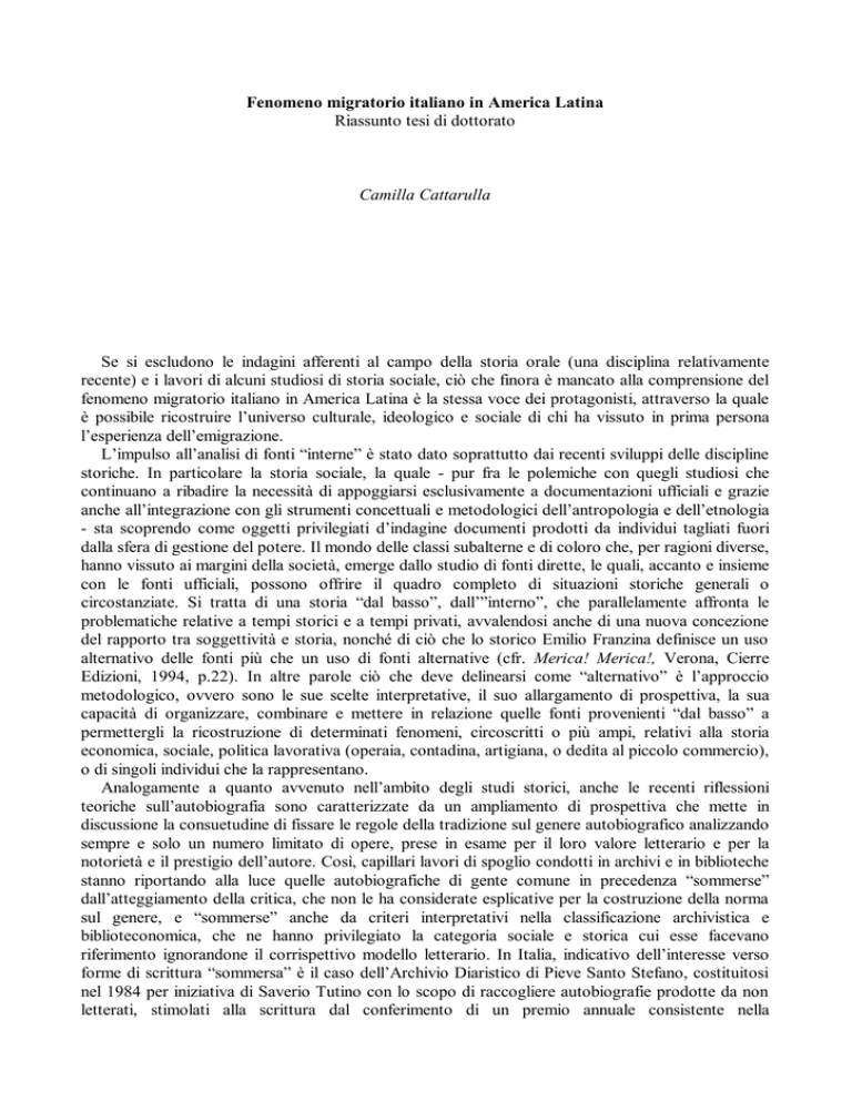 Fenomeno migratorio italiano in America Latina Riassunto tesi di dottorato Camilla Cattarulla Se si escludono le indagini afferenti al campo della storia orale (una disciplina relativamente recente) e i lavori di alcuni studiosi di storia sociale, ciò che finora è mancato alla comprensione del fenomeno migratorio italiano in America Latina è la stessa voce dei protagonisti, attraverso la quale è possibile ricostruire l’universo culturale, ideologico e sociale di chi ha vissuto in prima persona l’esperienza dell’emigrazione. L’impulso all’analisi di fonti “interne” è stato dato soprattutto dai recenti sviluppi delle discipline storiche. In particolare la storia sociale, la quale - pur fra le polemiche con quegli studiosi che continuano a ribadire la necessità di appoggiarsi esclusivamente a documentazioni ufficiali e grazie anche all’integrazione con gli strumenti concettuali e metodologici dell’antropologia e dell’etnologia - sta scoprendo come oggetti privilegiati d’indagine documenti prodotti da individui tagliati fuori dalla sfera di gestione del potere. Il mondo delle classi subalterne e di coloro che, per ragioni diverse, hanno vissuto ai margini della società, emerge dallo studio di fonti dirette, le quali, accanto e insieme con le fonti ufficiali, possono offrire il quadro completo di situazioni storiche generali o circostanziate. Si tratta di una storia “dal basso”, dall’”interno”, che parallelamente affronta le problematiche relative a tempi storici e a tempi privati, avvalendosi anche di una nuova concezione del rapporto tra soggettività e storia, nonché di ciò che lo storico Emilio Franzina definisce un uso alternativo delle fonti più che un uso di fonti alternative (cfr. Merica! Merica!, Verona, Cierre Edizioni, 1994, p.22). In altre parole ciò che deve delinearsi come “alternativo” è l’approccio metodologico, ovvero sono le sue scelte interpretative, il suo allargamento di prospettiva, la sua capacità di organizzare, combinare e mettere in relazione quelle fonti provenienti “dal basso” a permettergli la ricostruzione di determinati fenomeni, circoscritti o più ampi, relativi alla storia economica, sociale, politica lavorativa (operaia, contadina, artigiana, o dedita al piccolo commercio), o di singoli individui che la rappresentano. Analogamente a quanto avvenuto nell’ambito degli studi storici, anche le recenti riflessioni teoriche sull’autobiografia sono caratterizzate da un ampliamento di prospettiva che mette in discussione la consuetudine di fissare le regole della tradizione sul genere autobiografico analizzando sempre e solo un numero limitato di opere, prese in esame per il loro valore letterario e per la notorietà e il prestigio dell’autore. Così, capillari lavori di spoglio condotti in archivi e in biblioteche stanno riportando alla luce quelle autobiografiche di gente comune in precedenza “sommerse” dall’atteggiamento della critica, che non le ha considerate esplicative per la costruzione della norma sul genere, e “sommerse” anche da criteri interpretativi nella classificazione archivistica e biblioteconomica, che ne hanno privilegiato la categoria sociale e storica cui esse facevano riferimento ignorandone il corrispettivo modello letterario. In Italia, indicativo dell’interesse verso forme di scrittura “sommersa” è il caso dell’Archivio Diaristico di Pieve Santo Stefano, costituitosi nel 1984 per iniziativa di Saverio Tutino con lo scopo di raccogliere autobiografie prodotte da non letterati, stimolati alla scrittura dal conferimento di un premio annuale consistente nella pubblicazione della miglior opera pervenuta. Questa e altre iniziative fanno sì che testi finora esclusi dalla tradizione letteraria del genere autobiografico riemergano dal “silenzio” cui erano stati relegati da un “preconcetto” critico (estensibile per lungo tempo a tutte le forme espressive), che attribuiva solo ai rappresentanti di una cultura “alta” l’autorità di fornire modelli di scrittura per stabilire norme e marche convenzionali. Relativamente all’emigrazione italiana in Argentina e in Brasile, fra le fonti “interne” si possono senz’altro annoverare le autobiografie. Pubblicati fra il secondo e l’ultimo decennio del Novecento, i testi reperiti fanno nel loro insieme riferimento ad un periodo compreso fra la seconda metà dell’ottocento e i recenti anni ‘80. Gli autori, tutti emigranti di prima o al massimo di seconda generazione, sono rappresentativi di una immigrazione di tipo urbano, prevalente per l’Argentina, e di tipo extraurbano, per il Brasile. La loro provenienza spazia dal nord al sud dell’Italia: Liguria, Piemonte, Veneto, Abruzzo, Calabria, Sardegna, Puglia, Emilia, Campania, Trentino sono le regioni native degli autori, a testimonianza di come il fenomeno dell’emigrazione abbia coinvolto un po’ tutta la penisola italiana. E, infine, comune a quasi tutti gli autori è l’estrazione contadina che li colloca a pieno titolo in quella fascia sociale da cui in stragrande maggioranza proveniva il flusso migratorio diretto in America Latina. Un accenno va fatto anche alle modalità di pubblicazione. Alcune autobiografie (due, tra quelle riferite ad un’esperienza migratoria nel Brasile, rispettivamente di Orestes Bissoli e di Julio Lorenzoni) risultano edite molti anni dopo la loro stesura, un ritardo nella divulgazione che ha spesso caratterizzato la storia di testi autobiografici. Queste due autobiografie, alle quali si devono aggiungere quella di Luigi Ravina e quella dell’emigrato trentino Luigi, si distinguono anche per la presenza di un curatore che ne ha modificato la stesura originale con interventi di diverso peso. Nel caso dell’autobiografia di Bissoli, al testo portoghese, ripulito dagli errori ortografici, grammaticali e con la punteggiatura restaurata, è stato allegato nel volume il manoscritto dell’autore, il cui titolo originale era Brev