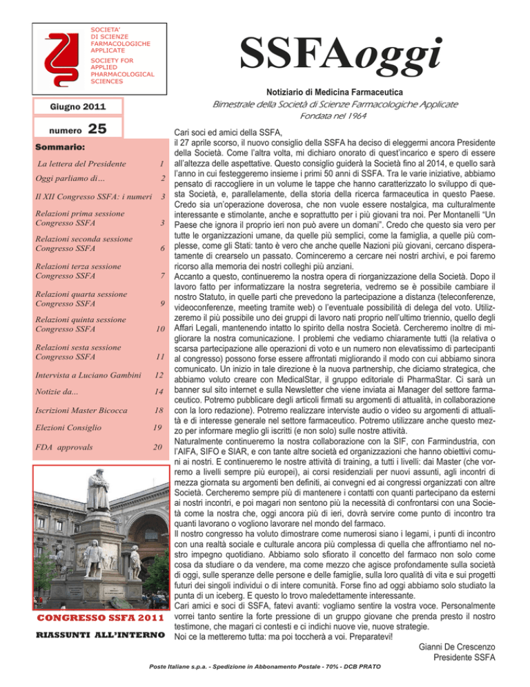 SOCIETA’ DI SCIENZE FARMACOLOGICHE APPLICATE SSFAoggi SOCIETY FOR APPLIED PHARMACOLOGICAL SCIENCES Notiziario di Medicina Farmaceutica Bimestrale della Società di Scienze Farmacologiche Applicate Giugno 2011 Fondata nel 1964 numero 25 Sommario: La lettera del Presidente 1 Oggi parliamo di… 2 Il XII Congresso SSFA: i numeri 3 Relazioni prima sessione Congresso SSFA 3 Relazioni seconda sessione Congresso SSFA 6 Relazioni terza sessione Congresso SSFA 7 Relazioni quarta sessione Congresso SSFA 9 Relazioni quinta sessione Congresso SSFA 10 Relazioni sesta sessione Congresso SSFA 11 Intervista a Luciano Gambini 12 Notizie da... 14 Iscrizioni Master Bicocca 18 Elezioni Consiglio 19 FDA approvals 20 CONGRESSO SSFA 2011 RIASSUNTI ALL’INTERNO Cari soci ed amici della SSFA, il 27 aprile scorso, il nuovo consiglio della SSFA ha deciso di eleggermi ancora Presidente della Società. Come l’altra volta, mi dichiaro onorato di quest’incarico e spero di essere all’altezza delle aspettative. Questo consiglio guiderà la Società fino al 2014, e quello sarà l’anno in cui festeggeremo insieme i primi 50 anni di SSFA. Tra le varie iniziative, abbiamo pensato di raccogliere in un volume le tappe che hanno caratterizzato lo sviluppo di questa Società, e, parallelamente, della storia della ricerca farmaceutica in questo Paese. Credo sia un’operazione doverosa, che non vuole essere nostalgica, ma culturalmente interessante e stimolante, anche e soprattutto per i più giovani tra noi. Per Montanelli “Un Paese che ignora il proprio ieri non può avere un domani”. Credo che questo sia vero per tutte le organizzazioni umane, da quelle più semplici, come la famiglia, a quelle più complesse, come gli Stati: tanto è vero che anche quelle Nazioni più giovani, cercano disperatamente di crearselo un passato. Cominceremo a cercare nei nostri archivi, e poi faremo ricorso alla memoria dei nostri colleghi più anziani. Accanto a questo, continueremo la nostra opera di riorganizzazione della Società. Dopo il lavoro fatto per informatizzare la nostra segreteria, vedremo se è possibile cambiare il nostro Statuto, in quelle parti che prevedono la partecipazione a distanza (teleconferenze, videoconferenze, meeting tramite web) o l’eventuale possibilità di delega del voto. Utilizzeremo il più possibile uno dei gruppi di lavoro nati proprio nell’ultimo triennio, quello degli Affari Legali, mantenendo intatto lo spirito della nostra Società. Cercheremo inoltre di migliorare la nostra comunicazione. I problemi che vediamo chiaramente tutti (la relativa o scarsa partecipazione alle operazioni di voto e un numero non elevatissimo di partecipanti al congresso) possono forse essere affrontati migliorando il modo con cui abbiamo sinora comunicato. Un inizio in tale direzione è la nuova partnership, che diciamo strategica, che abbiamo voluto creare con MedicalStar, il gruppo editoriale di PharmaStar. Ci sarà un banner sul sito internet e sulla Newsletter che viene inviata ai Manager del settore farmaceutico. Potremo pubblicare degli articoli firmati su argomenti di attualità, in collaborazione con la loro redazione). Potremo realizzare interviste audio o video su argomenti di attualità e di interesse generale nel settore farmaceutico. Potremo utilizzare anche questo mezzo per informare meglio gli iscritti (e non solo) sulle nostre attività. Naturalmente continueremo la nostra collaborazione con la SIF, con Farmindustria, con l’AIFA, SIFO e SIAR, e con tante altre società ed organizzazioni che hanno obiettivi comuni ai nostri. E continueremo le nostre attività di training, a tutti i livelli: dai Master (che vorremo a livelli sempre più europei), ai corsi residenziali per nuovi assunti, agli incontri di mezza giornata su argomenti ben definiti, ai convegni ed ai congressi organizzati con altre Società. Cercheremo sempre più di mantenere i contatti con quanti partecipano da esterni ai nostri incontri, e poi magari non sentono più la necessità di confrontarsi con una Società come la nostra che, oggi ancora più di ieri, dovrà servire come punto di incontro tra quanti lavorano o vogliono lavorare nel mondo del farmaco. Il nostro congresso ha voluto dimostrare come numerosi siano i legami, i punti di incontro con una realtà sociale e culturale ancora più complessa di quella che affrontiamo nel nostro impegno quotidiano. Abbiamo solo sfiorato il concetto del farmaco non solo come cosa da studiare o da vendere, ma come mezzo che agisce profondamente sulla società di oggi, sulle speranze delle persone e delle famiglie, sulla loro qualità di vita e sui progetti futuri dei singoli individui o di intere comunità. Forse fino ad oggi abbiamo solo studiato la punta di un iceberg. E questo lo trovo maledettamente interessante. Cari amici e soci di SSFA, fatevi avanti: vogliamo sentire la vostra voce. Personalmente vorrei tanto sentire la forte pressione di un gruppo giovane che prenda presto il nostro testimone, che magari ci contesti e ci indichi nuove vie, nuove strategie. Noi ce la metteremo tutta: ma poi toccherà a voi. Preparatevi! Gianni De Crescenzo Presidente SSFA Poste Italiane s.p.a. - Spedizione in Abbonamento Postale - 70% - DCB PRATO Anno V numero 25 Pagina 2 Oggi parliamo di….. I biomarker nell’imaging oncologico (parte 1) L’ultimo decennio ha visto importanti scoperte nella ricerca sul cancro, in particolare nel campo delle tecnologie di imaging (diagnostica per immagini). L’identificazione di nuovi bersagli, sui quali un gran numero di prodotti è testato in vitro, sta portando all’individuazione di nuove molecole attive. Tuttavia, questi composti mostrano molti dei limiti propri dei processi di R&D degli antitumorali convenzionali, ereditati dallo sviluppo di molecole citotossiche. Lo sviluppo di un farmaco innovativo è un processo molto costoso (circa un miliardo di dollari), che richiede tempi lunghi (8-12 anni). Per fare scelte appropriate su un candidato antitumoral