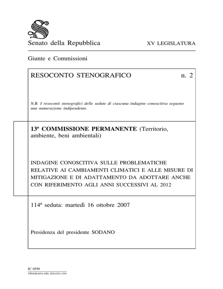 Senato della Repubblica XV LEGISLATURA Giunte e Commissioni RESOCONTO STENOGRAFICO n. 2 N.B. I resoconti stenografici delle sedute di ciascuna indagine conoscitiva seguono una numerazione indipendente. 13ª COMMISSIONE PERMANENTE (Territorio, ambiente, beni ambientali) INDAGINE CONOSCITIVA SULLE PROBLEMATICHE RELATIVE AI CAMBIAMENTI CLIMATICI E ALLE MISURE DI MITIGAZIONE E DI ADATTAMENTO DA ADOTTARE ANCHE CON RIFERIMENTO AGLI ANNI SUCCESSIVI AL 2012 114ª seduta: martedı̀ 16 ottobre 2007 Presidenza del presidente SODANO IC 0599 TIPOGRAFIA DEL SENATO (255) Senato della Repubblica – 2 – XV Legislatura 2º Res. Sten. (16 ottobre 2007) 13ª Commissione INDICE Audizione del Presidente della Società meteorologica italiana PRESIDENTE . . . . . . . . . . .Pag. . . . 3, . .5,. .18. . e. .passim * BELLINI (SDSE) . . . . . . . . . . . . . . . . . . . . 19 SCOTTI (FI) . . . . . . . . . . . . . . . . . . . . . . . 18, 20 * MERCALLI . . . . . . . . . . . . .Pag. . . . 3, . .5,. .18. . e. .passim N.B. L’asterisco accanto al nome riportato nell’indice della seduta indica che gli interventi sono stati rivisti dagli oratori. Sigle dei Gruppi parlamentari: Alleanza Nazionale: AN; Democrazia Cristiana per le autonomie-Partito Repubblicano Italiano-Movimento per l’Autonomia: DCA-PRI-MPA; Forza Italia: FI; Insieme con l’Unione Verdi-Comunisti Italiani: IU-Verdi-Com; Lega Nord Padania: LNP; L’Ulivo: Ulivo; Per le Autonomie: Aut; Rifondazione Comunista-Sinistra Europea: RC-SE; Sinistra Democratica per il Socialismo Europeo: SDSE; Unione dei Democraticicristiani e di Centro (UDC): UDC; Misto: Misto; Misto-Costituente Socialista: MistoCS; Misto-Italia dei Valori: Misto-IdV; Misto-Italiani nel mondo: Misto-Inm; Misto-La Destra: Misto-LD; Misto-Movimento politico dei cittadini: Misto-Mpc; Misto-Partito Democratico Meridionale (PDM): MistoPDM; Misto-Popolari-Udeur: Misto-Pop-Udeur; Misto-Sinistra Critica: Misto-SC. Senato della Repubblica – 3 – 13ª Commissione XV Legislatura 2º Res. Sten. (16 ottobre 2007) Interviene il professor Luca Mercalli, presidente della Società meteorologica italiana. I lavori hanno inizio alle ore 15,40. PROCEDURE INFORMATIVE Audizione del Presidente della Società meteorologica italiana PRESIDENTE. L’ordine del giorno reca il seguito dell’indagine conoscitiva sulle problematiche relative ai cambiamenti climatici e alle misure di mitigazione e di adattamento da adottare anche con riferimento agli anni successivi al 2012, sospesa nella seduta di martedı̀ 25 settembre. Comunico che, ai sensi dell’articolo 33, comma 4, del Regolamento, è stata chiesta l’attivazione dell’impianto audiovisivo e che la Presidenza del Senato ha già preventivamente fatto conoscere il proprio assenso. Se non si fanno osservazioni, tale forma di pubblicità è dunque adottata per il prosieguo dei lavori. Abbiamo iniziato questo lavoro di indagine a novembre del 2006. Siamo arrivati, anche grazie al contributo di questa Commissione del Senato, alla Conferenza sul clima che si è tenuta nello scorso mese di settembre. Abbiamo ritenuto di proseguire l’attività conoscitiva anche all’indomani della Conferenza sul clima per gli impegni che il nostro Paese dovrà assumere, a cominciare dal prossimo appuntamento di Bali nel dicembre di questo anno. Approfitterei della presenza del senatore Scotti per cominciare a discutere di una delegazione per la Conferenza internazionale di Bali, che ci sollecita anche la Presidenza del Senato. Data la condizione numerica del Senato, è del tutto evidente che la partecipazione può essere determinata in base a un gentlemen’s agreement anche con l’opposizione, al fine di avere una composizione della delegazione paritaria. È oggi prevista l’audizione del Presidente dalla Società meteorologica italiana, al quale cedo la parola. Il professor Mercalli si avvarrà della presentazione di alcune slide e della proiezione di un brevissimo filmato che non è stato possibile vedere durante la Conferenza sul clima per motivi di orari e di sovrapposizione dei relatori partecipanti. MERCALLI. Signor Presidente, le sono particolarmente grato per questo invito che ovviamente mi onora e mi permette anche di dare, spero, un modesto contributo al futuro del nostro Paese. Cercherò di spiegarvi, da un punto di vista forse meno convenzionale del solito, qual è lo stato dell’arte dei problemi relativi al cambiamento Senato della Repubblica 13ª Commissione – 4 – XV Legislatura 2º Res. Sten. (16 ottobre 2007) climatico. Assolverò a questo compito prima di tutto in qualità di Presidente della società meteorologica italiana, che è una struttura indipendente e un’associazione scientifica nata nel 1865. Essa fu fondata da padre Francesco Denza, che era allora direttore del Real Collegio Carlo Alberto di Moncalieri, e poi divenne direttore della Specola vaticana a Roma, dove morı̀ nel 1894. La nostra struttura oggi è un’organizzazione non lucrativa di utilità sociale; la sua missione è semplicemente quella di diffondere la cultura meteorologica e fare anche un po’ di ricerca, al di fuori dell’ambiente istituzionale, dell’accademia o degli istituti di ricerca governativi. In sostanza, si tratta di un’organizzazione indipendente che possiamo definire di diritto privato e autofinanziata, all’interno della quale mi occupo di ricerca soprattutto relativa ai climi del passato. Oggi riuscirò a illustrarvi con una certa precisione soprattutto lo stato dell’arte della ricostruzione dei climi del passato, mentre per il clima del futuro mi limiterò sostanzialmente a inquadrarlo negli argomenti che conoscete benissimo perché sono le classiche conclusioni dell’Intergovernmental Panel on Climate Change (IPCC). Non sono un modellista, ma un climatologo, o meglio, un paleoclimatologo che si occupa dei climi antichi fino a quelli di qualche giorno fa, non più paleo dunque, ma, in ogni caso, non mi occupo della previsione del clima futuro. A tito