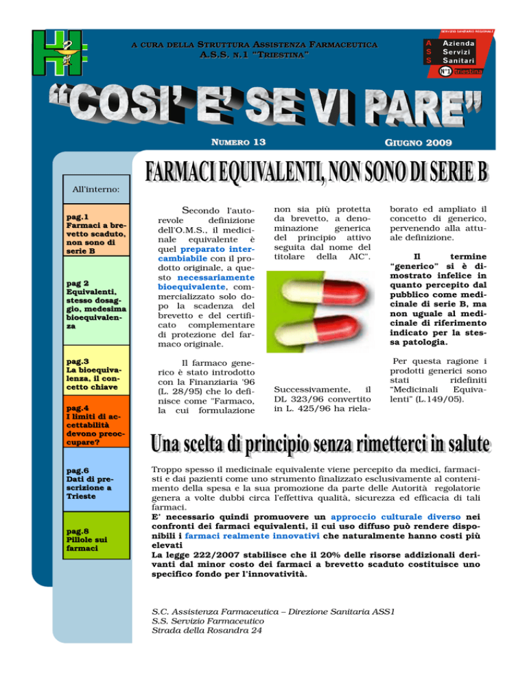 A CURA DELLA STRUTTURA ASSISTENZA FARMACEUTICA A.S.S. N.1 “TRIESTINA” NUMERO 13 GIUGNO 2009 All’interno: pag.1 Farmaci a brevetto scaduto, non sono di serie B pag 2 Equivalenti, stesso dosaggio, medesima bioequivalenza pag.3 La bioequivalenza, il concetto chiave pag.4 I limiti di accettabilità devono preoccupare? pag.6 Dati di prescrizione a Trieste pag.8 Pillole sui farmaci Secondo l'autorevole definizione dell'O.M.S., il medicinale equivalente è quel preparato intercambiabile con il prodotto originale, a questo necessariamente bioequivalente, commercializzato solo dopo la scadenza del brevetto e del certificato complementare di protezione del farmaco originale. Il farmaco generico è stato introdotto con la Finanziaria '96 (L. 28/95) che lo definisce come "Farmaco, la cui formulazione non sia più protetta da brevetto, a denominazione generica del principio attivo seguita dal nome del titolare della AIC". Successivamente, il DL 323/96 convertito in L. 425/96 ha riela- borato ed ampliato il concetto di generico, pervenendo alla attuale definizione. Il termine “generico” si è dimostrato infelice in quanto percepito dal pubblico come medicinale di serie B, ma non uguale al medicinale di riferimento indicato per la stessa patologia. Per questa ragione i prodotti generici sono stati ridefiniti “Medicinali Equivalenti” (L.149/05). Troppo spesso il medicinale equivalente viene percepito da medici, farmacisti e dai pazienti come uno strumento finalizzato esclusivamente al contenimento della spesa e la sua promozione da parte delle Autorità regolatorie genera a volte dubbi circa l’effettiva qualità, sicurezza ed efficacia di tali farmaci. E’ necessario quindi promuovere un approccio culturale diverso nei confronti dei farmaci equivalenti, il cui uso diffuso può rendere disponibili i farmaci realmente innovativi che naturalmente hanno costi più elevati La legge 222/2007 stabilisce che il 20% delle risorse addizionali derivanti dal minor costo dei farmaci a brevetto scaduto costituisce uno specifico fondo per l’innovatività. S.C. Assistenza Farmaceutica – Direzione Sanitaria ASS1 S.S. Servizio Farmaceutico Strada della Rosandra 24 PAGINA 2 “I principi attivi di cui è disponibile l’equivalente sono molecole che, dopo una lunga presenza sul mercato, hanno dimostrato notevole efficacia ed affidabilità terapeutica.” L’equivalente può essere definito farmaco intercambiabile con il farmaco originatore, essendo composto dallo stesso principio attivo, dalla stessa formulazione farmaceutica, dallo stesso dosaggio e dalla medesima bioequivalenza, in quanto induce gli stessi effetti terapeutici con lo stesso profilo di tollerabilità e sicurezza. I principi attivi di cui è disponibile il generico sono molecole che, dopo una lunga presenza sul mercato, hanno dimostrato notevole efficacia ed affidabilità terapeutica. Allo scadere del loro brevetto, è possibile produrli in regime di libera concorrenza, quindi a prezzi più convenienti; la legislazione impone al generico un prezzo inferiore almeno del 20% rispetto alla specialità registrata: il farmaco equivalente rappresenta una terapia consolidata e per di più al minor costo possibile. Tale riduzione del prezzo del generico non grava sulla qualità di controllo e di produzione del medicinale, ma piuttosto sui costi del marketing e della promozione, costi che non comprendono le spese di ricerca e sviluppo. La valutazione positiva pertinente o relativa alla garanzia della qualità del farmaco generico è il risultato, del rispetto delle procedure adottate per la produzione e il controllo di qualità imposti dalle autorità regolatorie, che impongono al produttore i principi e le linee guida delle Norme di Buona Fabbricazione: sia ai brands (specialità medicinali di marca) sia ai generici sono richiesti gli stessi standard di qualità, quindi non è ammessa nessuna variabilità nel contenuto del principio attivo in essi contenuto se non entro i limiti di legge e comunque uguale a quello delle specialità. I procedimenti adottati per la produzione e il controllo di qualità del farmaco equivalente devono rispettare tutti i principi e le linee guida delle Norme di Buona Fabbricazione, ragion per cui il farmaco equivalente è formalmente un prodotto con le stesse garanzie di qualità della corrispondente specialità: questo vale per le materie prime, per i principi attivi, per gli eccipienti, per i processi produttivi industriali, per i controlli di qualità e per le condizioni di stoccaggio. Inoltre si mette in evidenza il fatto che le autorizzazioni per i farmaci “griffati” sono state concesse venti o più anni orsono, mentre le autorizzazioni per i generici sono recenti, cioè sono state concesse in un contesto normativo attuale (diverso e sicuramente più severo in quanto concesse nell’ambito della Comunità Europea), sicchè molte specialità medicinali sono registrate in Italia per “mutuo riconoscimento” attraverso l’EMEA. CHI GARANTISCE? Il Ministero autorizza la commercializzazione del farmaco equivalente solo dopo aver verificato che il farmaco brevettato con nome di fantasia e quello generico non indurranno differenze quanto a risultato terapeutico ed effetti-collaterali. Il DL 323/96 stabilisce infatti che l'immissione in commercio dei generici viene autorizzata dal Min. San., sulla base di una documentazione che attesti la bioequivalenza rispetto ad una specialità medicinale già autorizzata con la stessa composizione quali-quantitativa dei principi attivi. NUMERO 13 PAGINA 3 E’ necessario a questo punto chiarire che cosa si intende per equivalenza farmaceutica e per bioequivalenza. Due prodotti sono equivalenti farmaceutici se contengono la stessa quantità di principio attivo, hanno la stessa forma farmaceutica (anche con eccipienti diversi), posseggono standard di qualità identici o comparabili e sono somministrati attraverso la stessa via di somministrazione. L’equivalenza farmaceutica